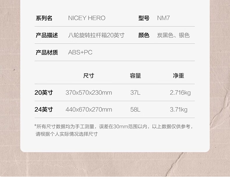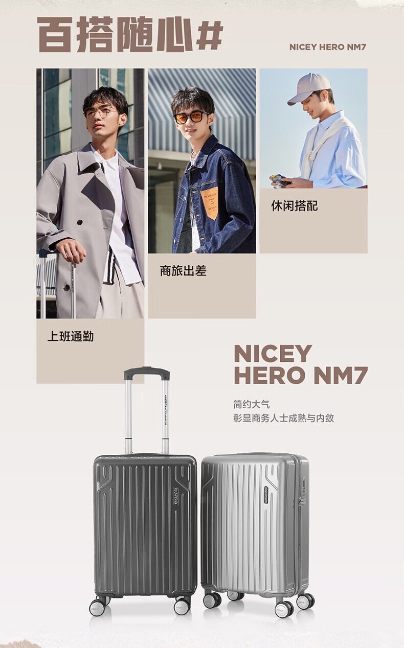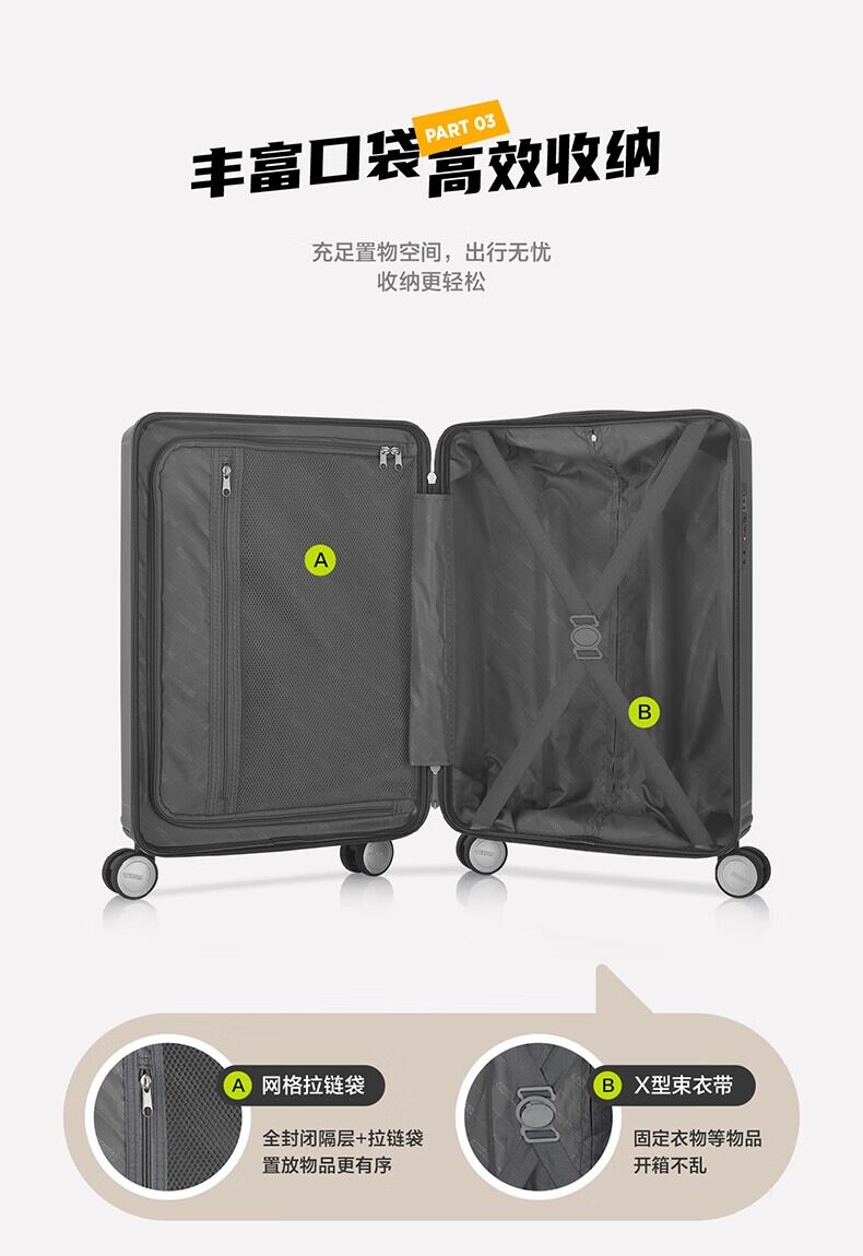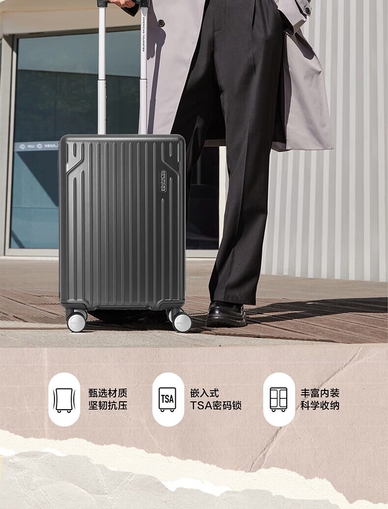 简约条纹设计,呈现金属光泽且防刮耐磨;ABS+PC复合材质搭配磨砂工艺,坚韧抗压;小圆角造型,贴合箱内轮廓,容纳更多的物品