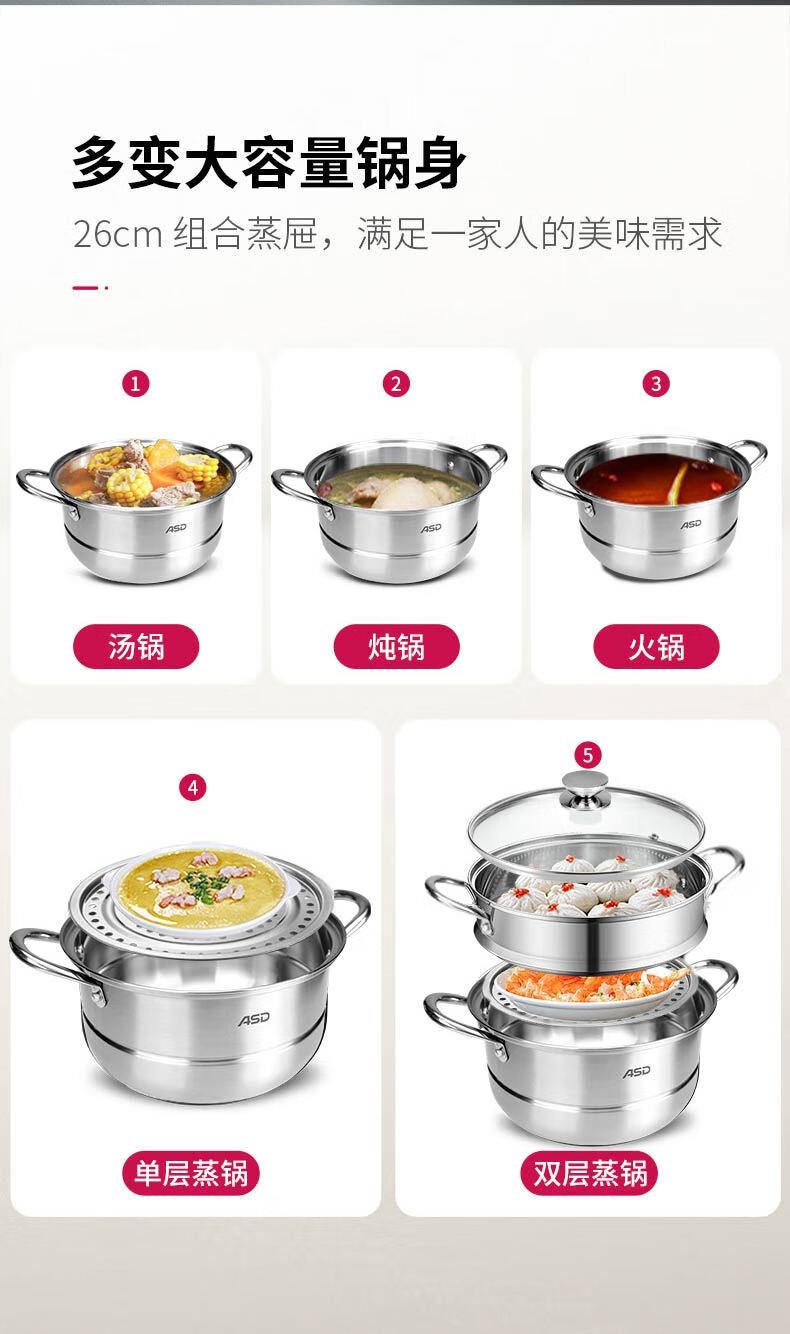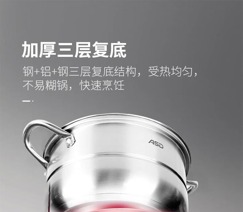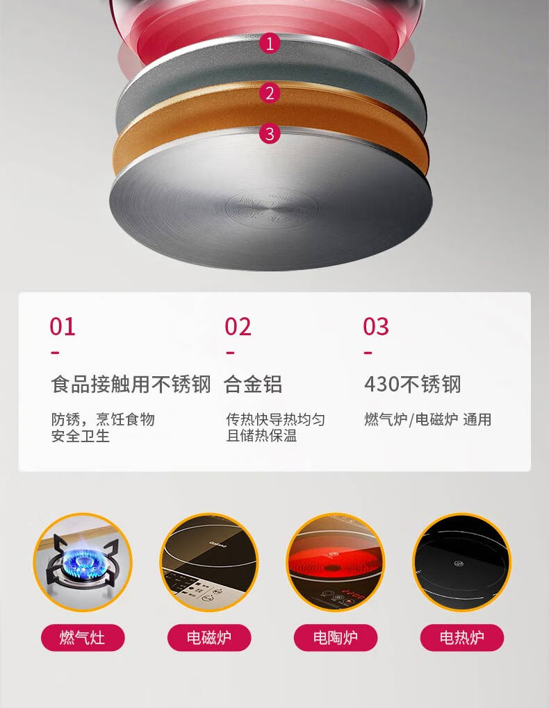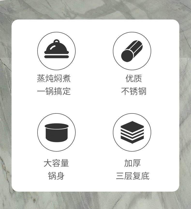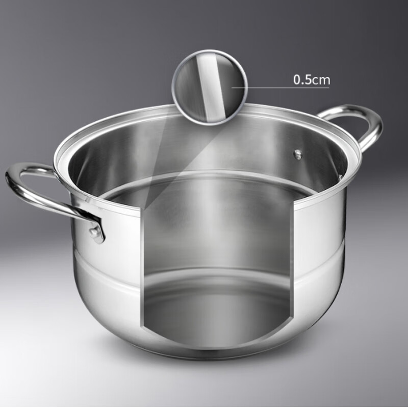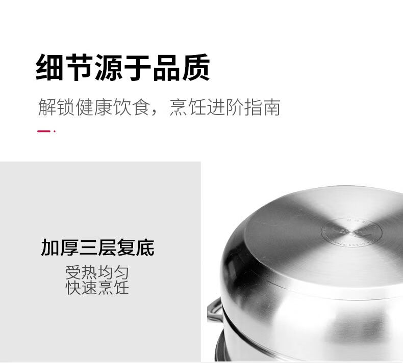 高硼硅可视玻璃盖,烹饪清晰可见;阶梯式内置蒸格,易收纳不占地;蒸煮两用,蒸煮同步做;三层复合底,适合多种加热方式;全钢手柄,坚固耐用