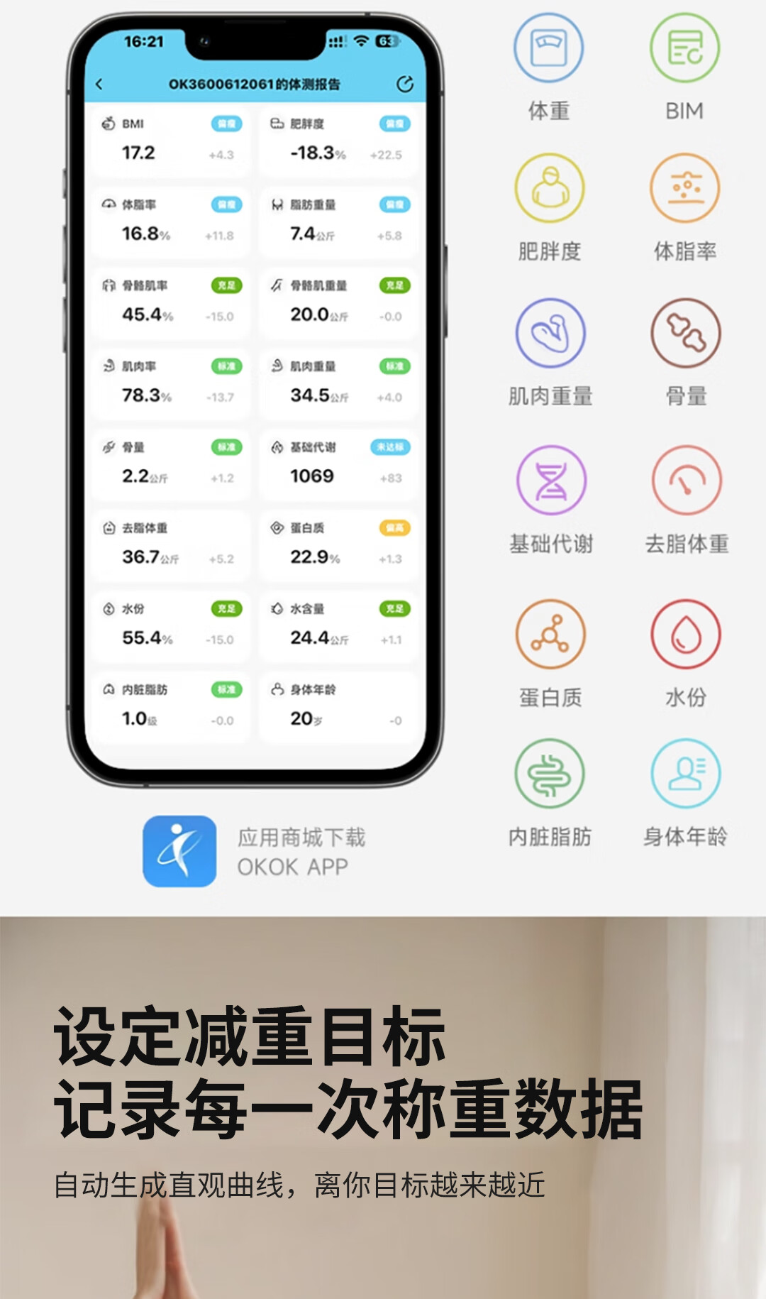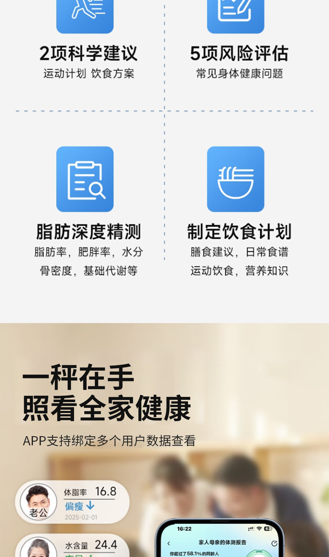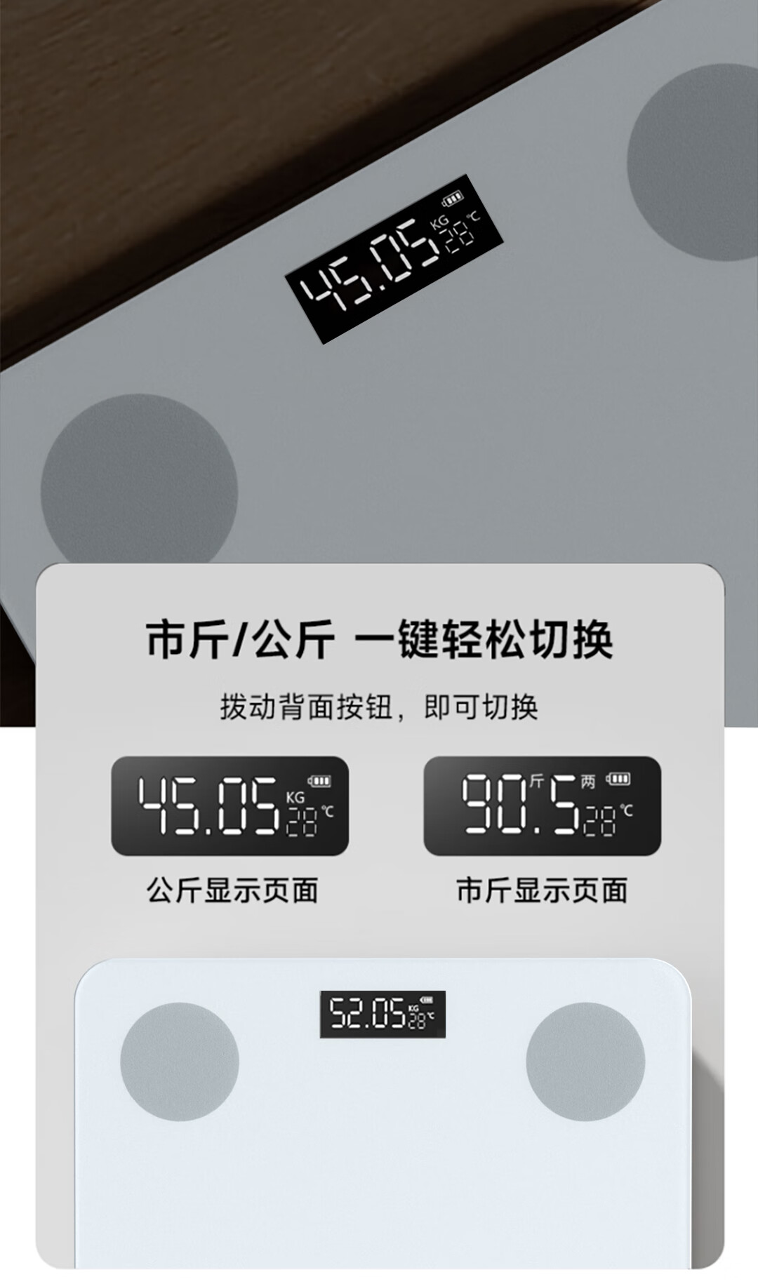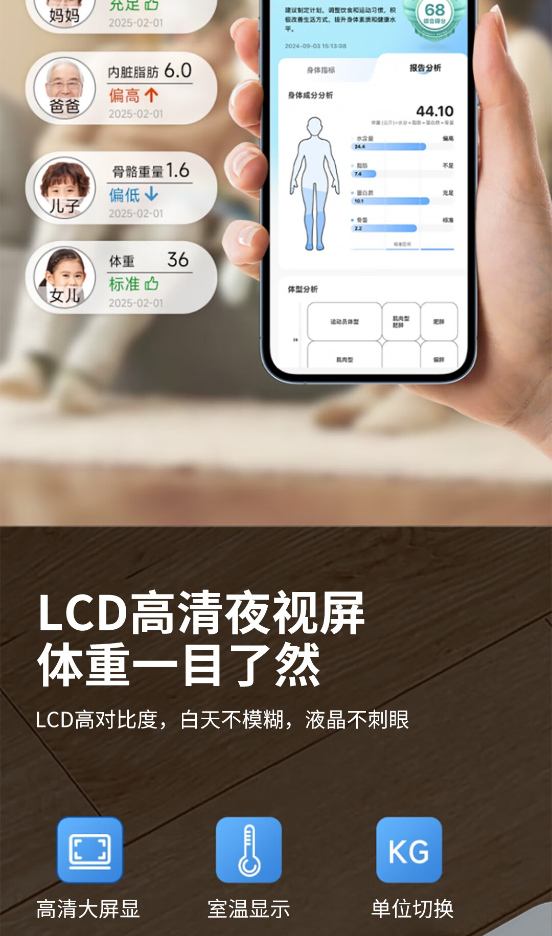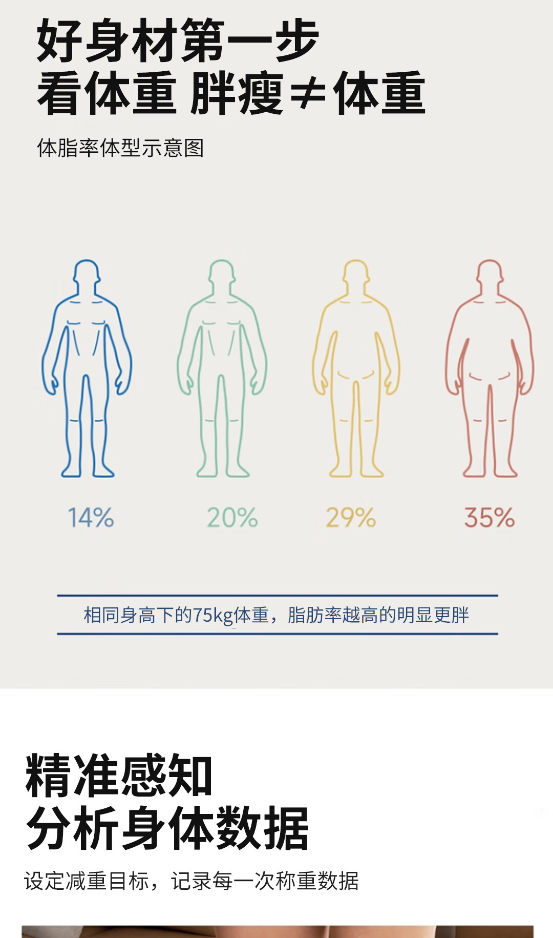 0.05KG精准度区分一杯水差异;上秤5秒即可分析身体数据;能APP云端查看 同步健康数据