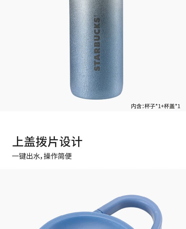 渐变质感漆搭配激光雕刻logo,彰显高端气质;不锈钢真空工艺,锁温更持久;顶部上盖拨片设计,一键出水,操作简便