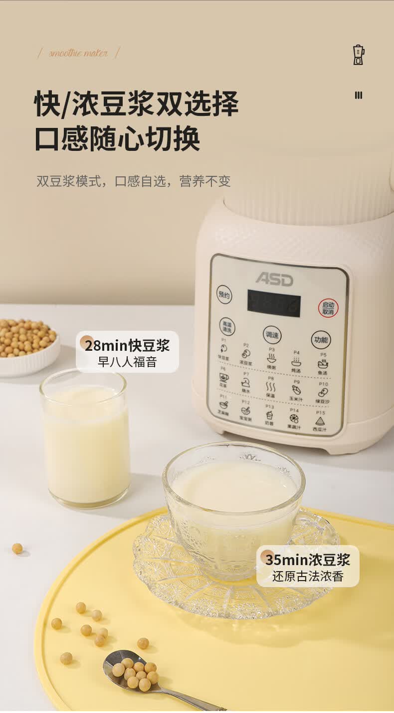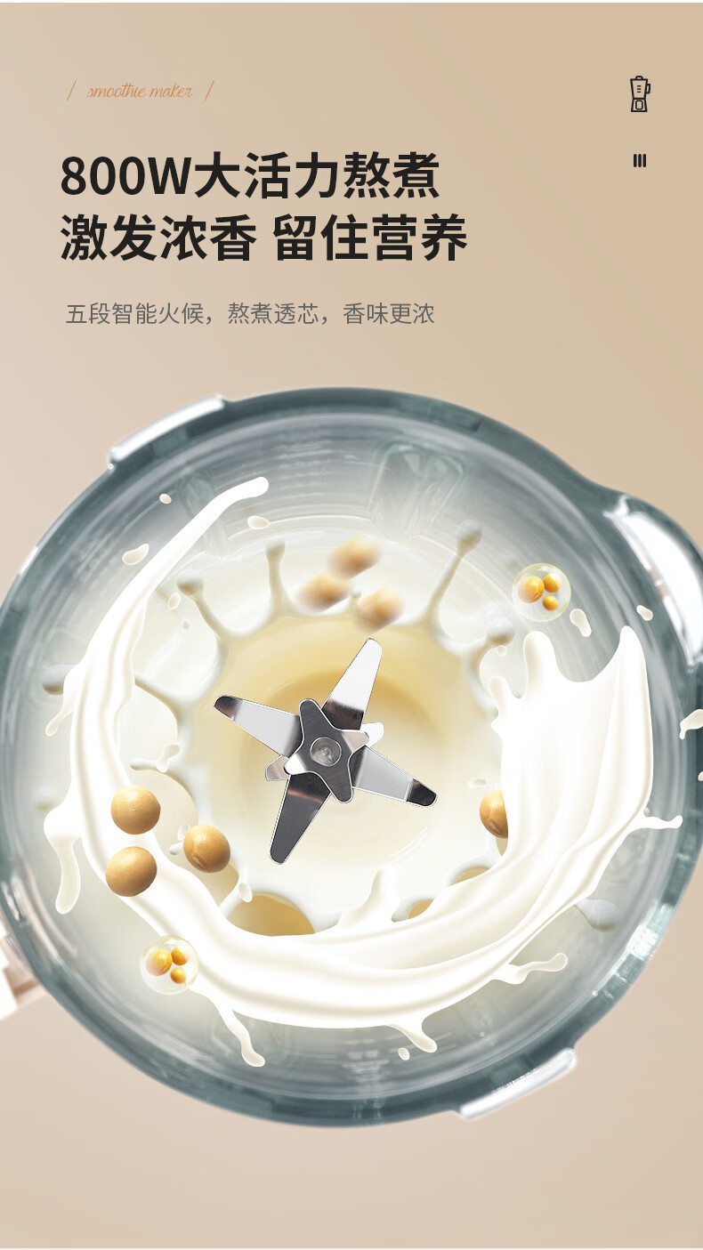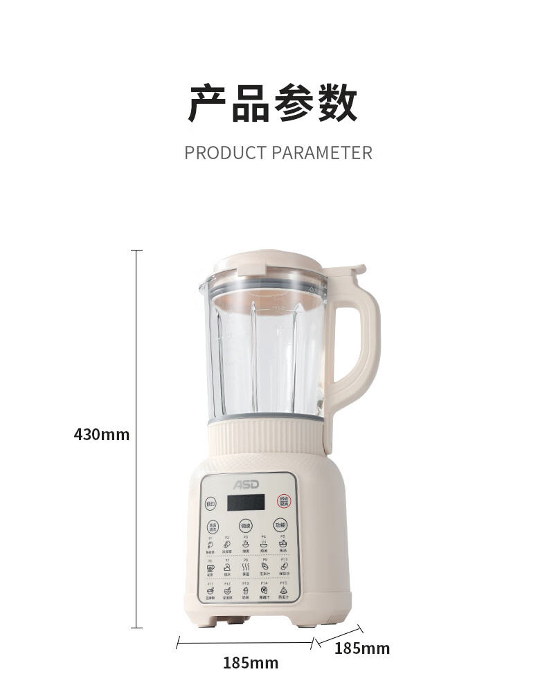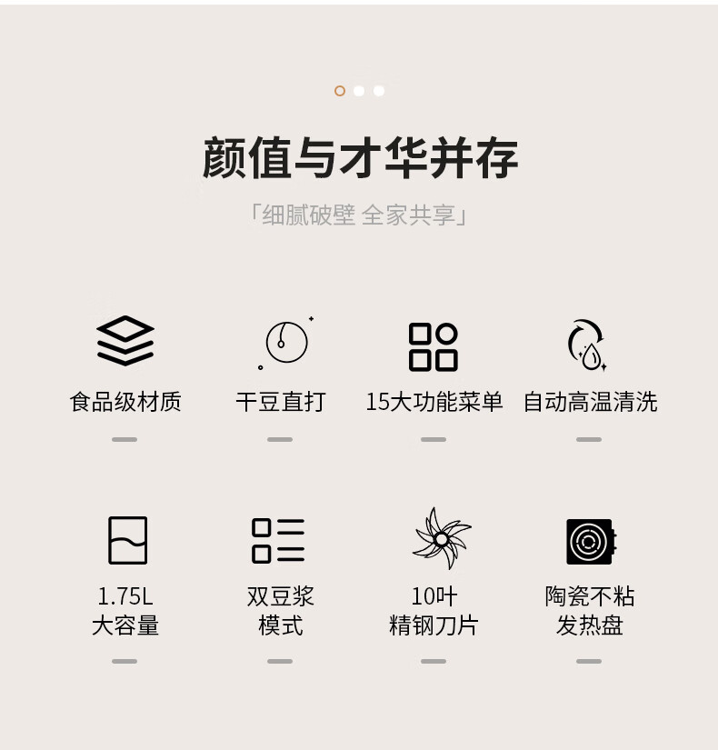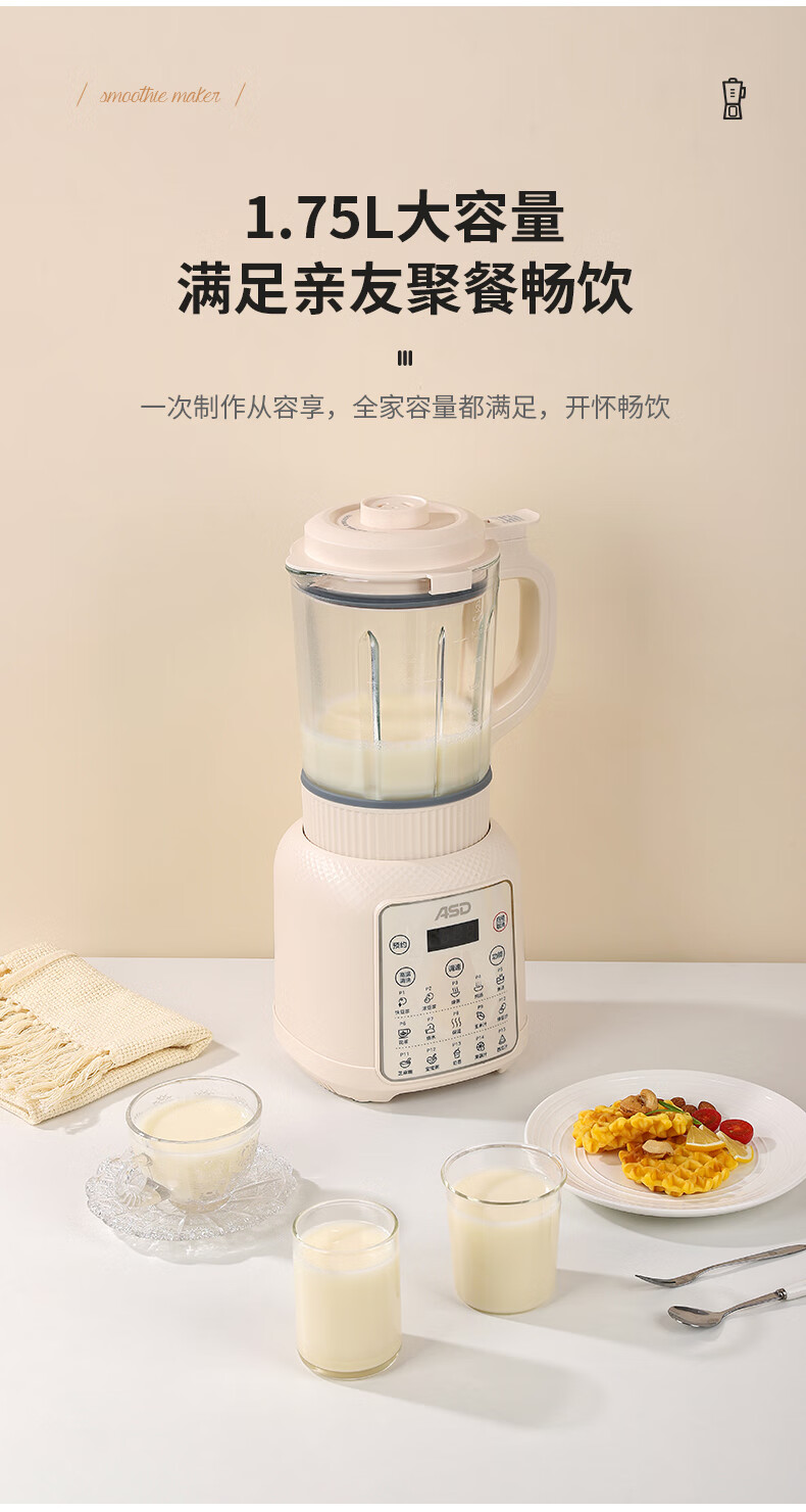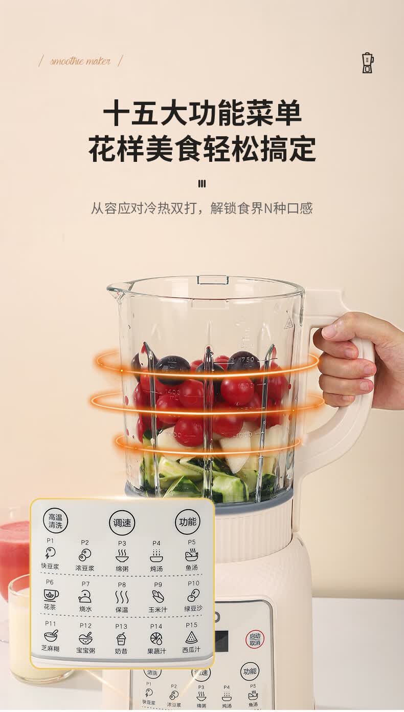 触控式操作面板,简单方便一键即可;;10叶钢刀,无渣免滤;;预约定时,长效保温;;15大功能菜单,1.75L大容量,全家满足;;安全保护,放心使用;