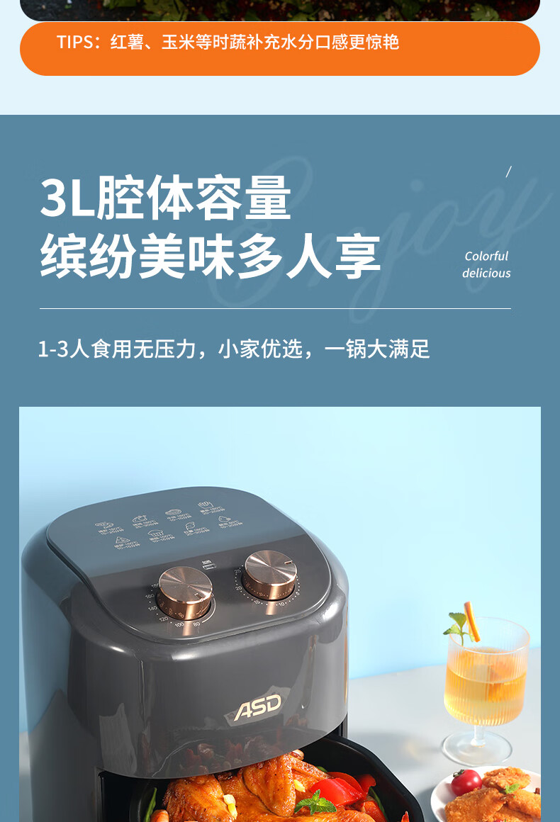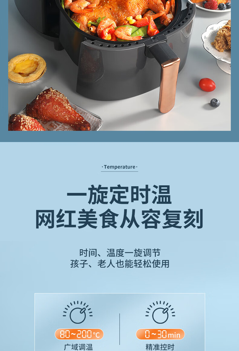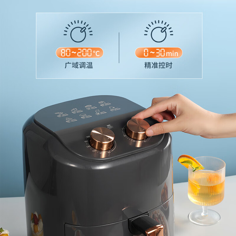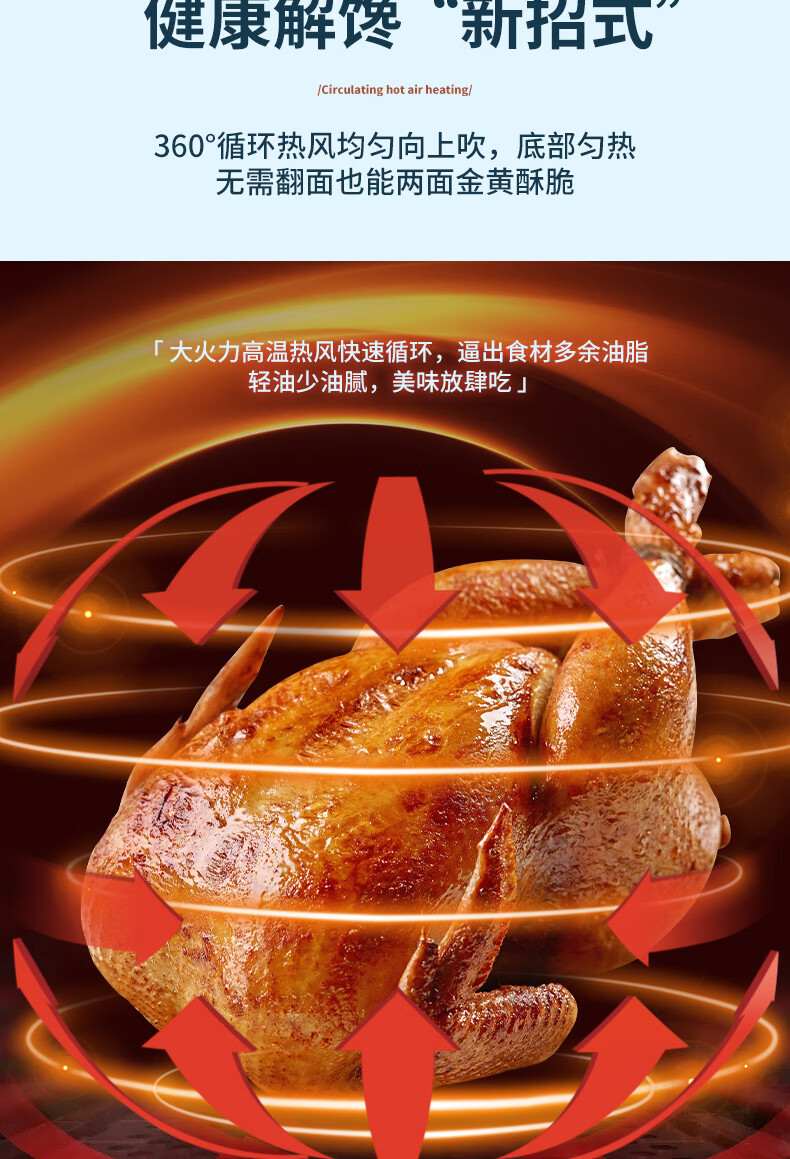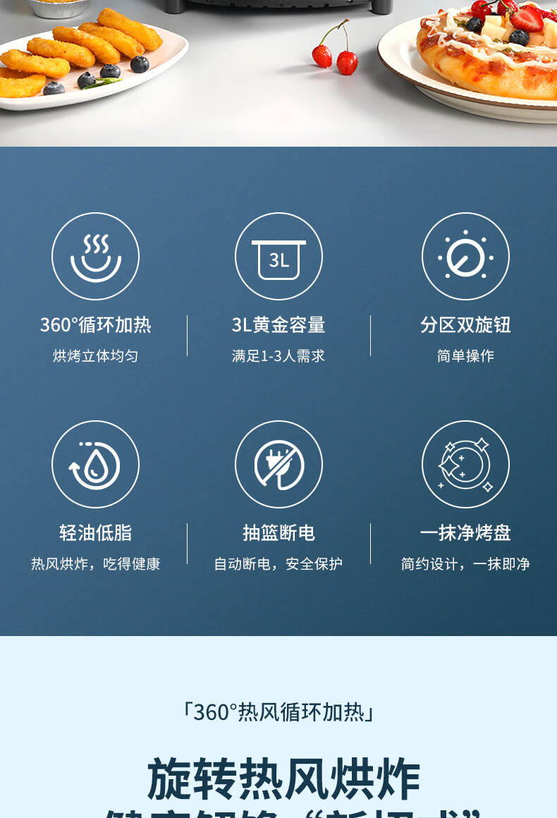 360°热风循环加热,烘烤均匀;3L黄金容量,满足1~3人需求;分区双旋钮,简单操作;轻油低脂,吃的健康;抽篮自动断电,安全保护