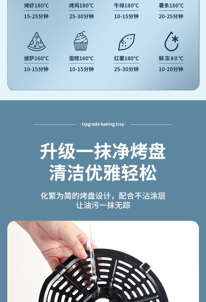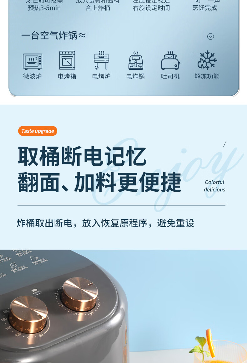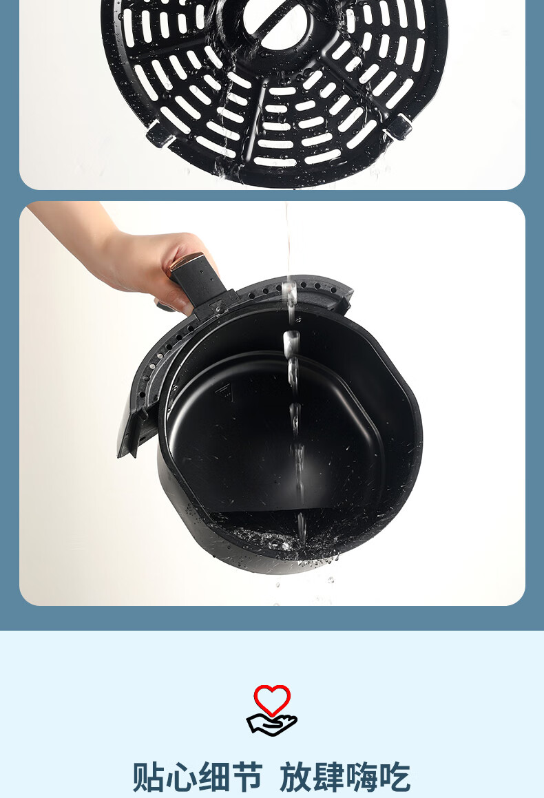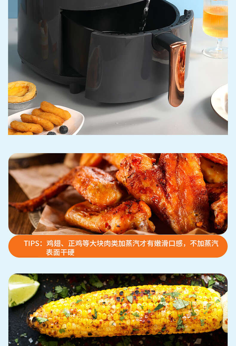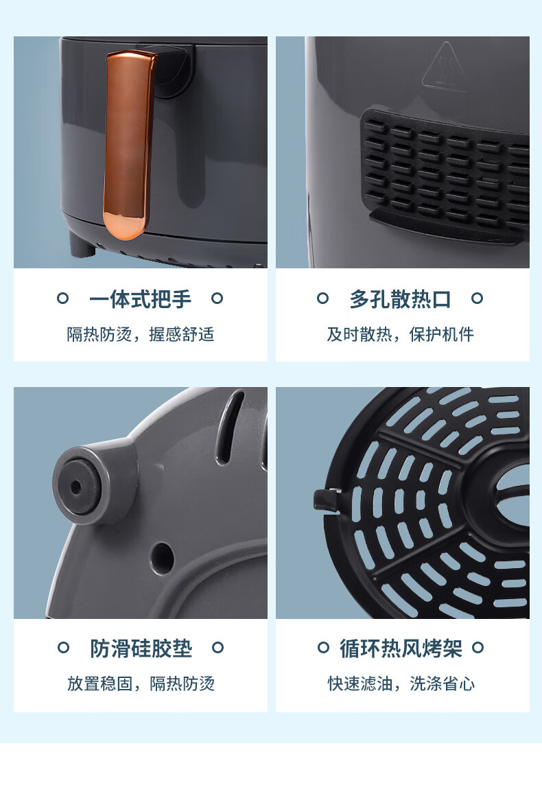360°热风循环加热,烘烤均匀;3L黄金容量,满足1~3人需求;分区双旋钮,简单操作;轻油低脂,吃的健康;抽篮自动断电,安全保护