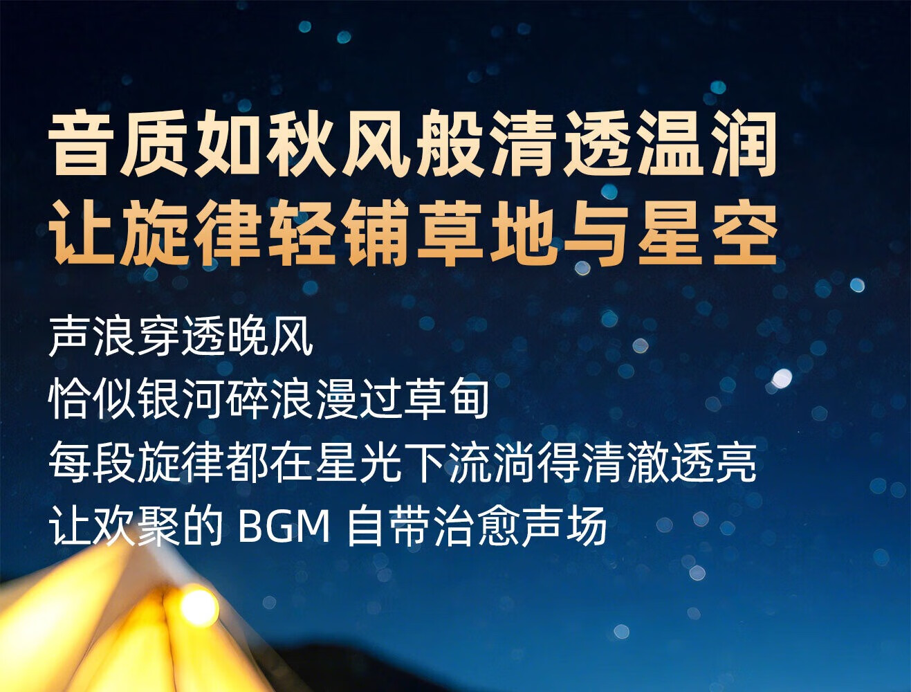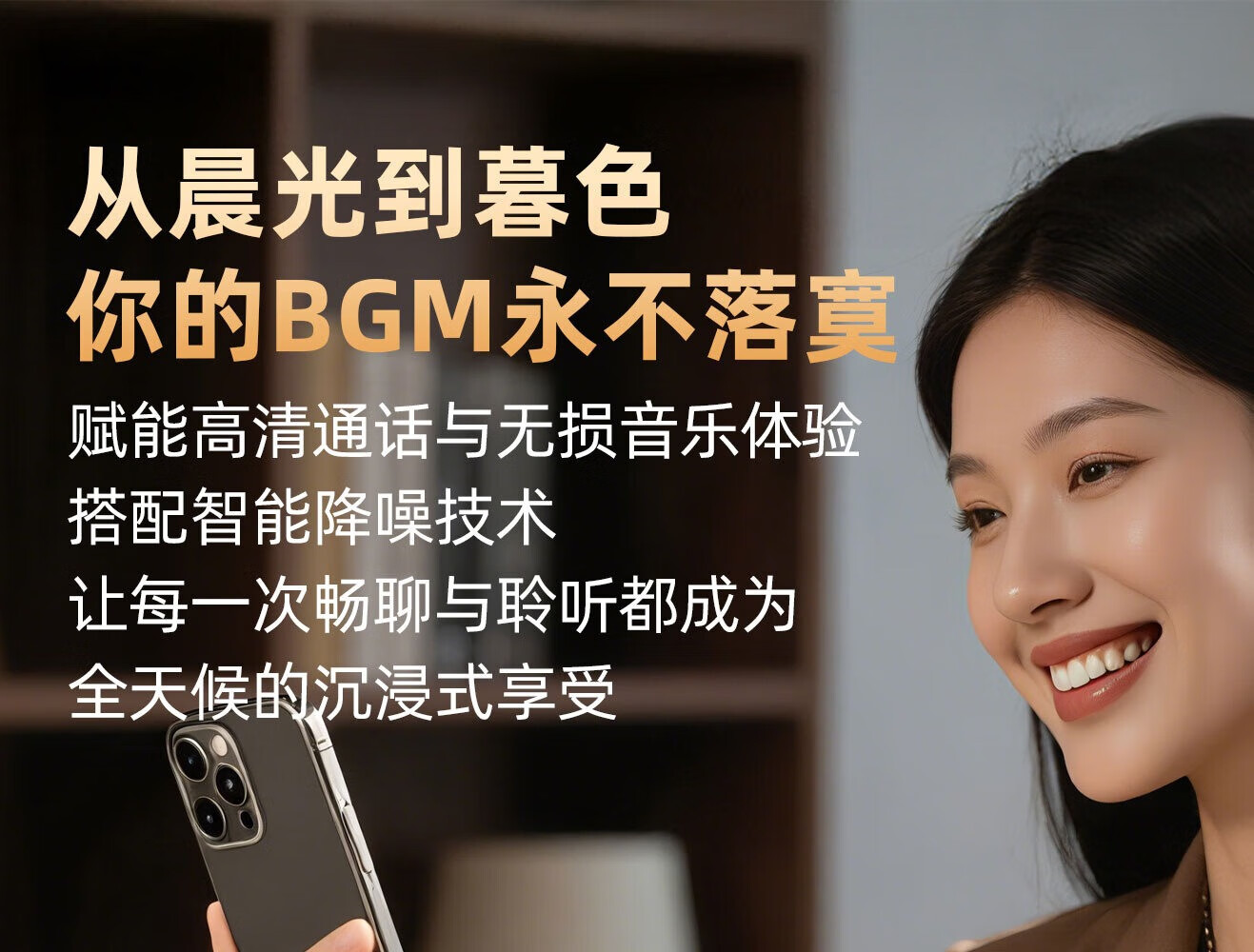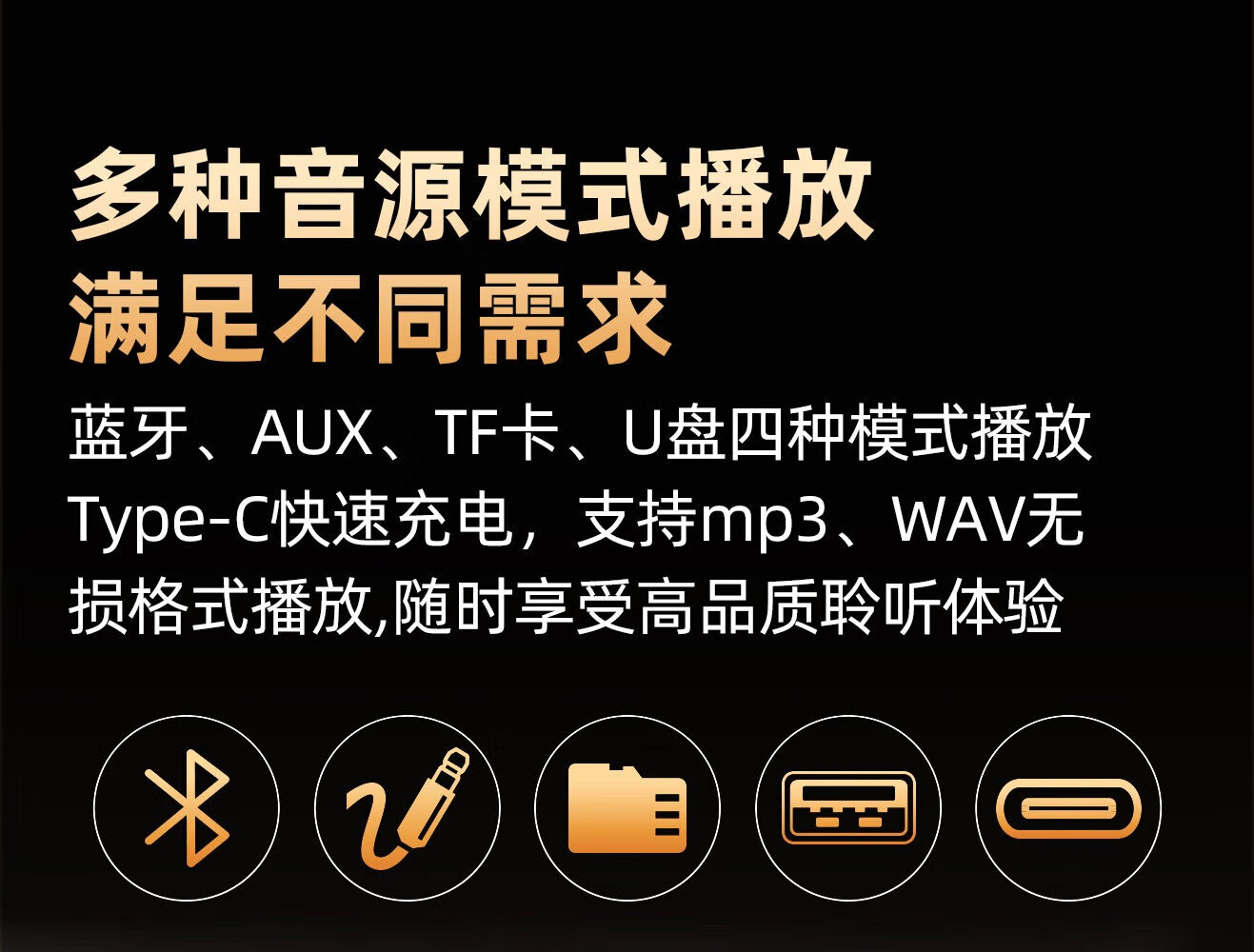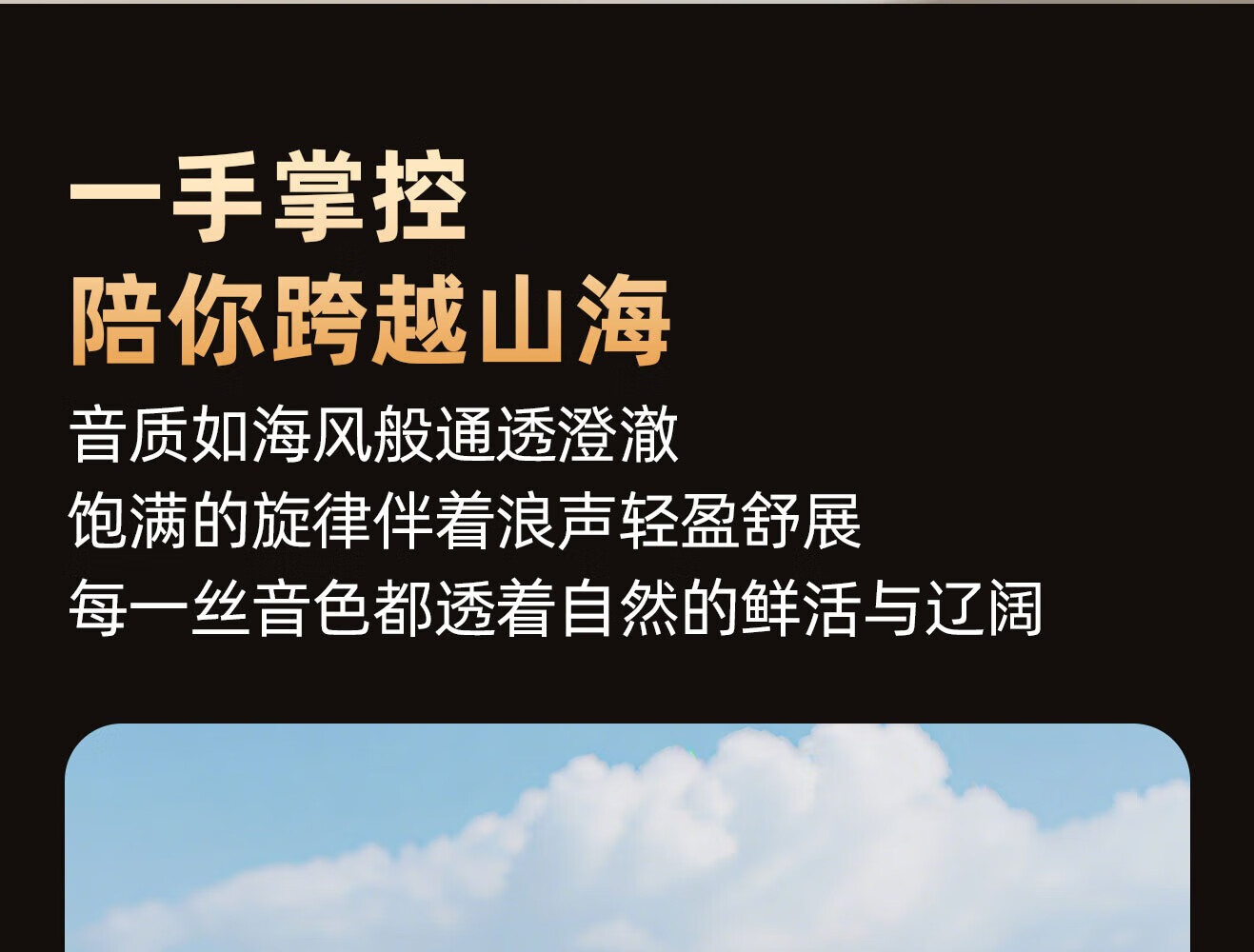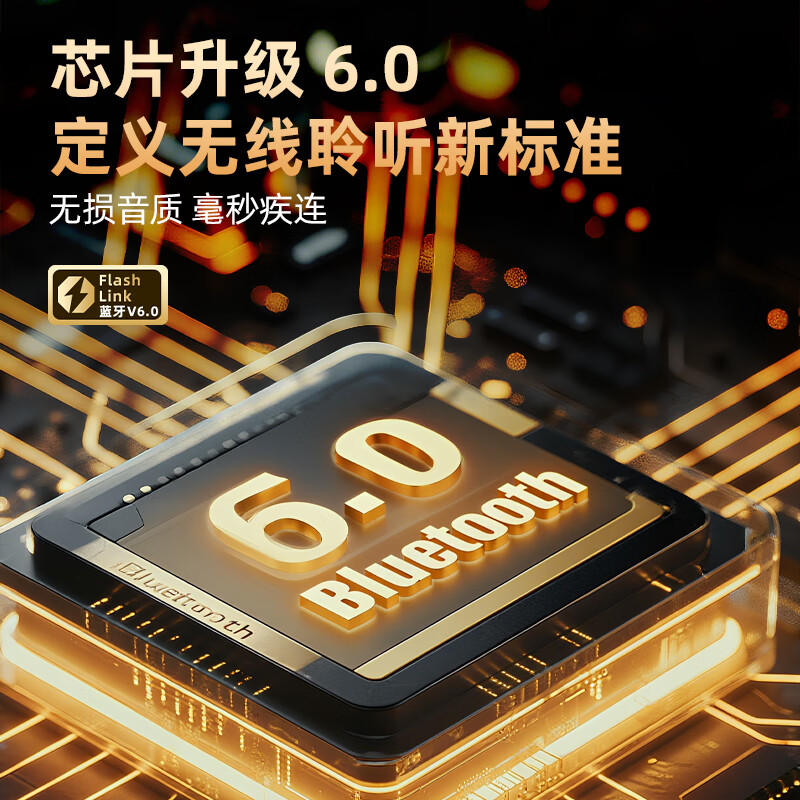 大尺寸金属复合振膜,全景环绕音效;大容量强劲续航,一次充电可连续听音乐12小时;内置高清降噪收音麦,接听电话,过滤环境杂音,收音灵