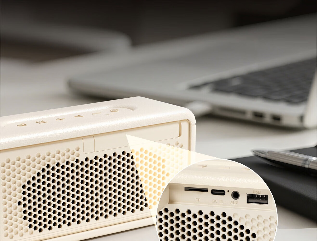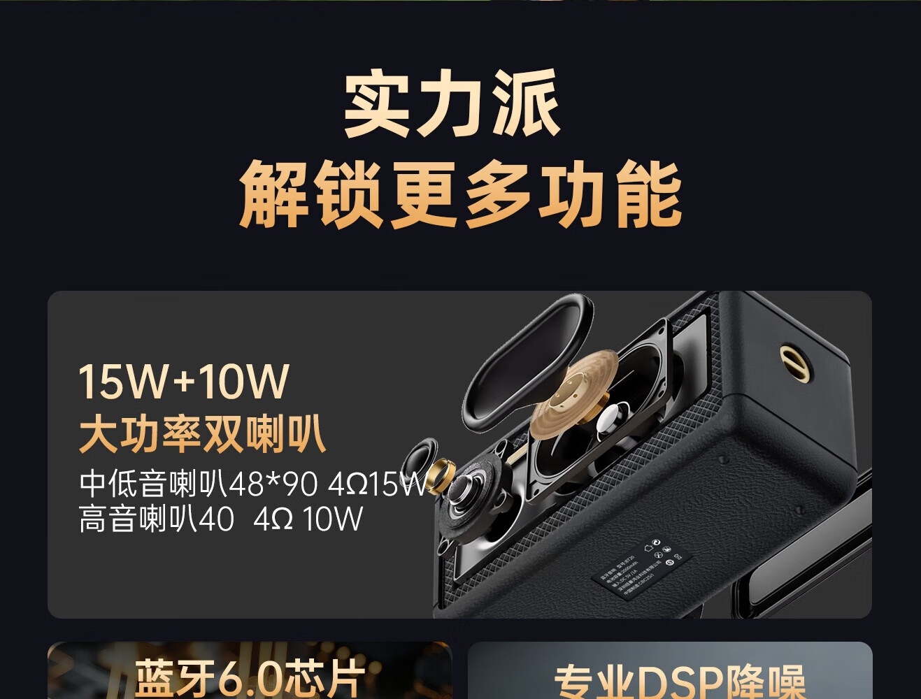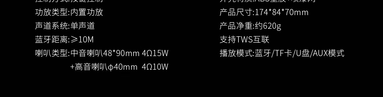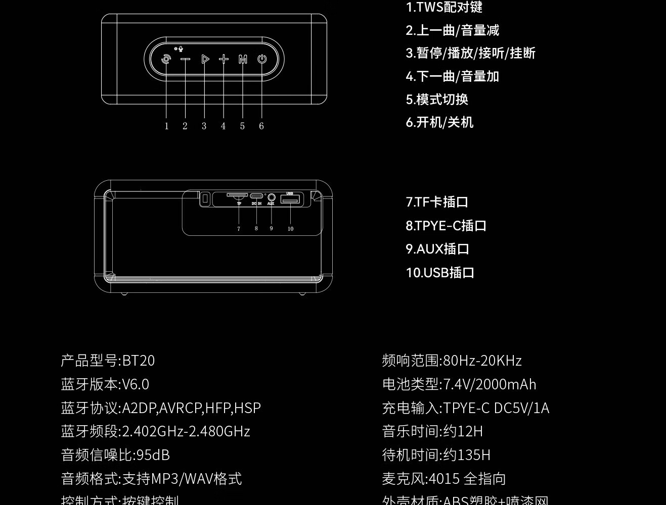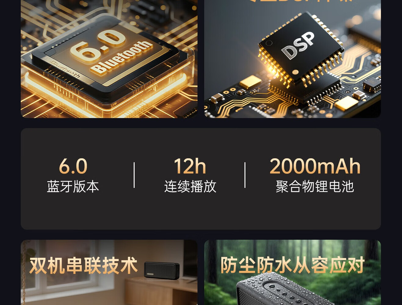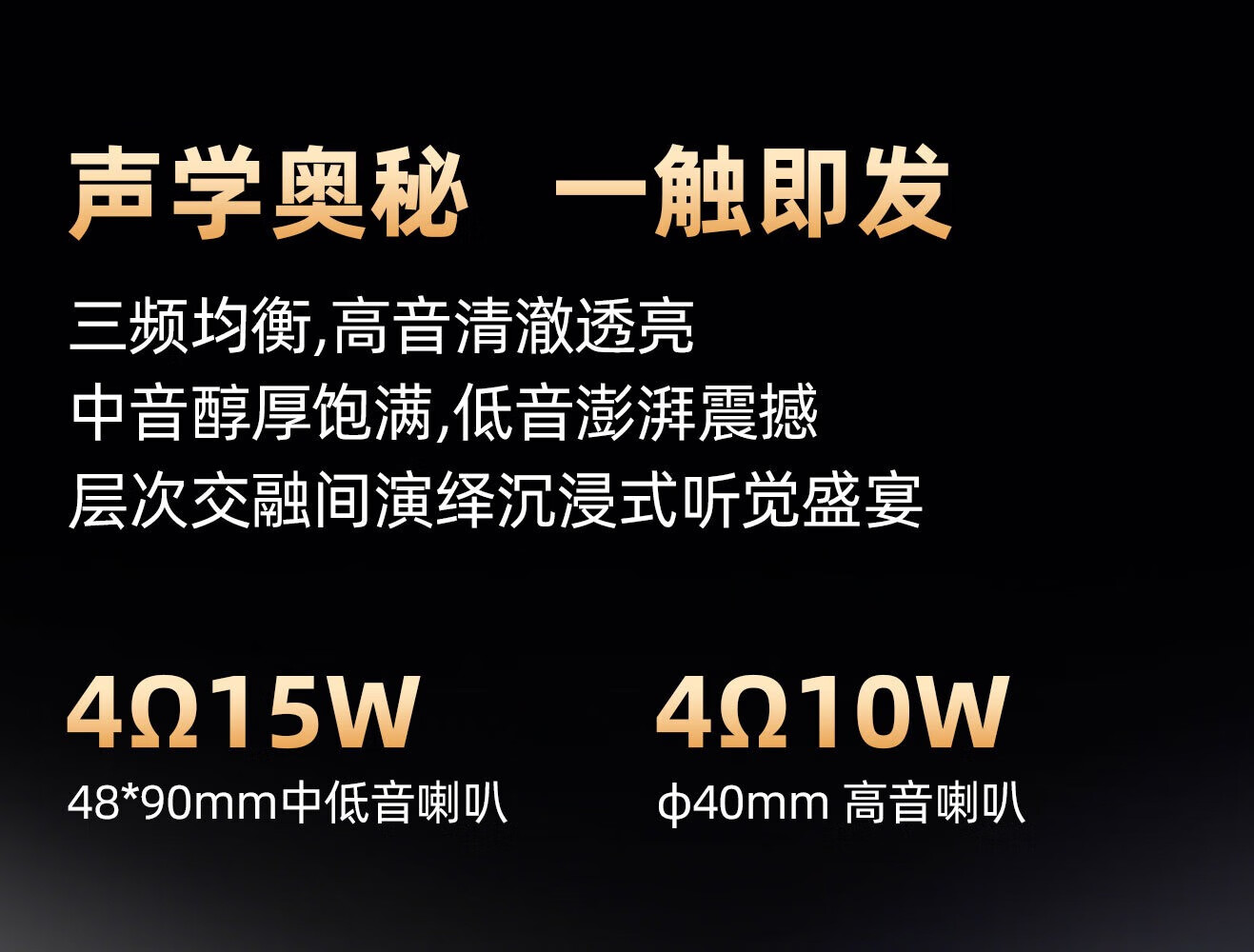 大尺寸金属复合振膜,全景环绕音效;大容量强劲续航,一次充电可连续听音乐12小时;内置高清降噪收音麦,接听电话,过滤环境杂音,收音灵
