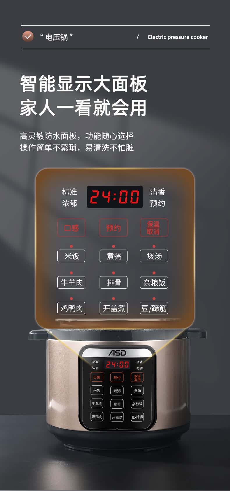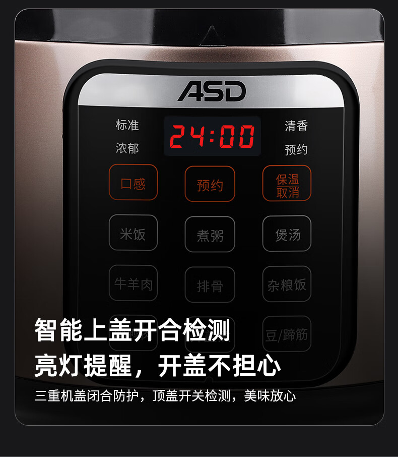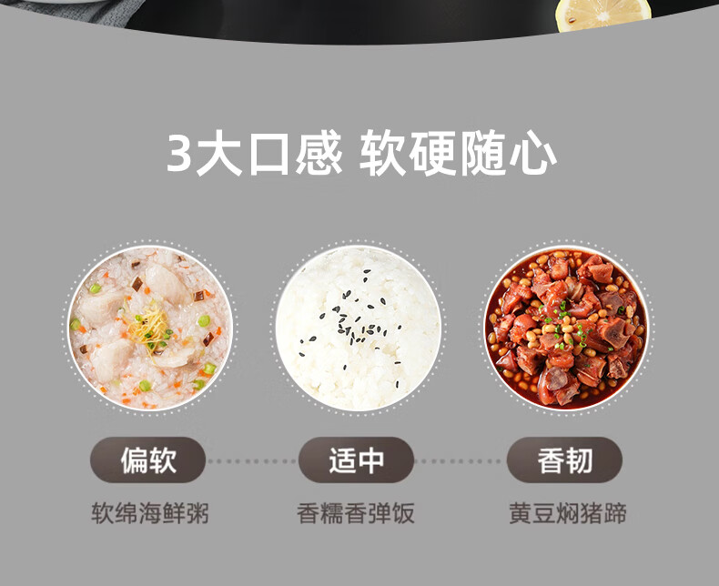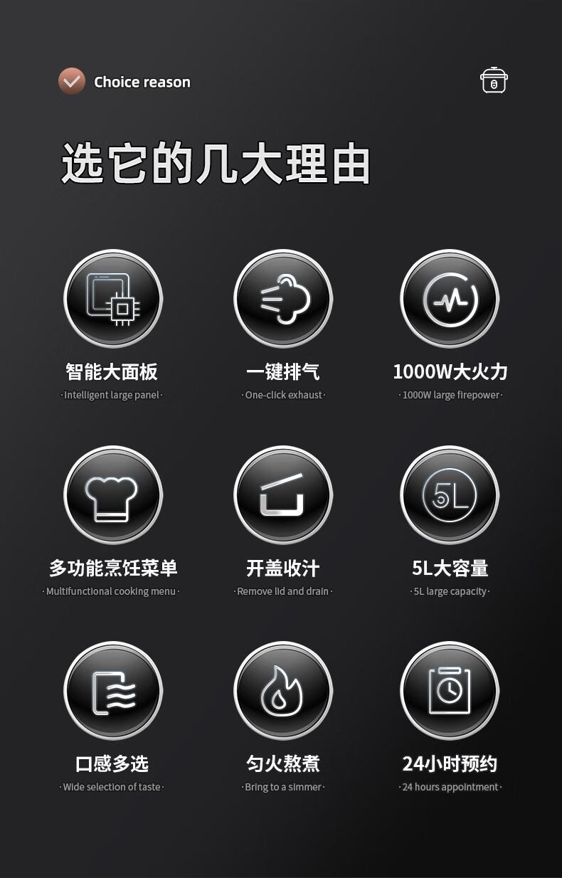 前拆大面板设计,时尚大方;全塑防烫设计,使用更安全;24小时预约,10大烹饪功能,操作简单;八重安全保护装置,防溢,防爆,防堵;超厚双喷内胆,传热快,不变形