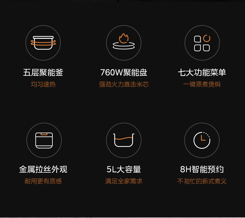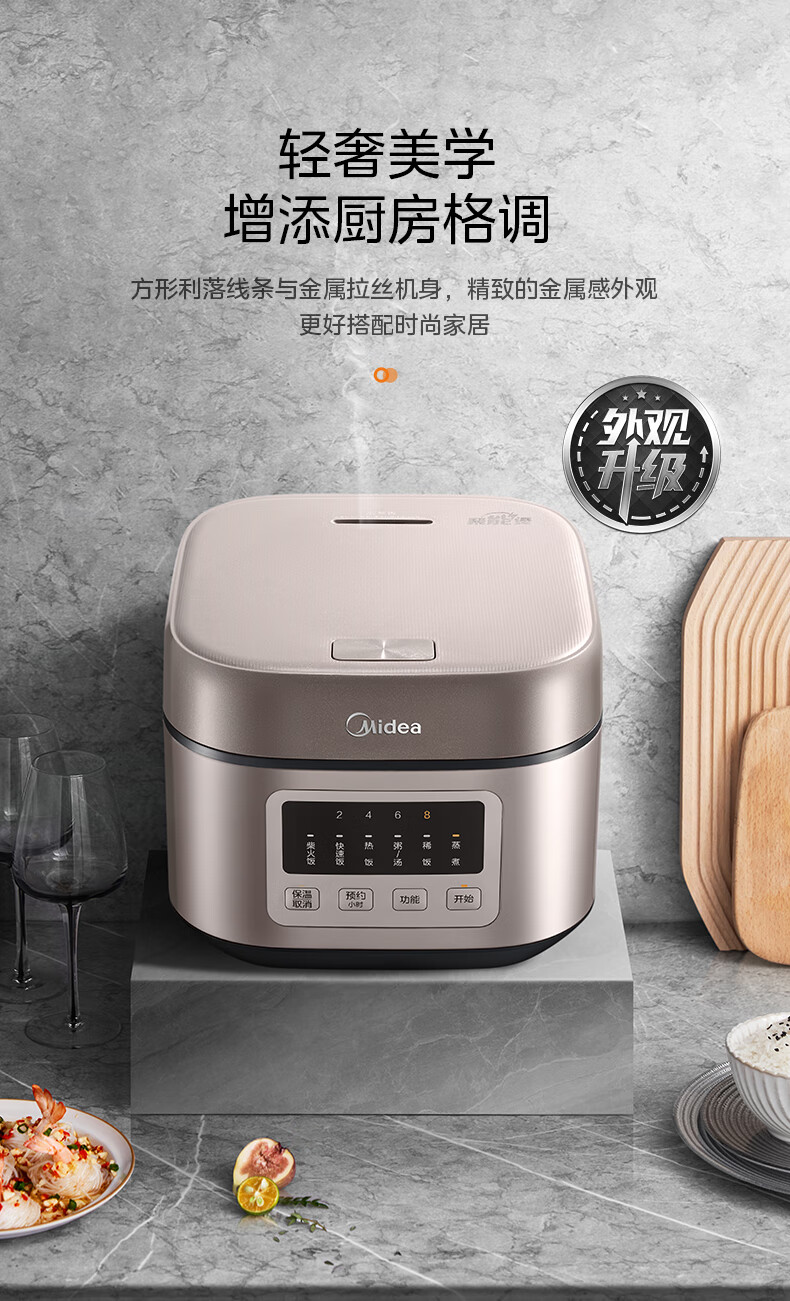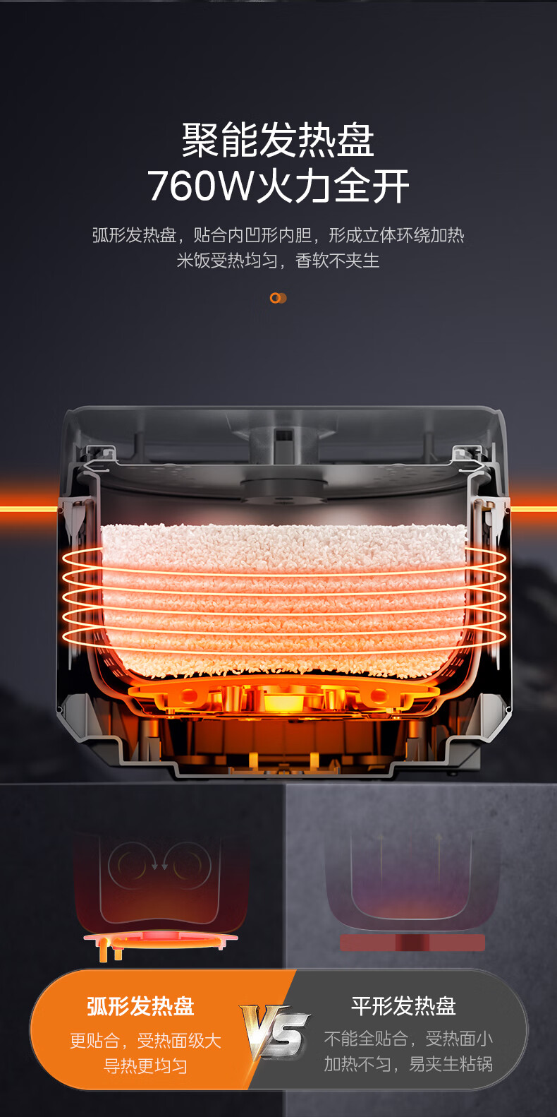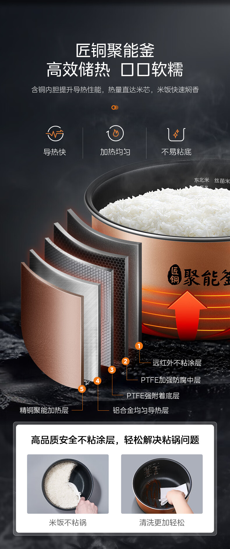 隐藏式微压焖香阀,蒸汽补炊,智能焖香;金属拉丝机身,精巧时尚外观,;1.7mm匠铜聚能釜,健康不粘