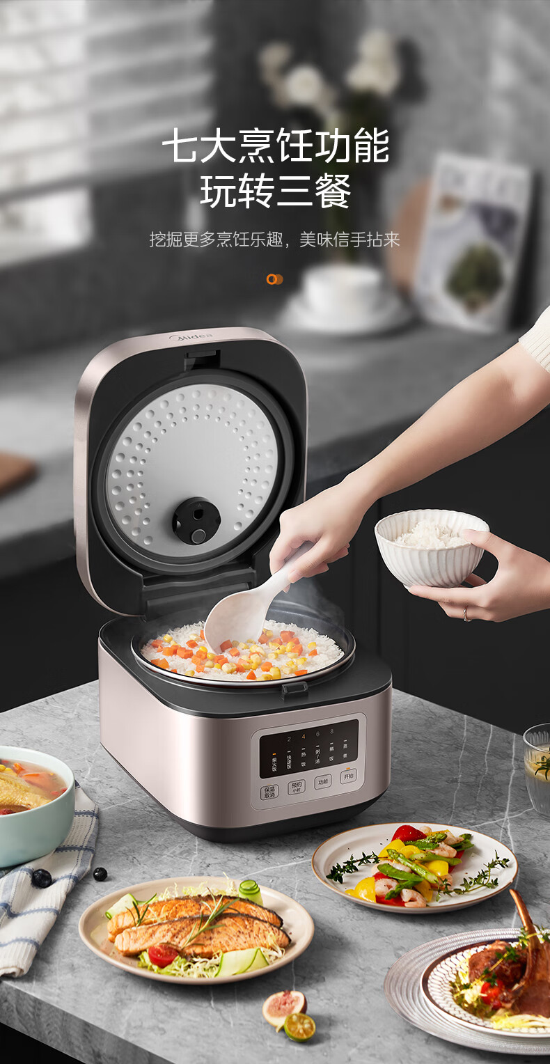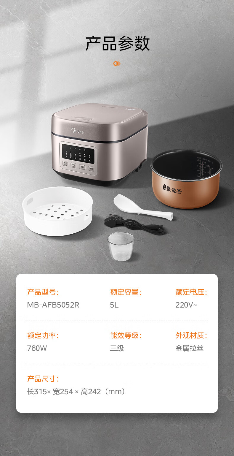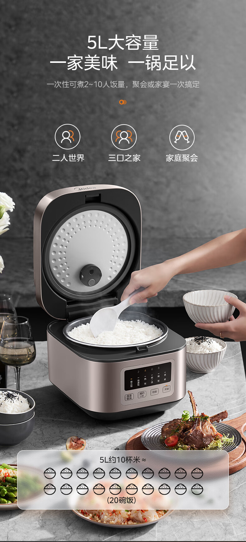 隐藏式微压焖香阀,蒸汽补炊,智能焖香;金属拉丝机身,精巧时尚外观,;1.7mm匠铜聚能釜,健康不粘