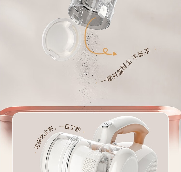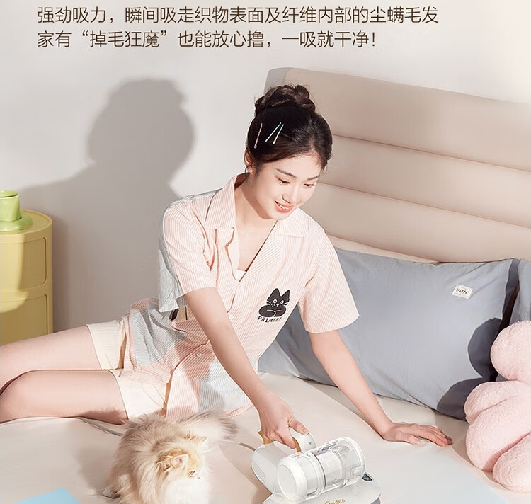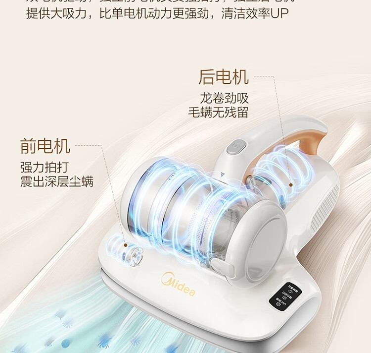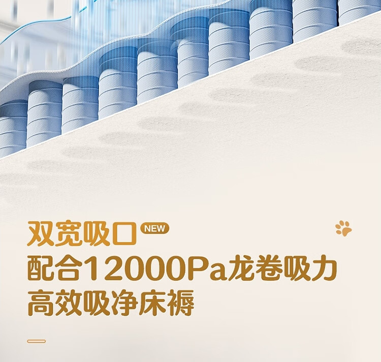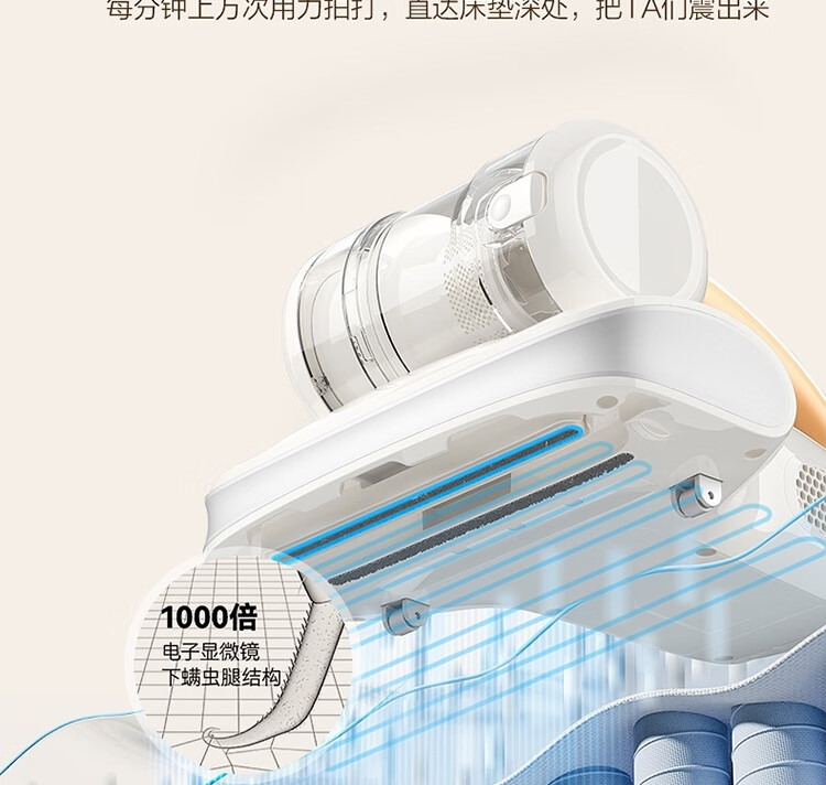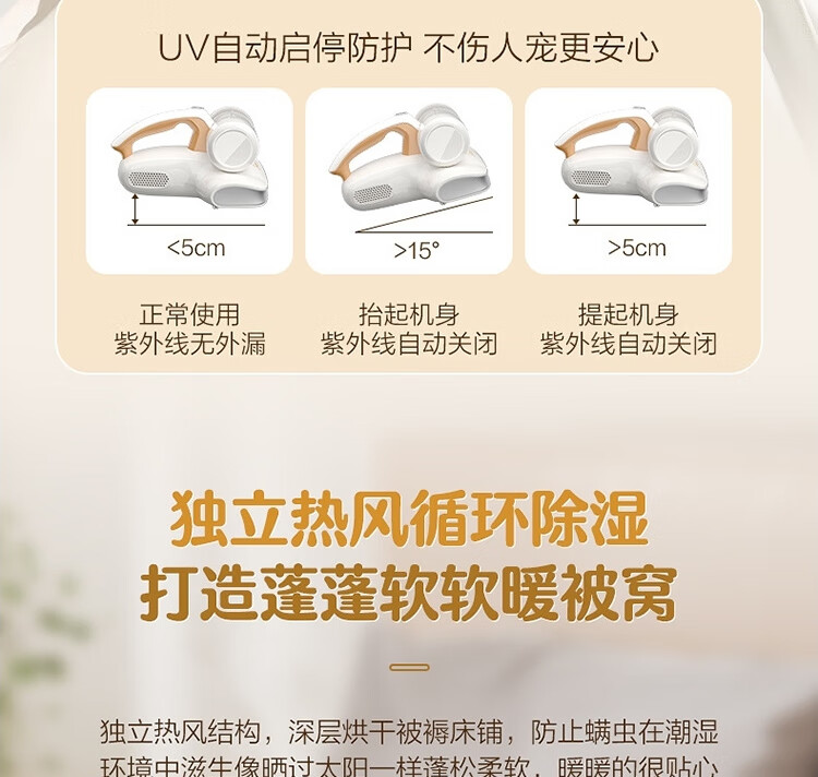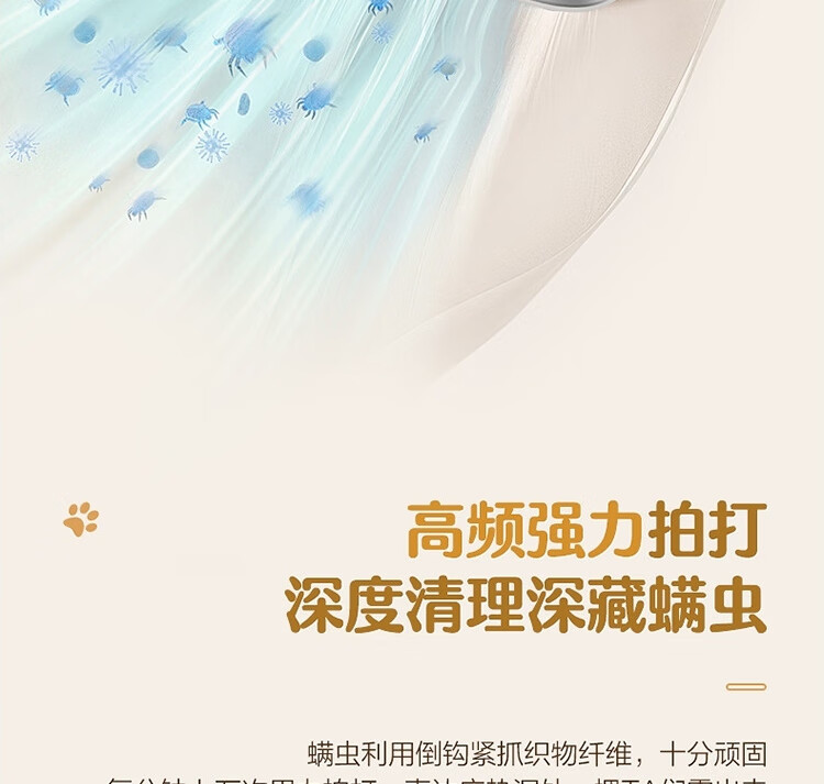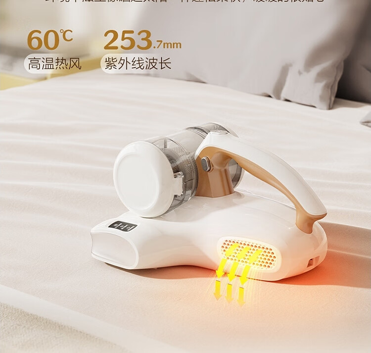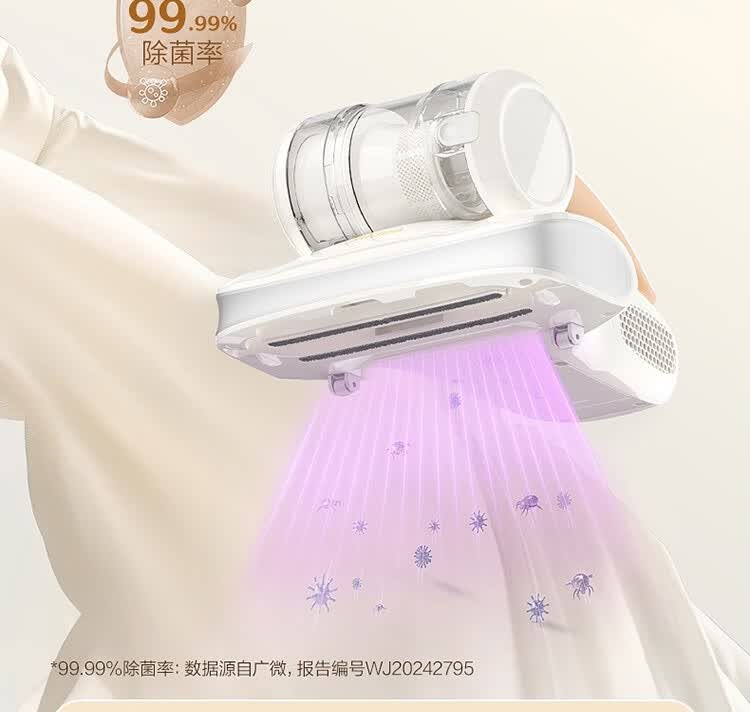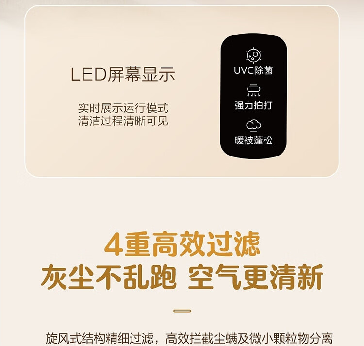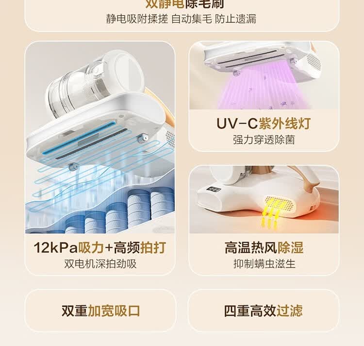 12kPa吸力+高频拍打双电机深拍劲吸;UV-C紫外线灯,强力穿透除菌;高温热风除湿抑制螨虫滋生