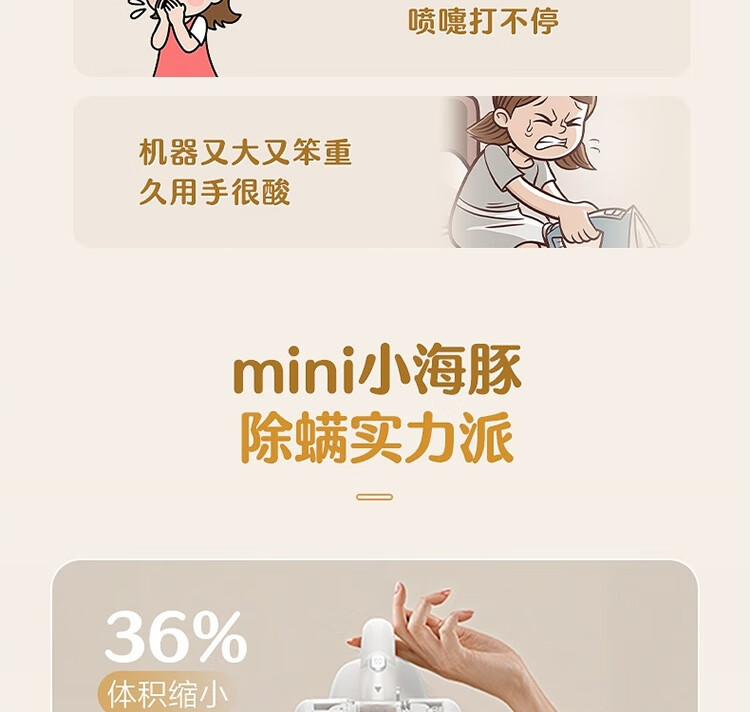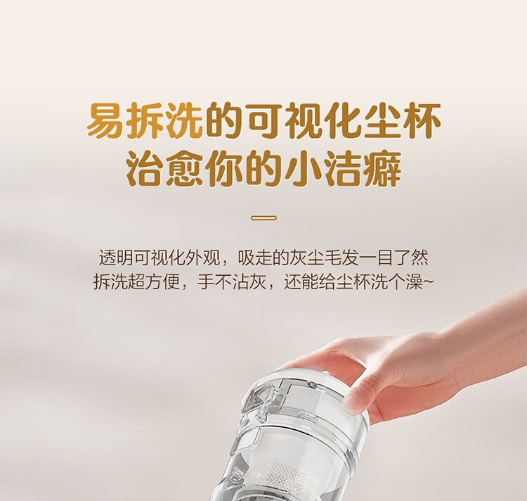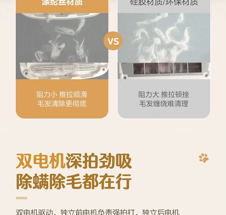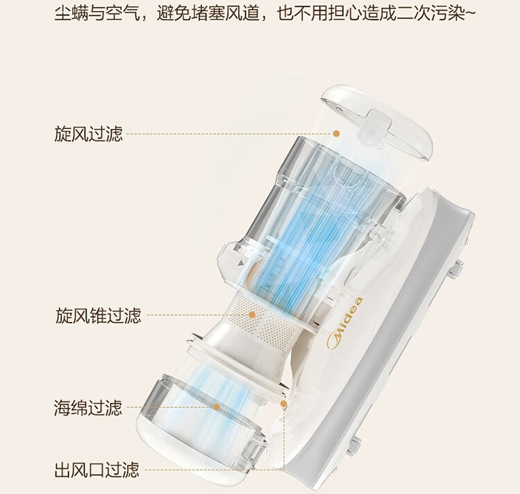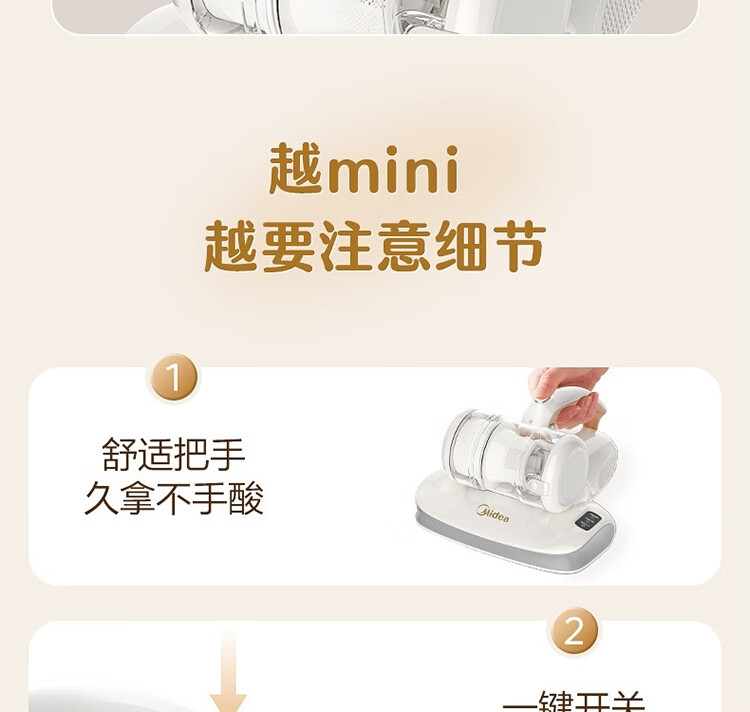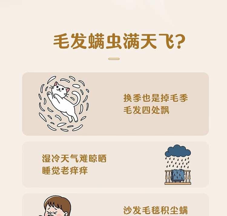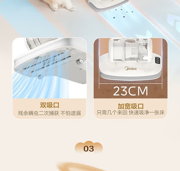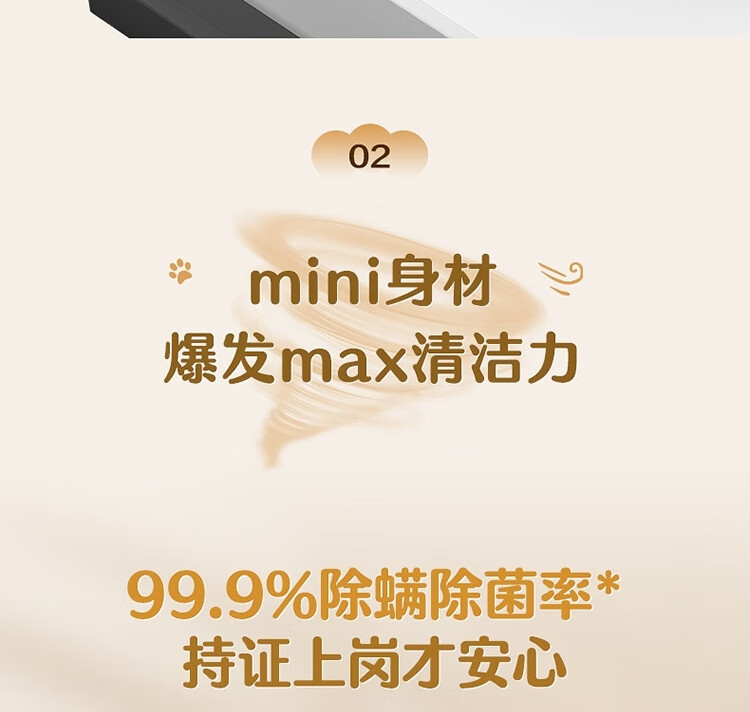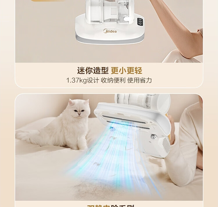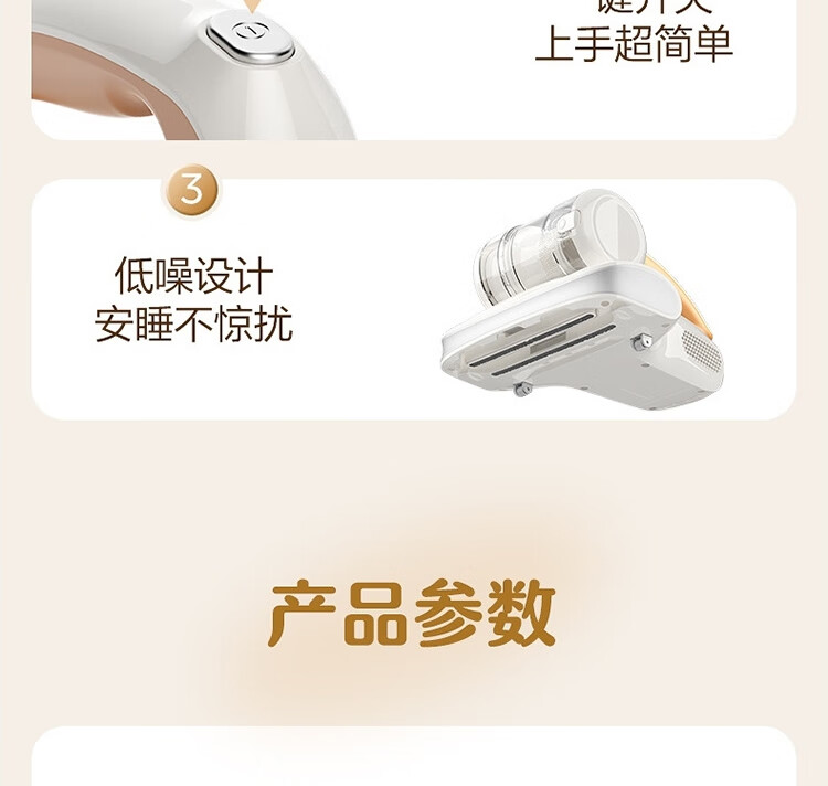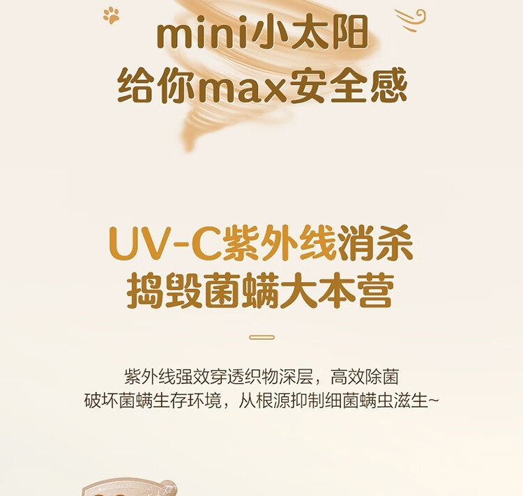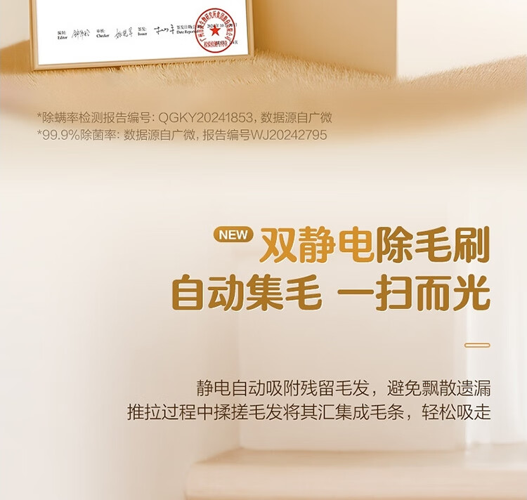 12kPa吸力+高频拍打双电机深拍劲吸;UV-C紫外线灯,强力穿透除菌;高温热风除湿抑制螨虫滋生