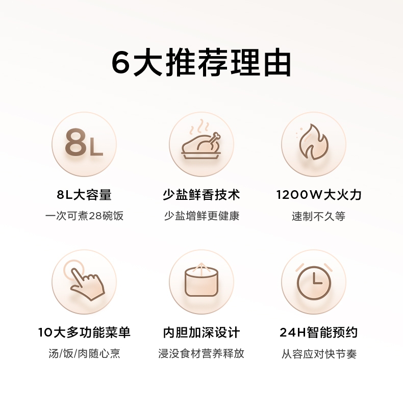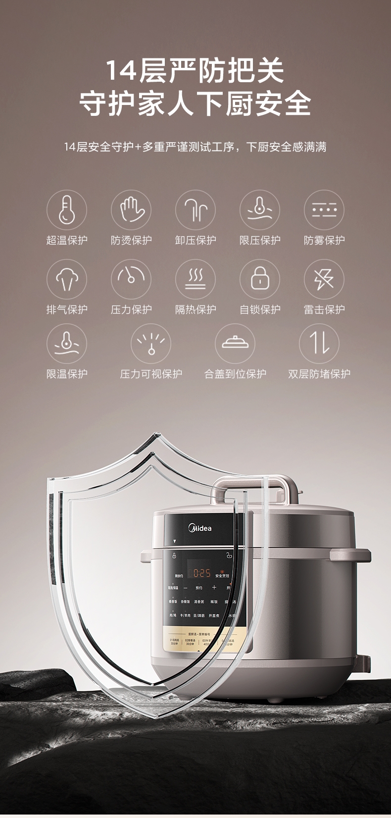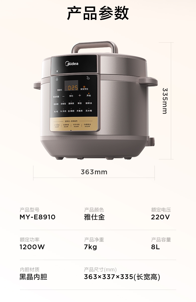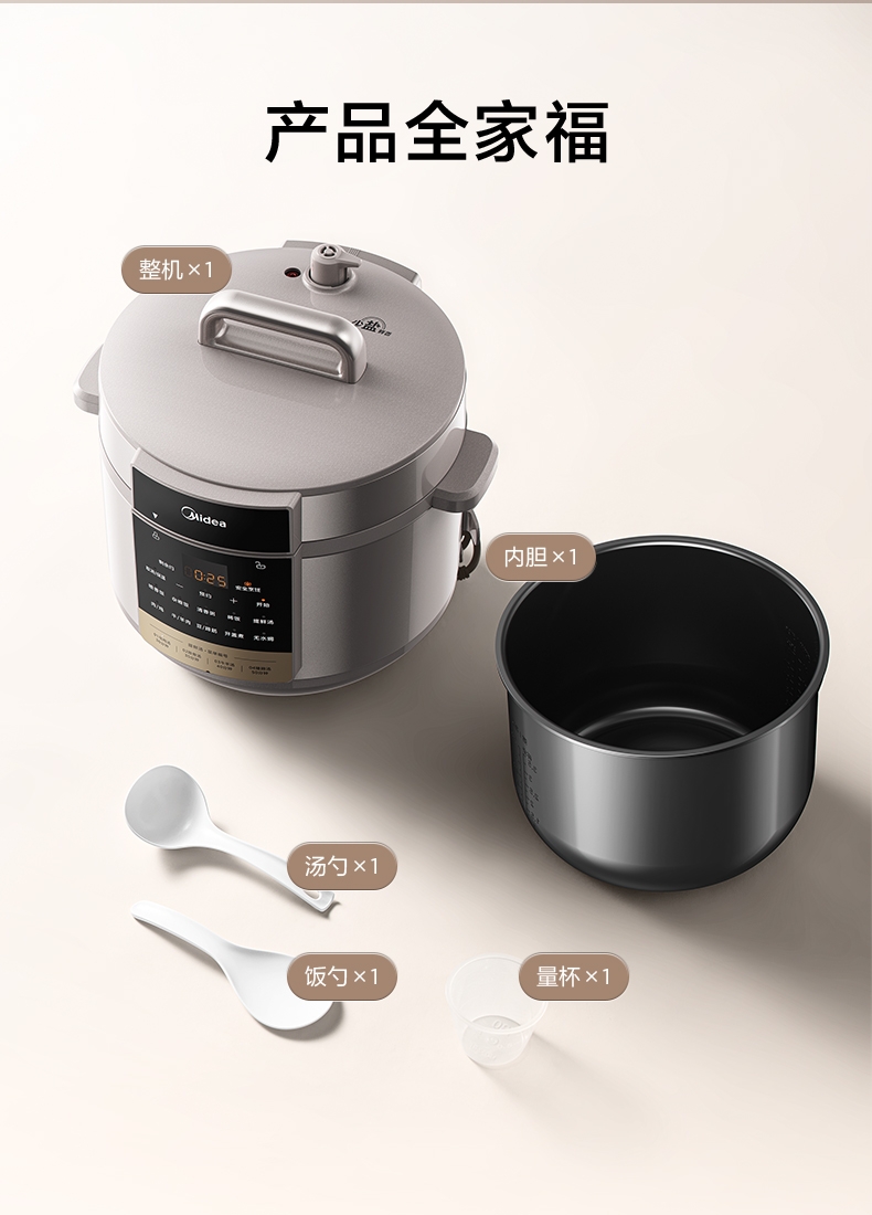 1200W大功率,火力升级,大火快煮,;70KPA压力,实际烹饪温度高达115摄氏度;10种预设菜单+多种延伸食谱,一键启动