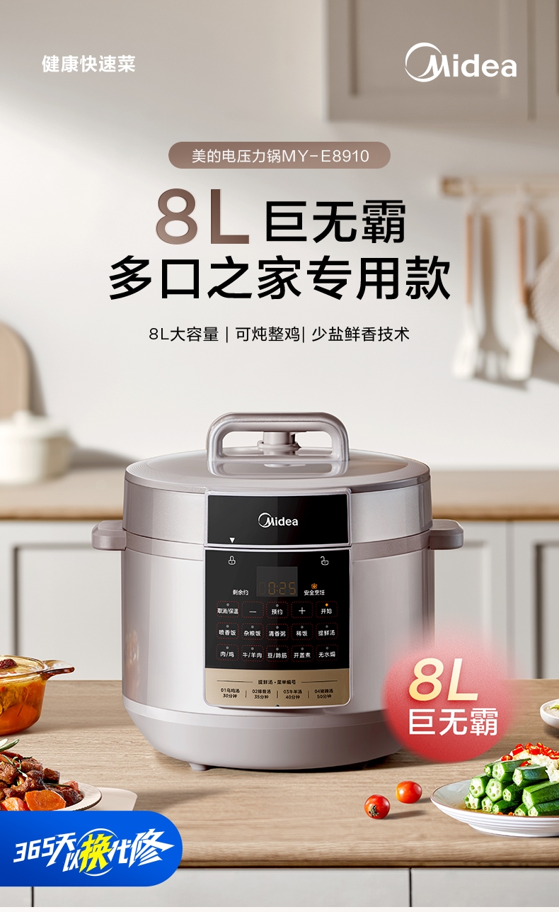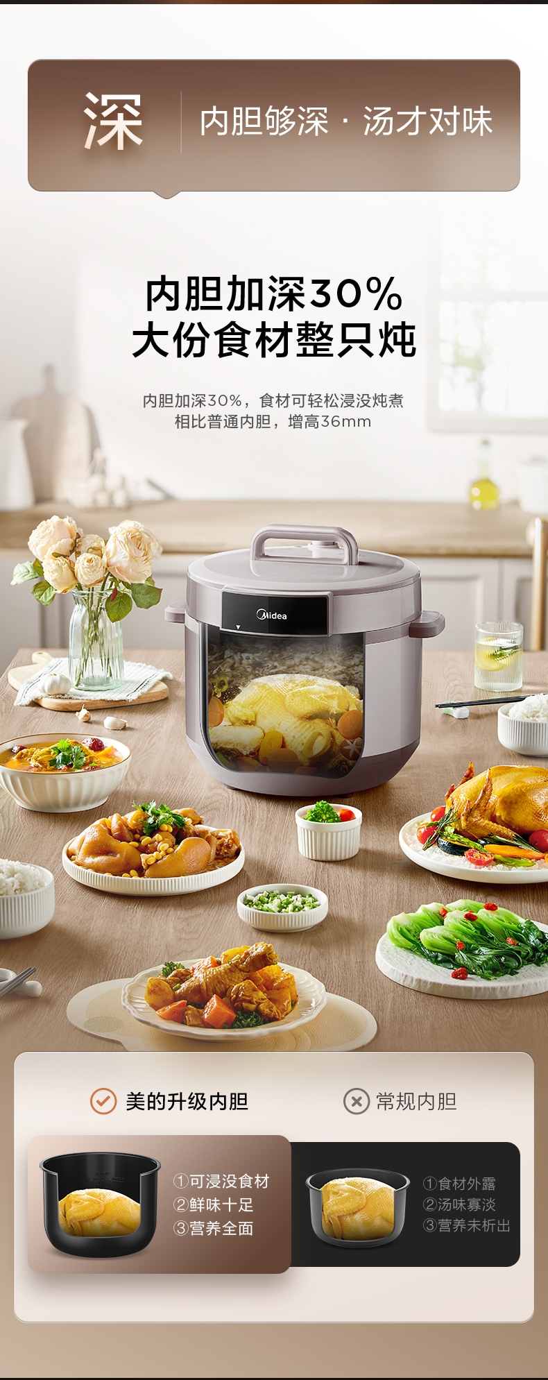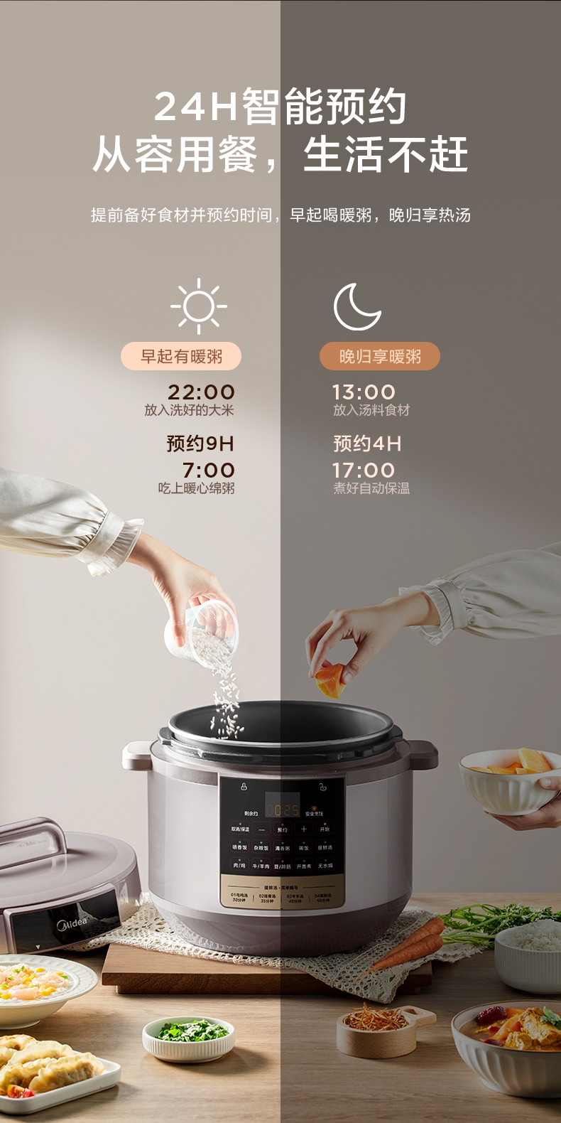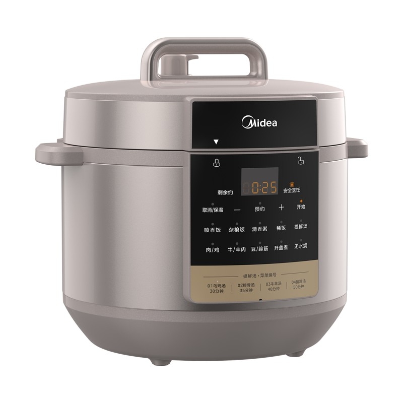1200W大功率,火力升级,大火快煮,;70KPA压力,实际烹饪温度高达115摄氏度;10种预设菜单+多种延伸食谱,一键启动