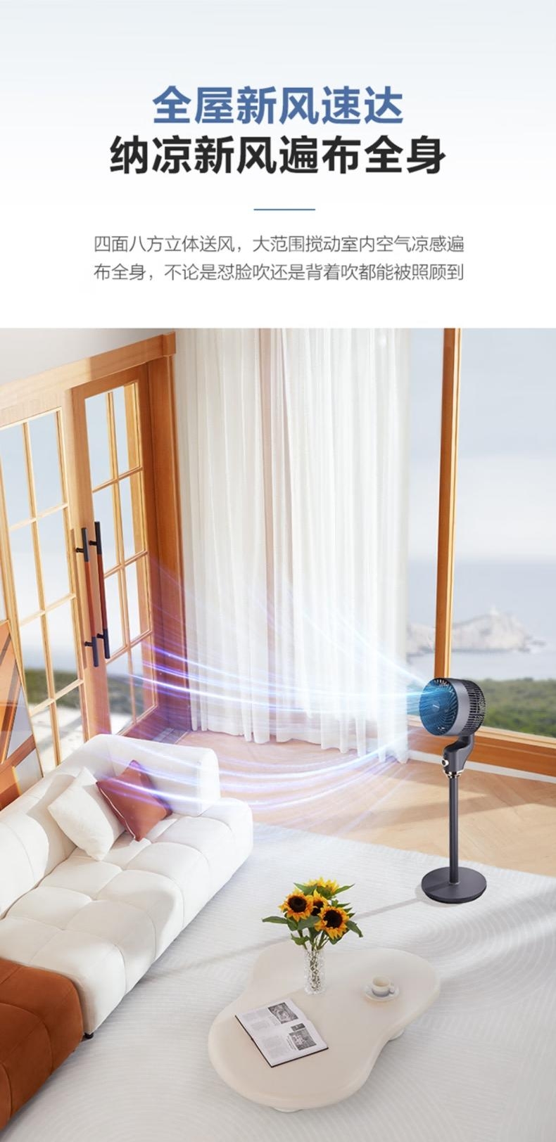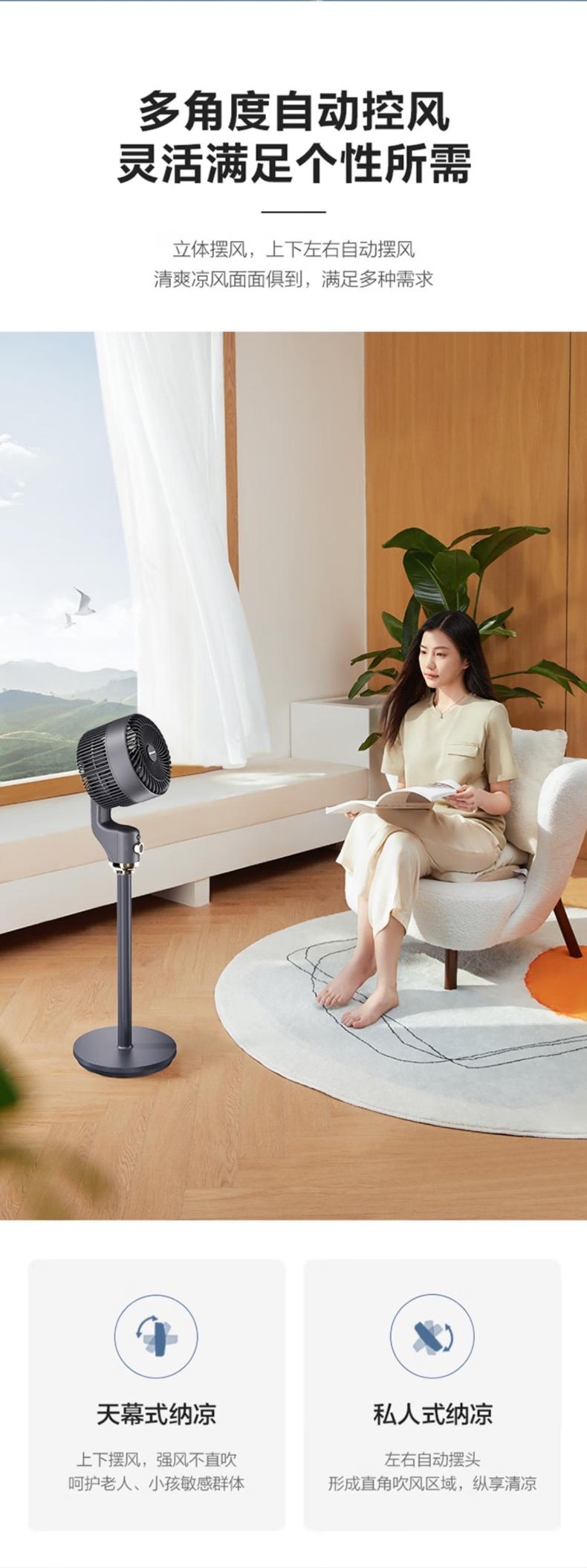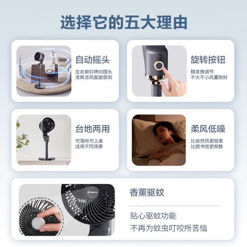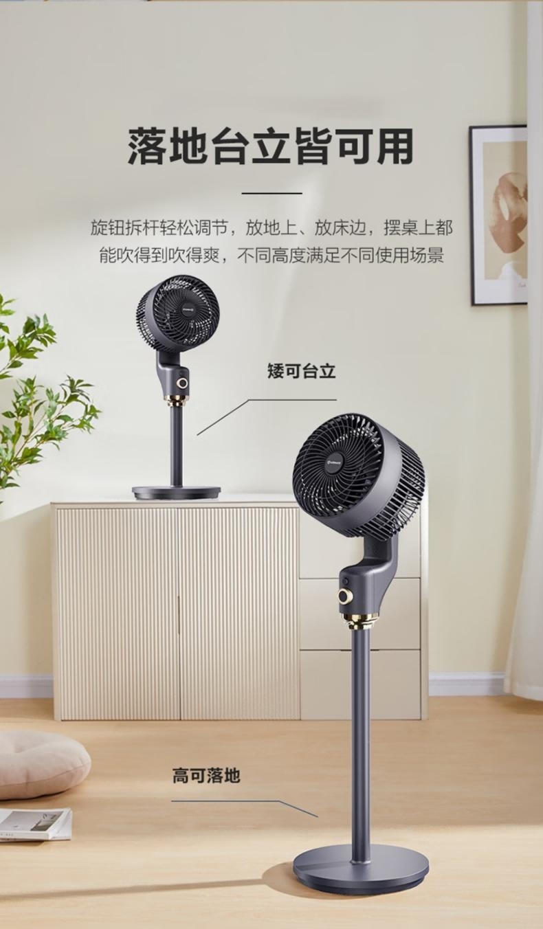 台地两用,灵活适配:自由拼接杆,加高至约108cm;全自动摆头,广角循环;香薰+驱蚊,一机多用;3档风力可调,柔风不直吹;循环扇结构,远距送风+全屋对流,快速平衡室温