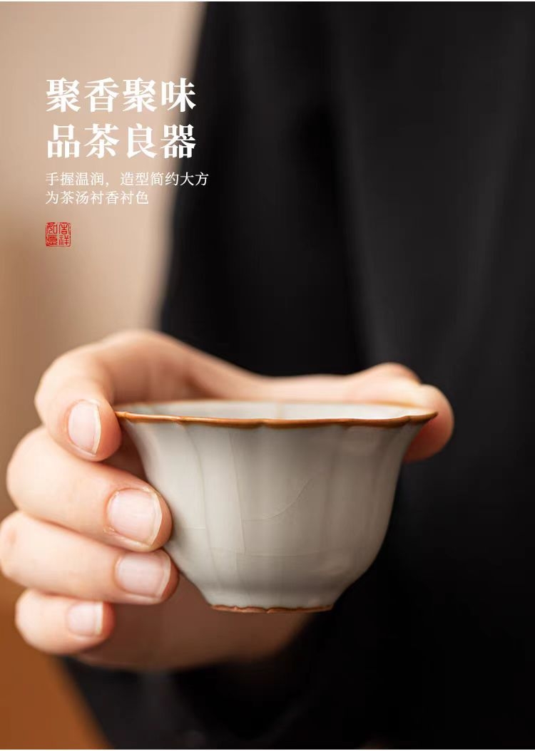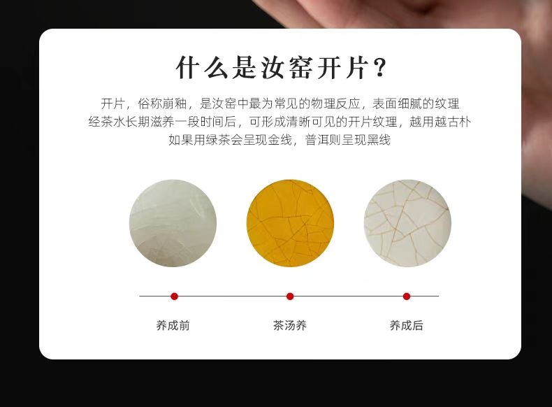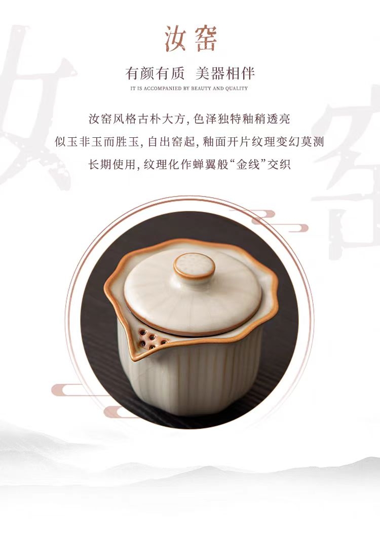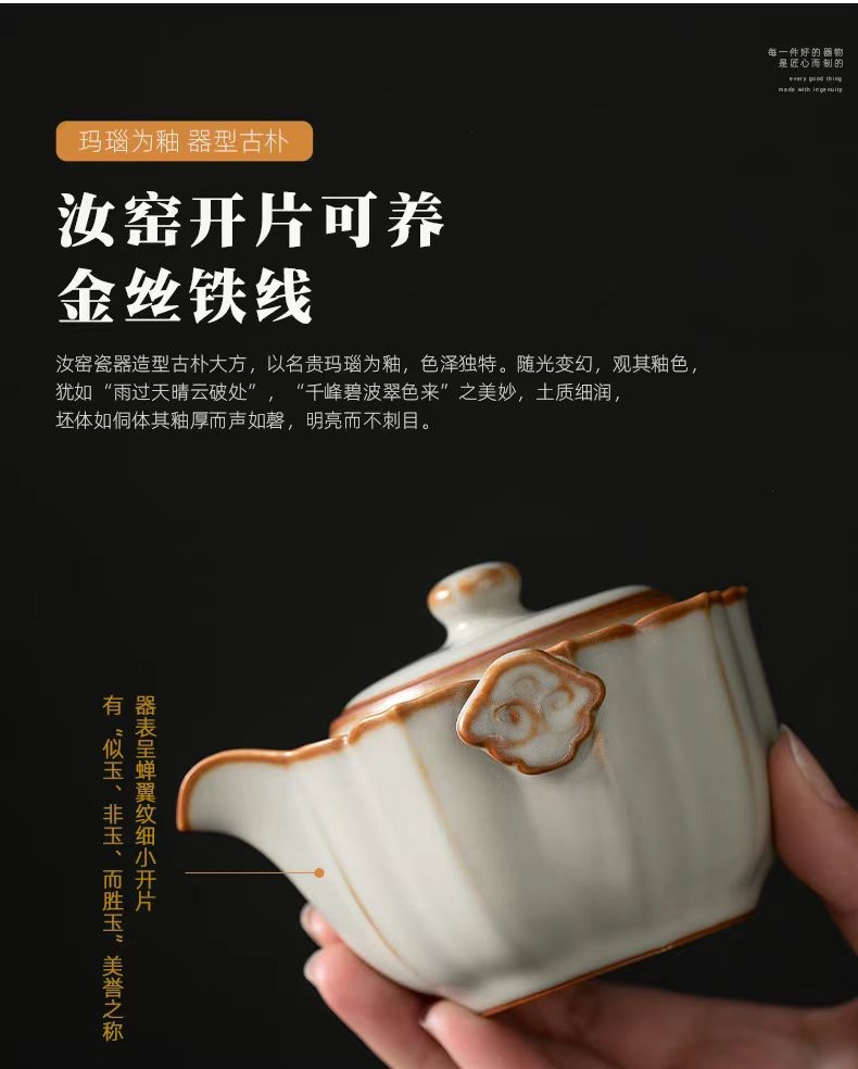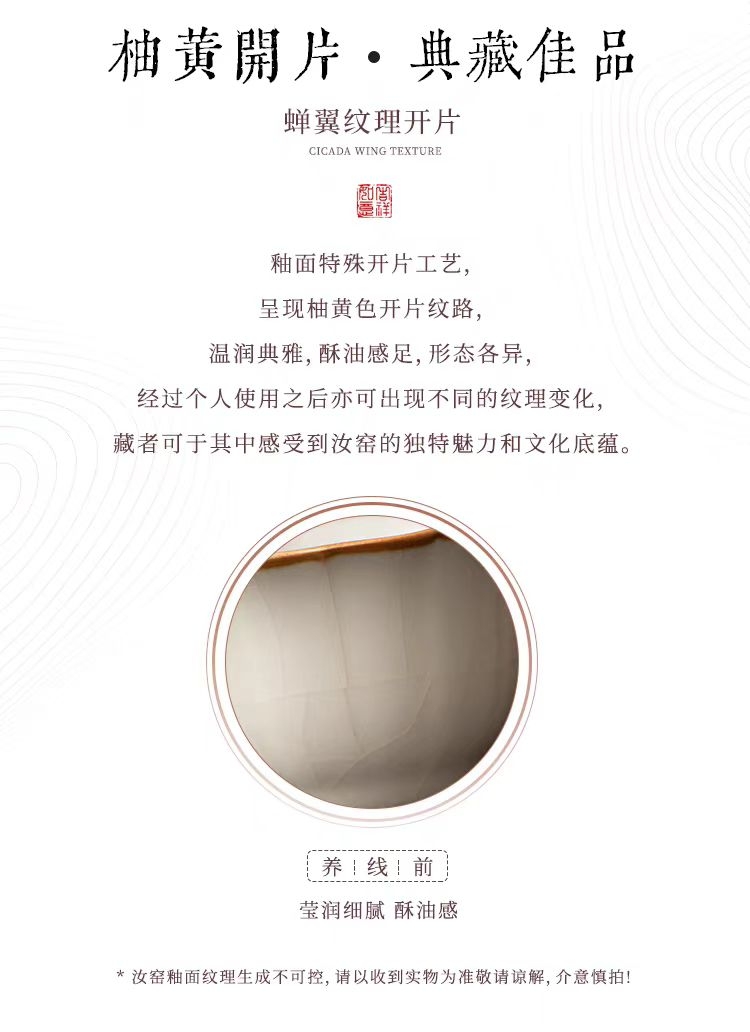 亚黄汝瓷,玛瑙入釉,蝉翼开片;家有千财万贯,不如汝窑一片。独家专利技术新品;采用高价优质瓷土,紫口铁足,瓷质高档。立体浮雕杯身