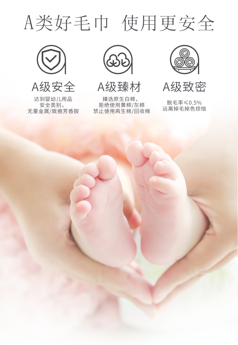 细腻柔软,亲肤不糙;吸水透气,干爽舒适;紧实耐用,不易掉毛