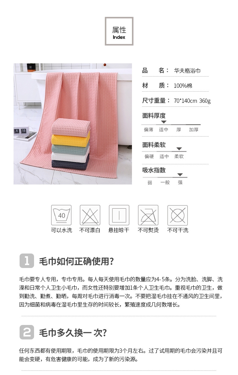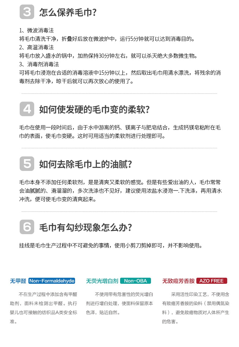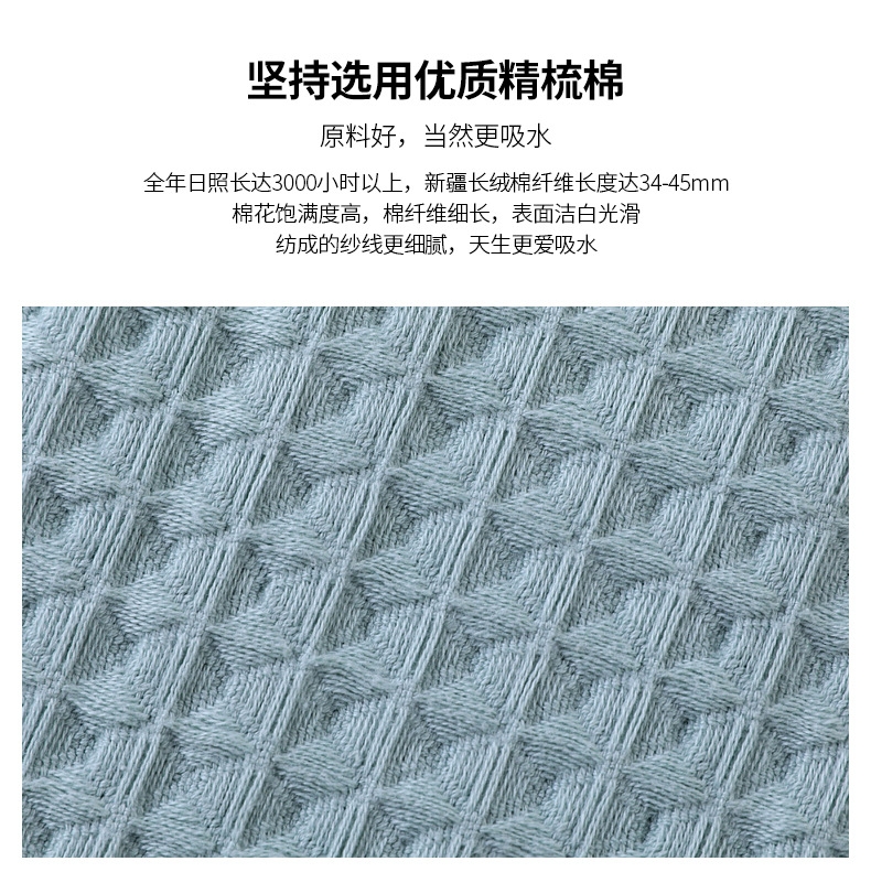 细腻柔软,亲肤不糙;吸水透气,干爽舒适;紧实耐用,不易掉毛