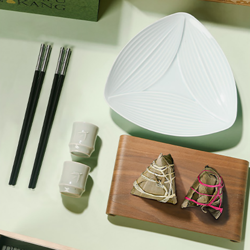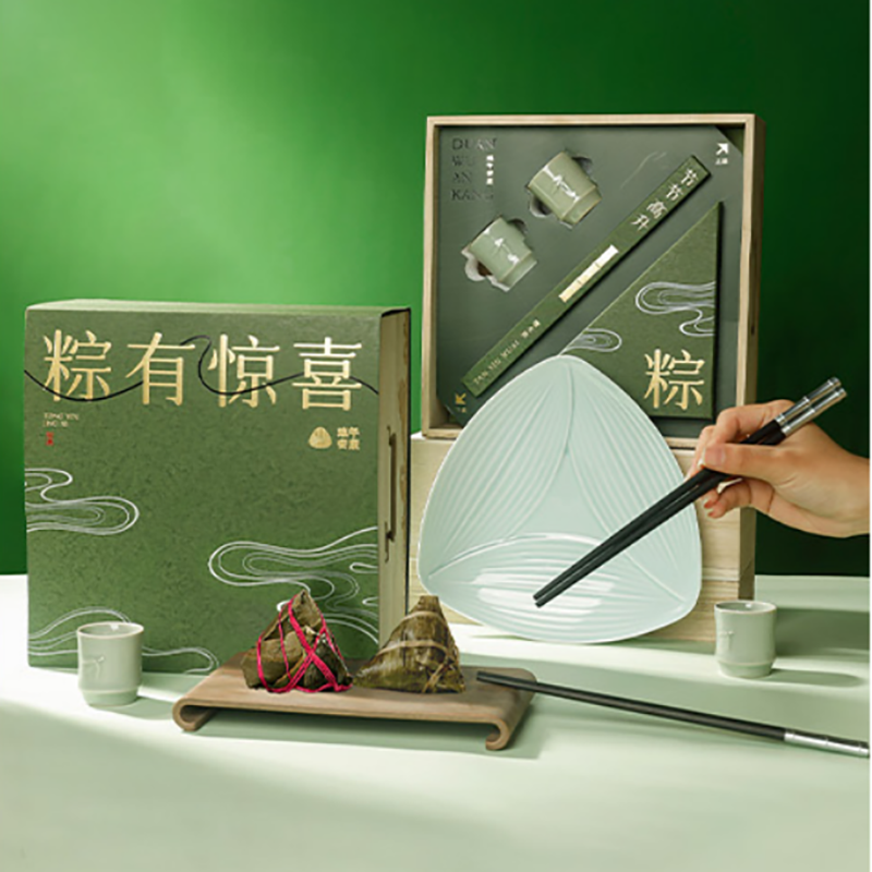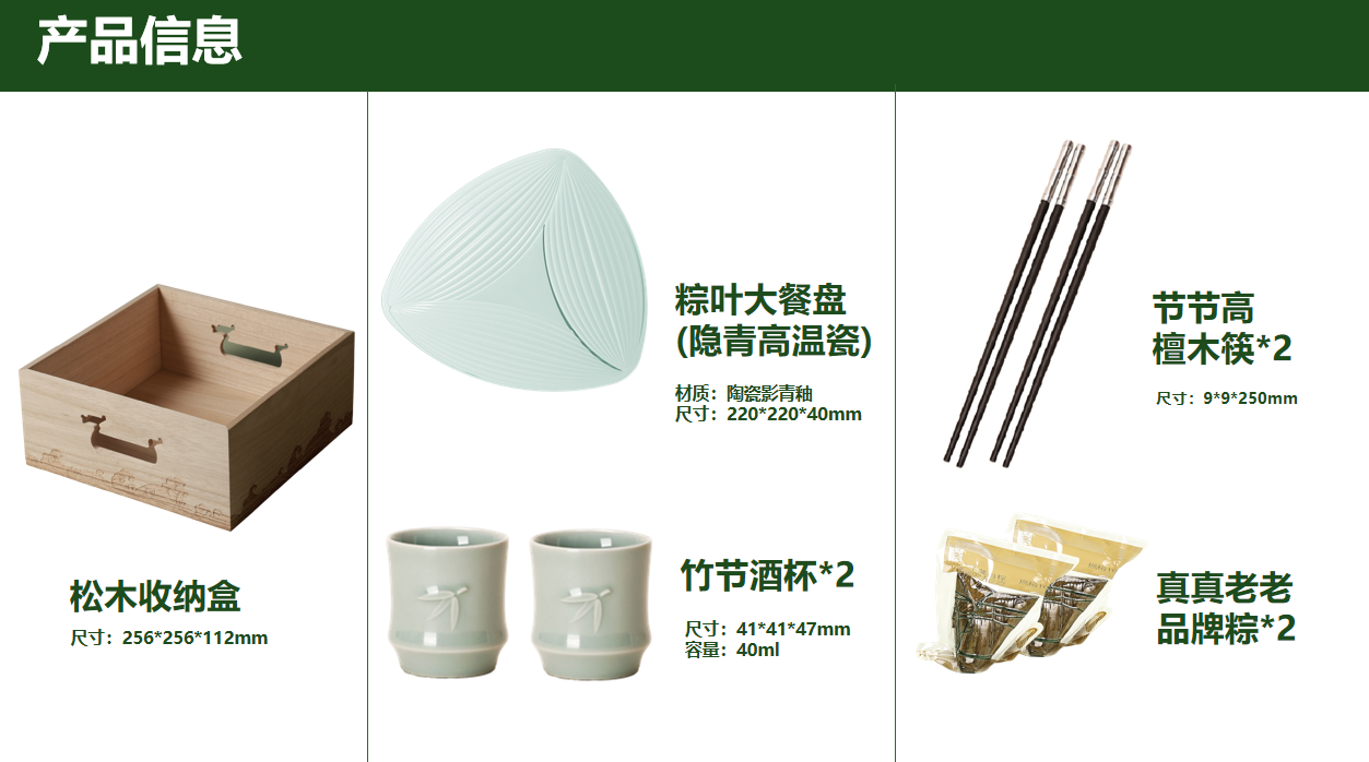 配置:松木收纳盒*1、粽叶大餐盘*1、节节高檀木筷*2、 竹节酒杯*2、真真老老品牌粽 *2