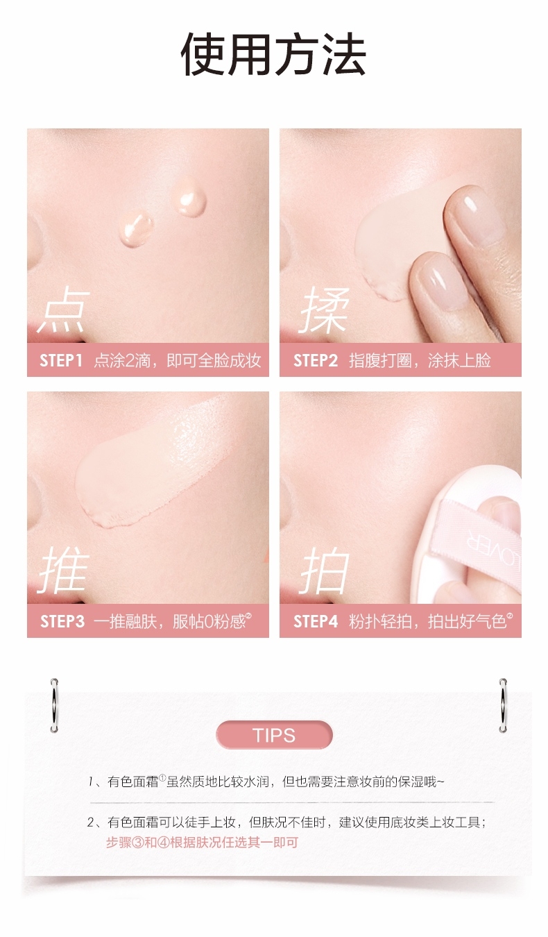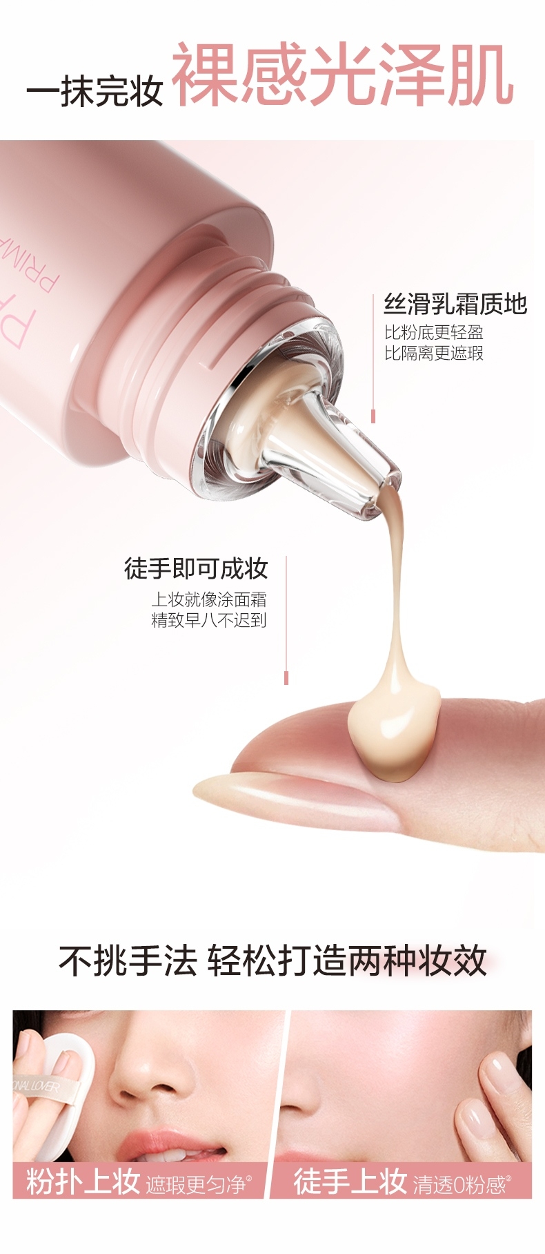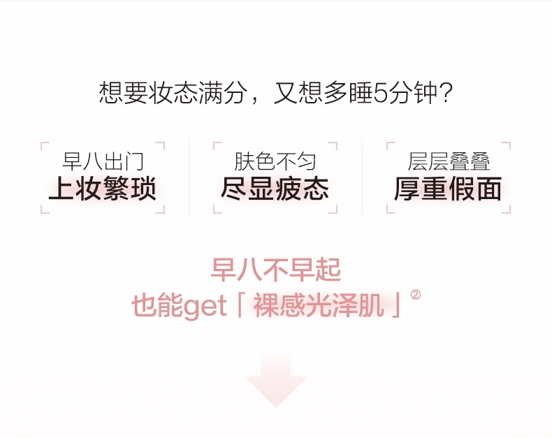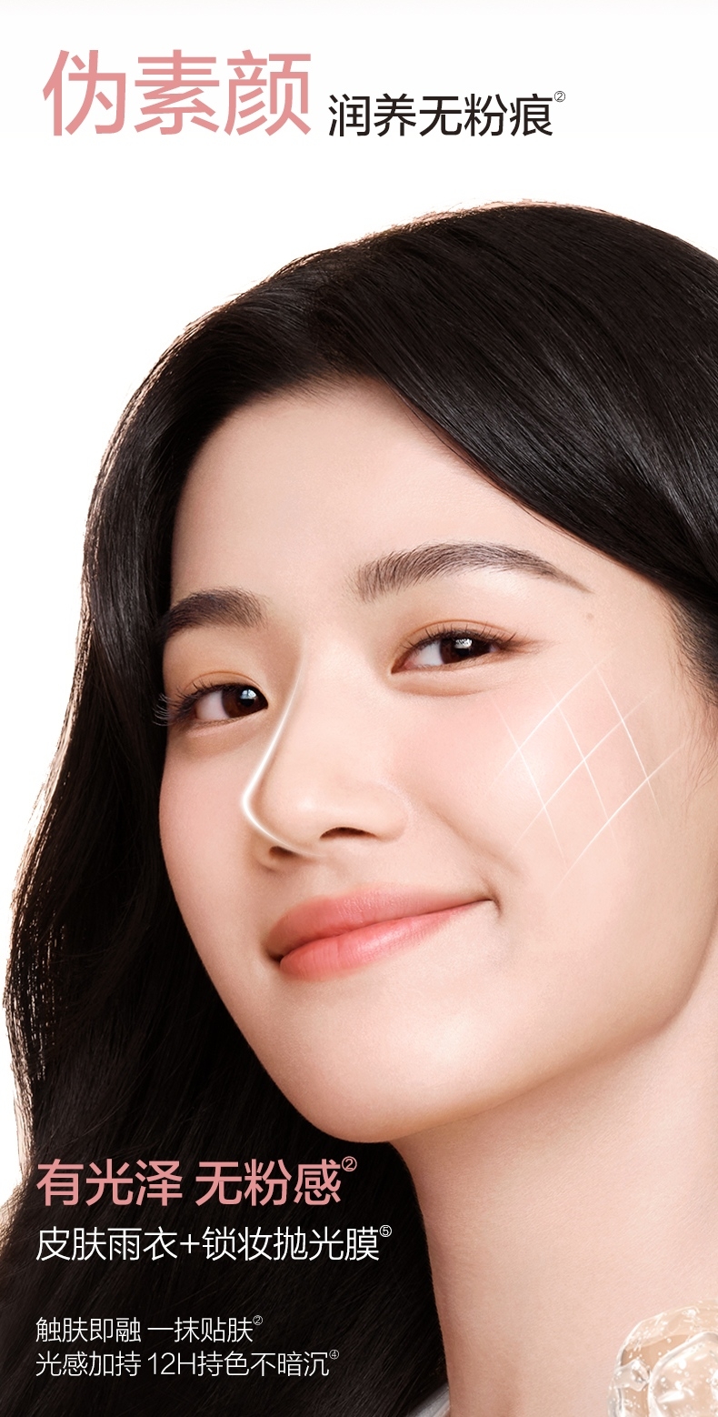 只见气色润,不见粉底痕,伪素颜,真气色;早八不早起,也能get裸感光泽肌;滋润、更养肤,超服帖、超轻盈;一抹完妆,裸感光泽肌