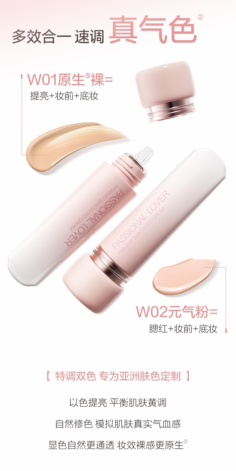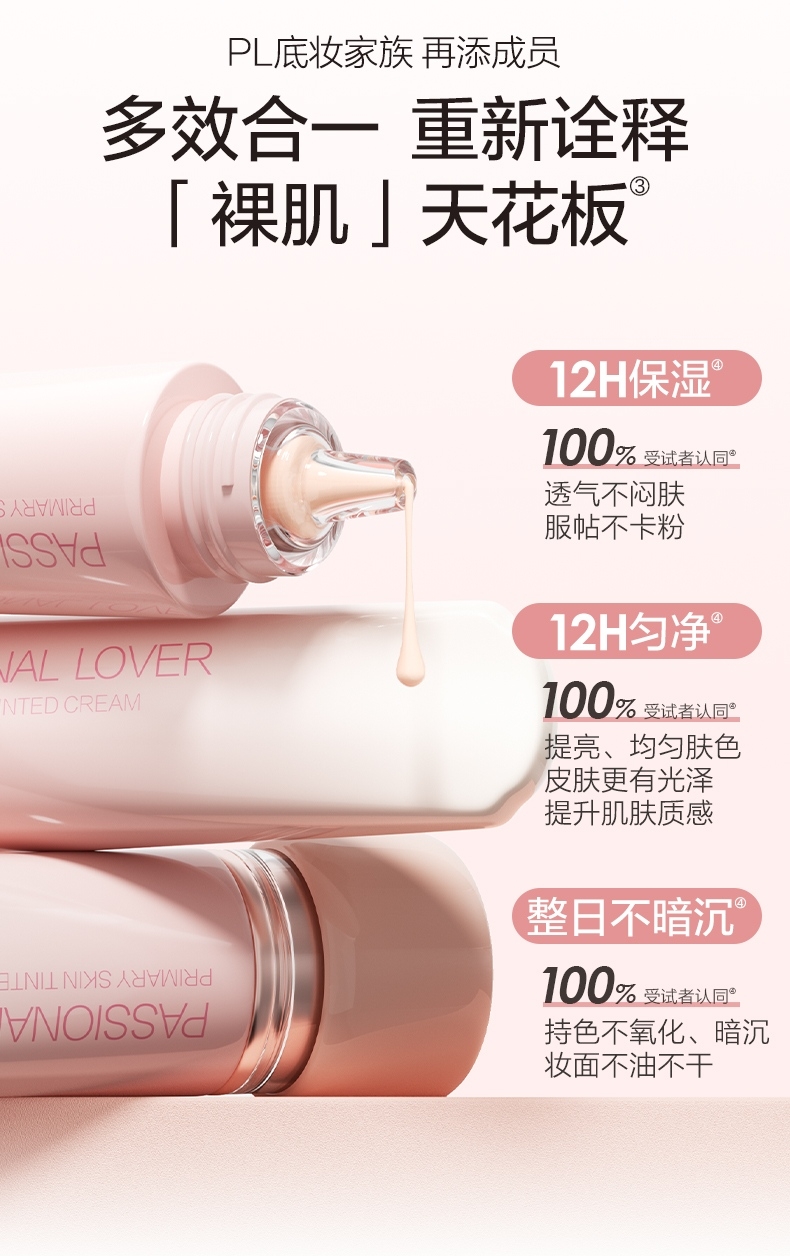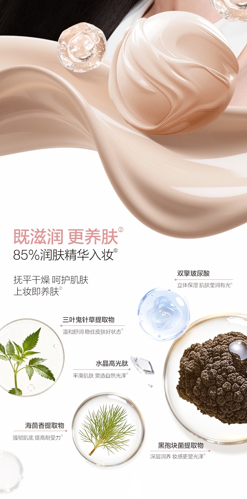 只见气色润,不见粉底痕,伪素颜,真气色;早八不早起,也能get裸感光泽肌;滋润、更养肤,超服帖、超轻盈;一抹完妆,裸感光泽肌