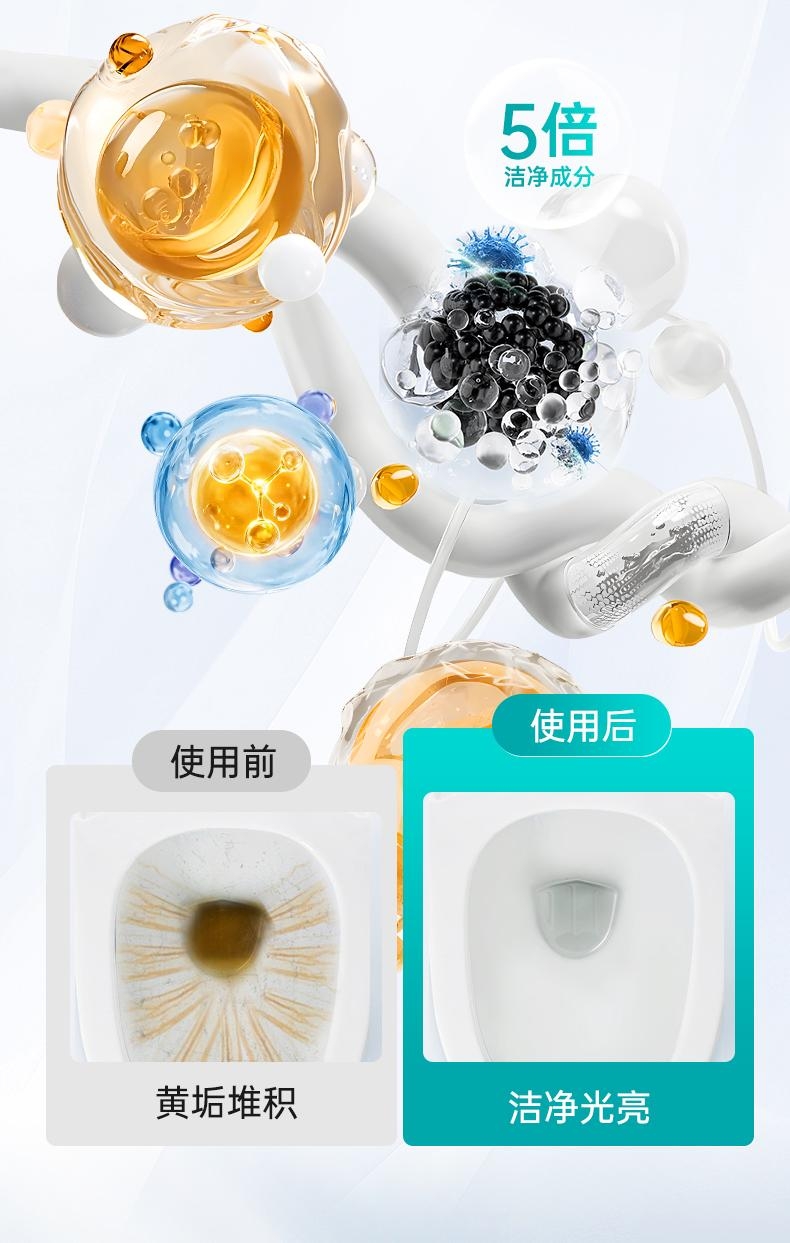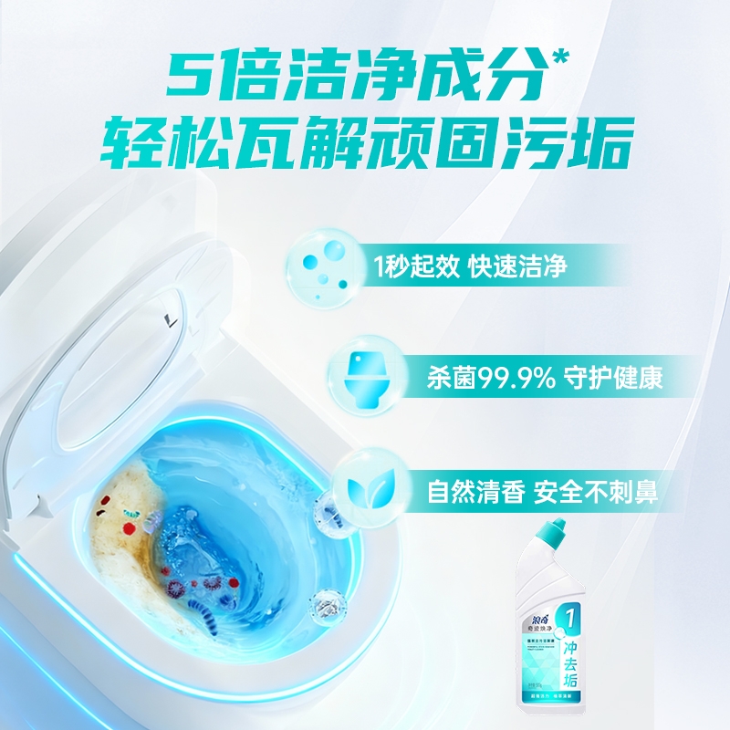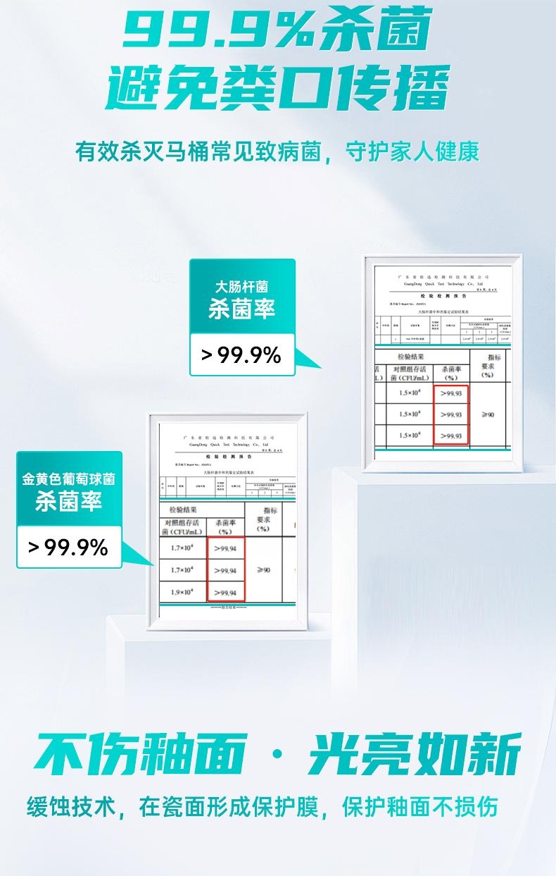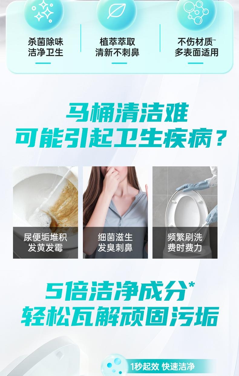 除菌率高达99.9%,易冲洗无残留;高效除菌,保护全家健康;易冲洗配方;1秒快速瓦解尿垢、便渍、异味等污垢