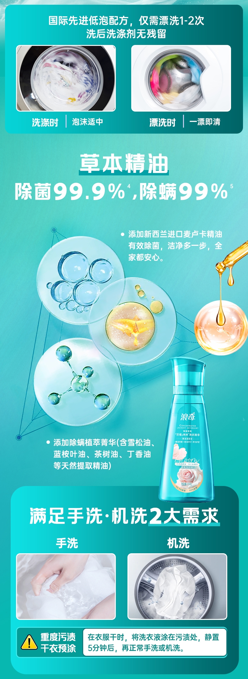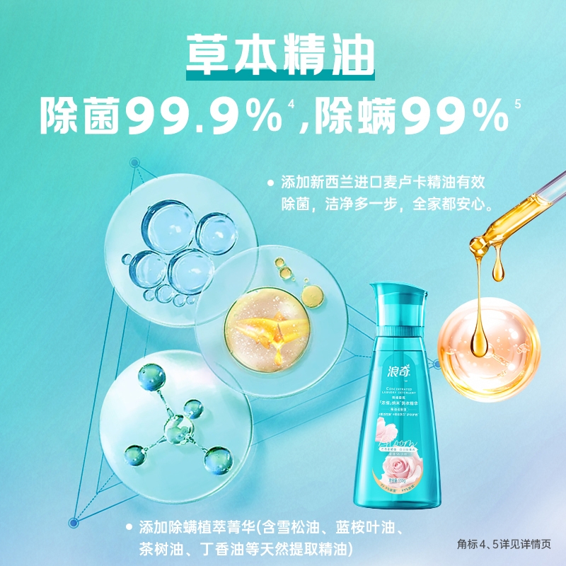 长效留香96小时以上,去异味去汗味。;四维洁净动力系统,纳米级去渍,4倍去渍力。;进口草本除菌除螨,除菌99.9%&除螨99%。;纤维整理护衣护色,保质感、保光亮。;情绪焕活香氛,唤起特定积极情绪因子。