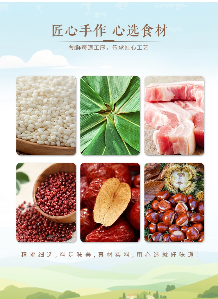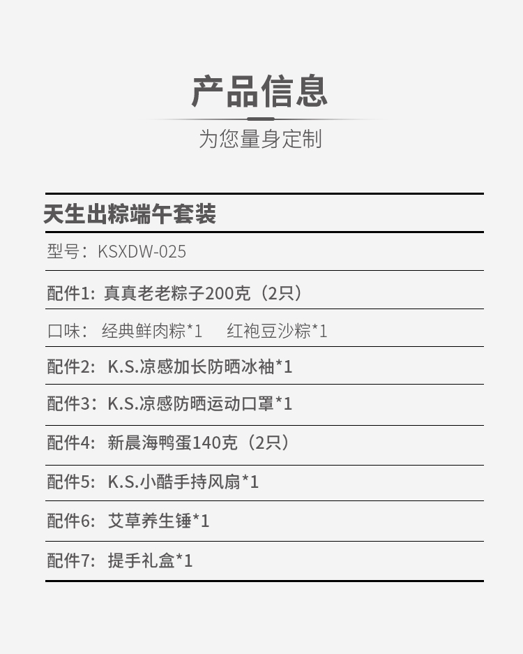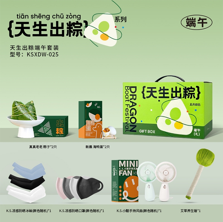 配置清单:1. 真真老老粽子200克(2只) 2. 新晨海鸭蛋 140克(2只) 3. K.S.凉感防晒运动口罩*1 4. K.S.凉感加长防晒冰袖 *1 5. K.S.小酷手持风扇*1 6. 艾草养生锤*1 7. 提手礼盒*1只 真真老老粽子口味(单只100g): 经典鲜肉粽*1 红袍豆沙粽*1