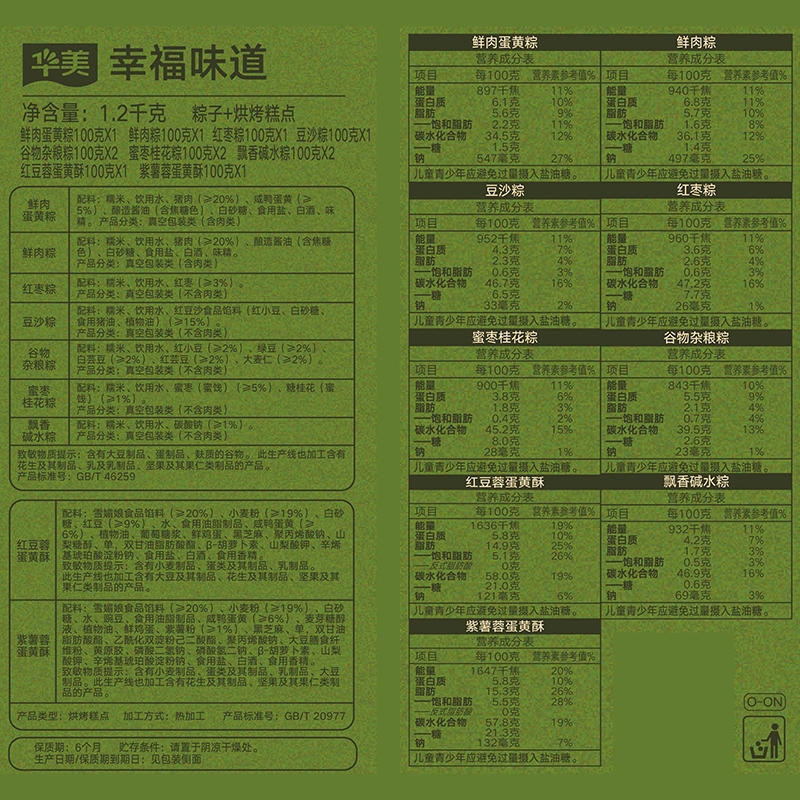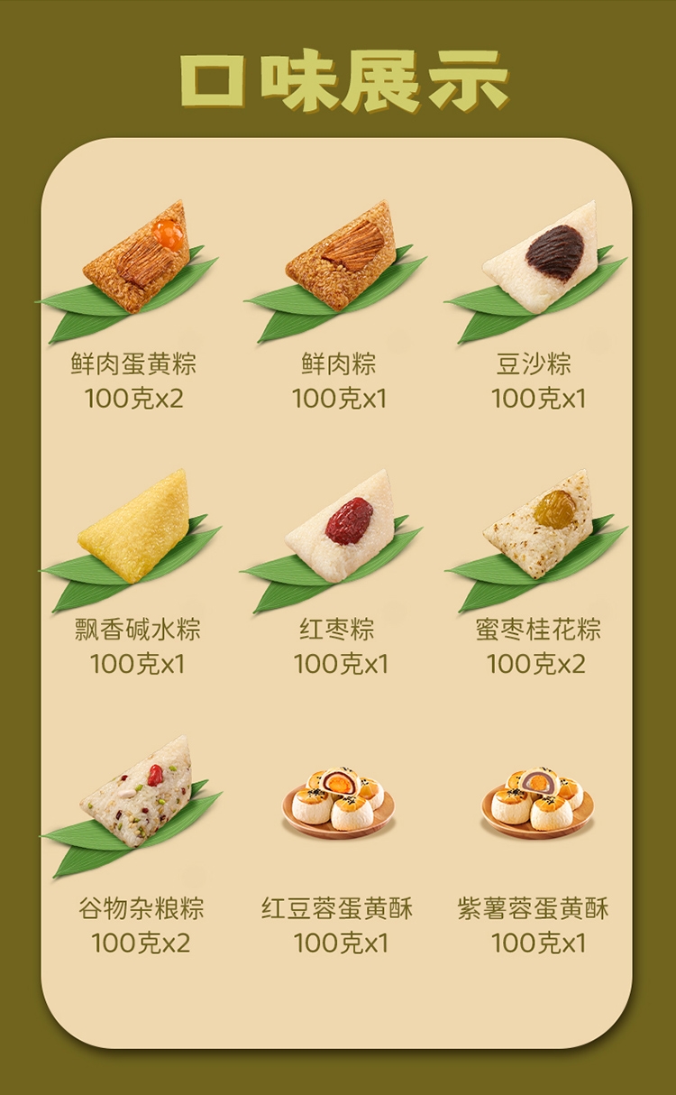 配置清单:鲜肉蛋黄粽 100g *1 鲜肉粽 100g *1 豆沙粽 100g *1 红枣粽 100g *1 谷物杂粮粽 100g *2 蜜枣桂花粽 100g* 2 飘香碱水粽 100g *2 红豆蛋黄酥 100g *1 紫薯蛋黄酥 100g *1