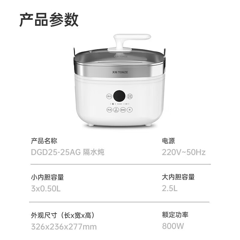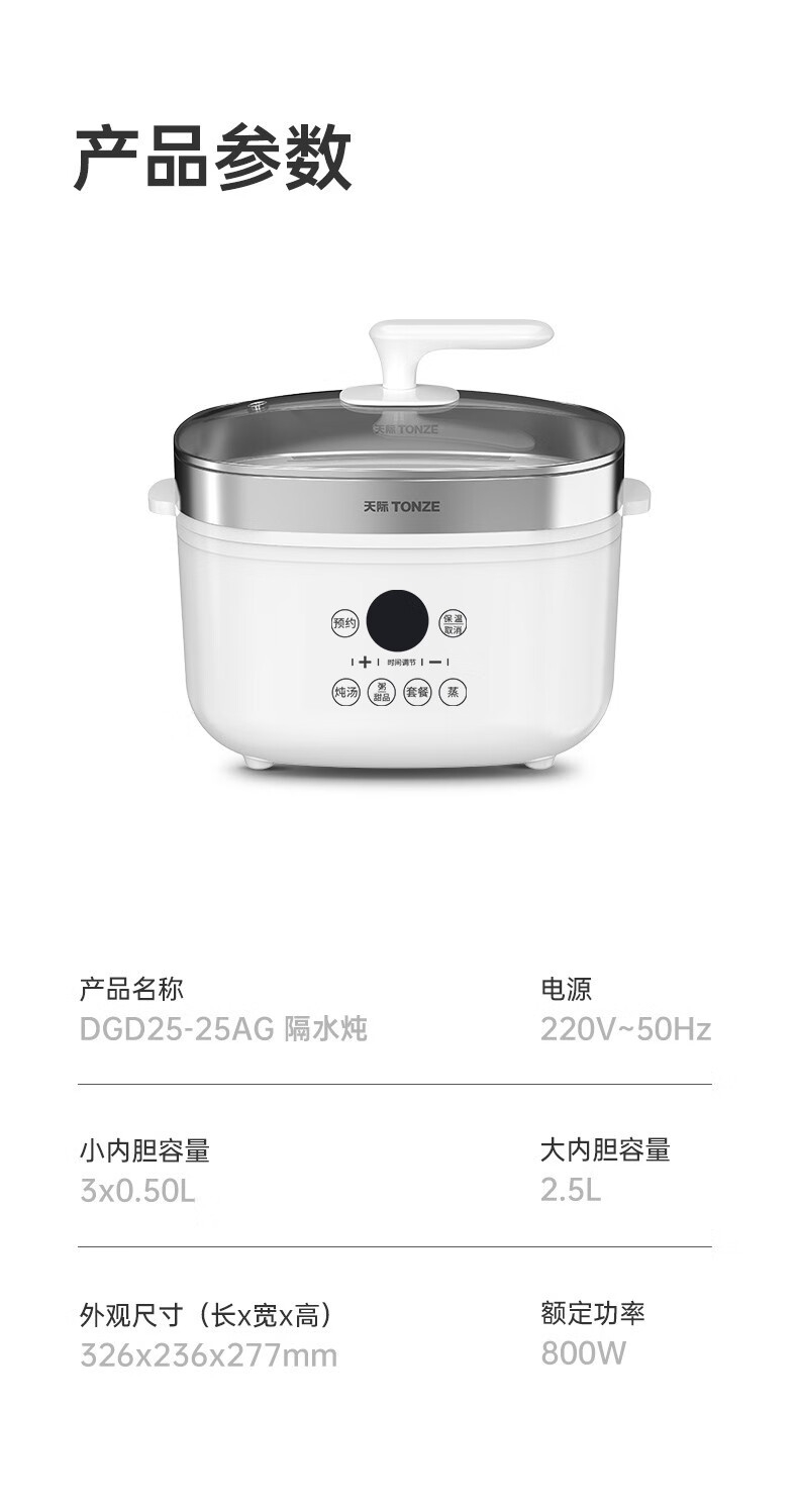 【类型】双层PP;【主要功能】炖汤、粥/甜品、套餐、蒸;【适合人群】家庭、食尚达人