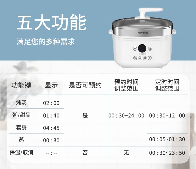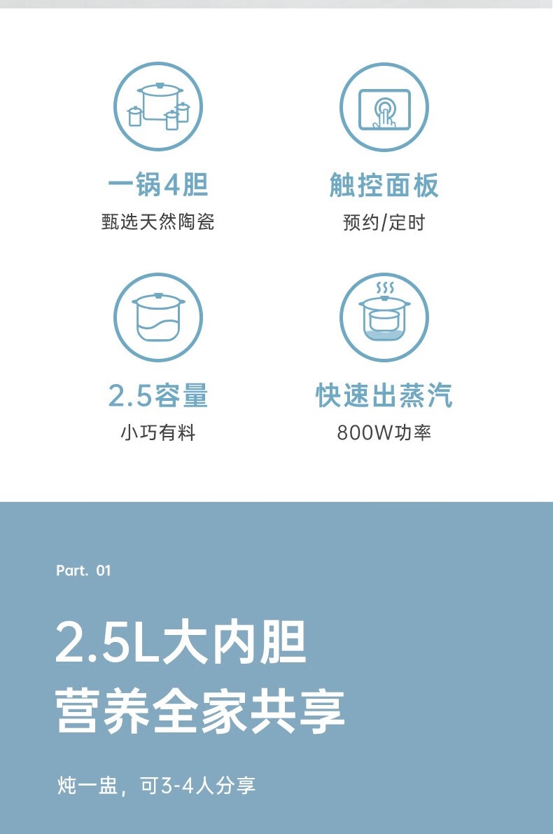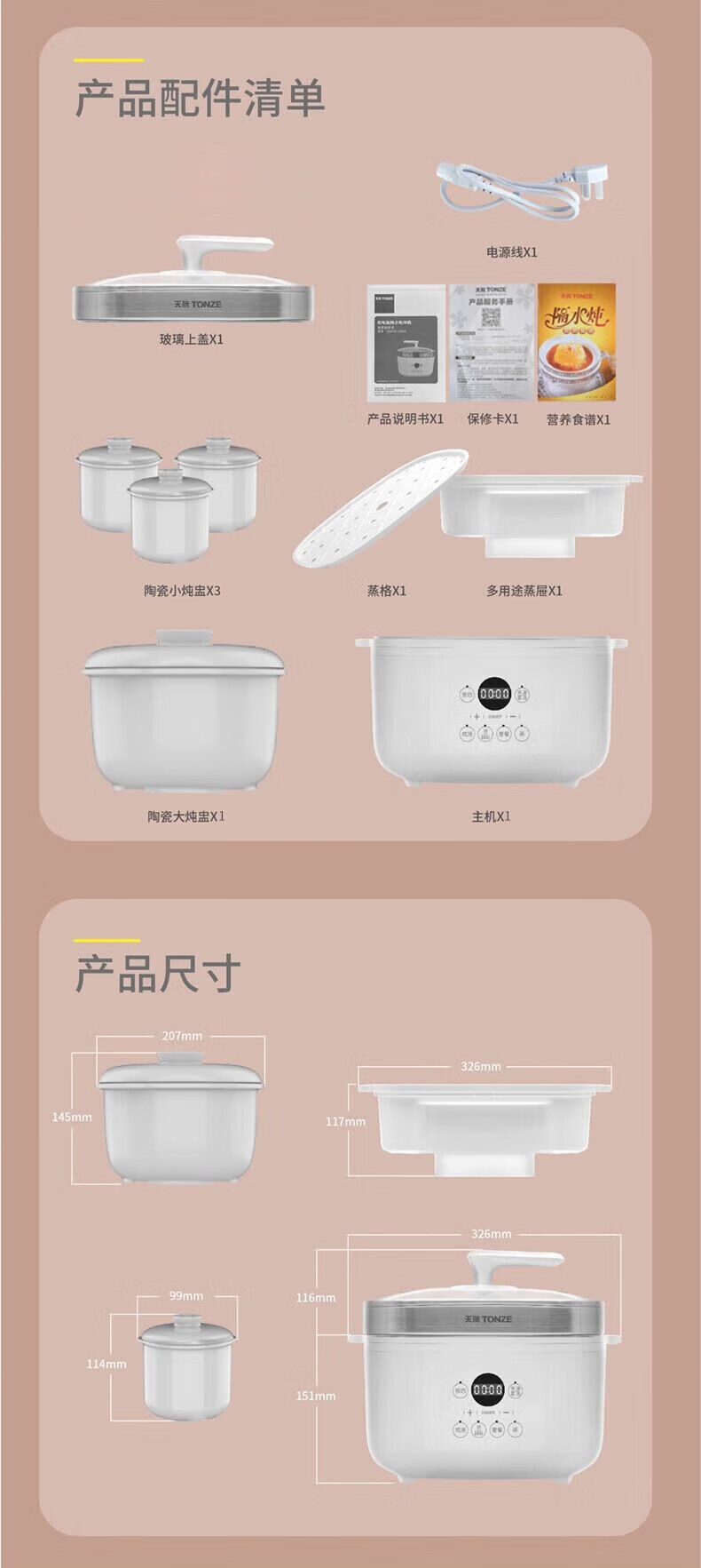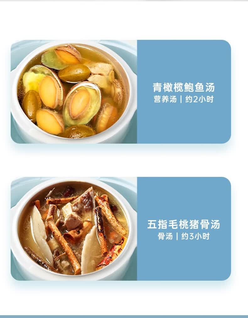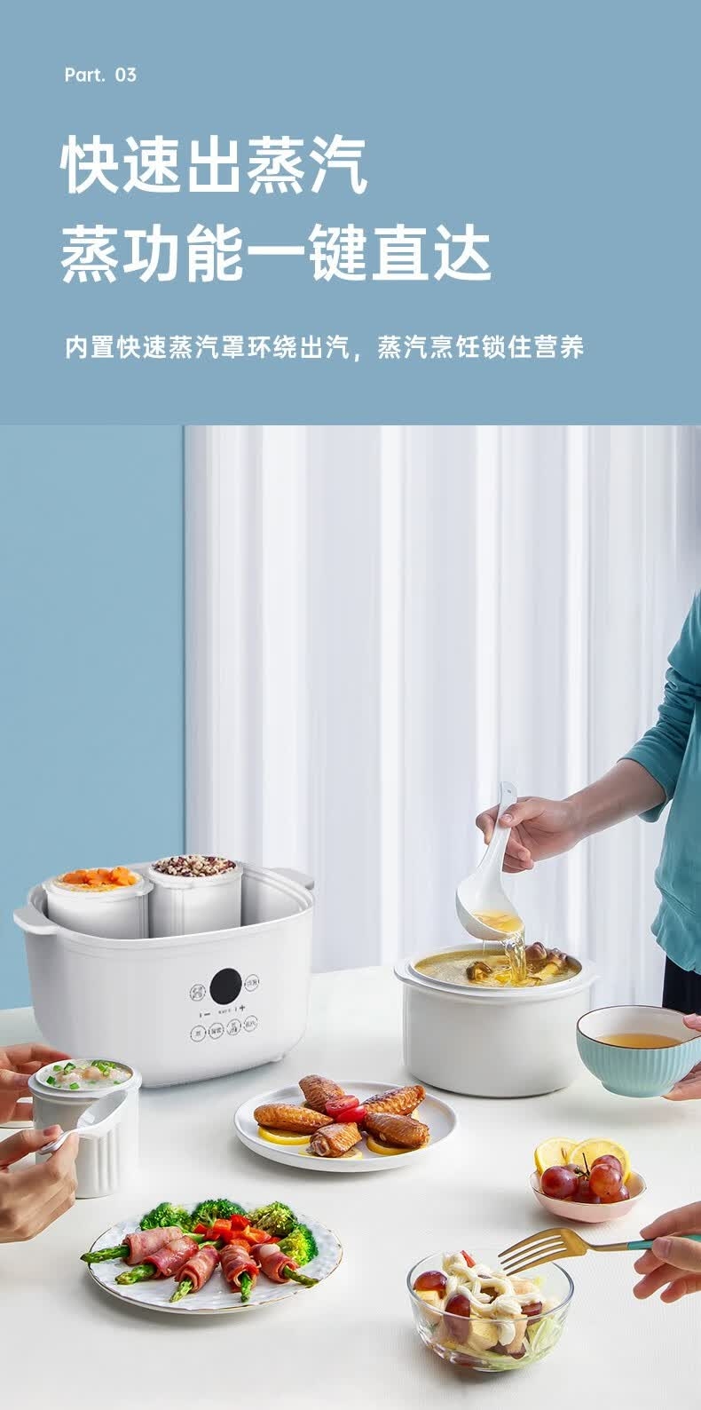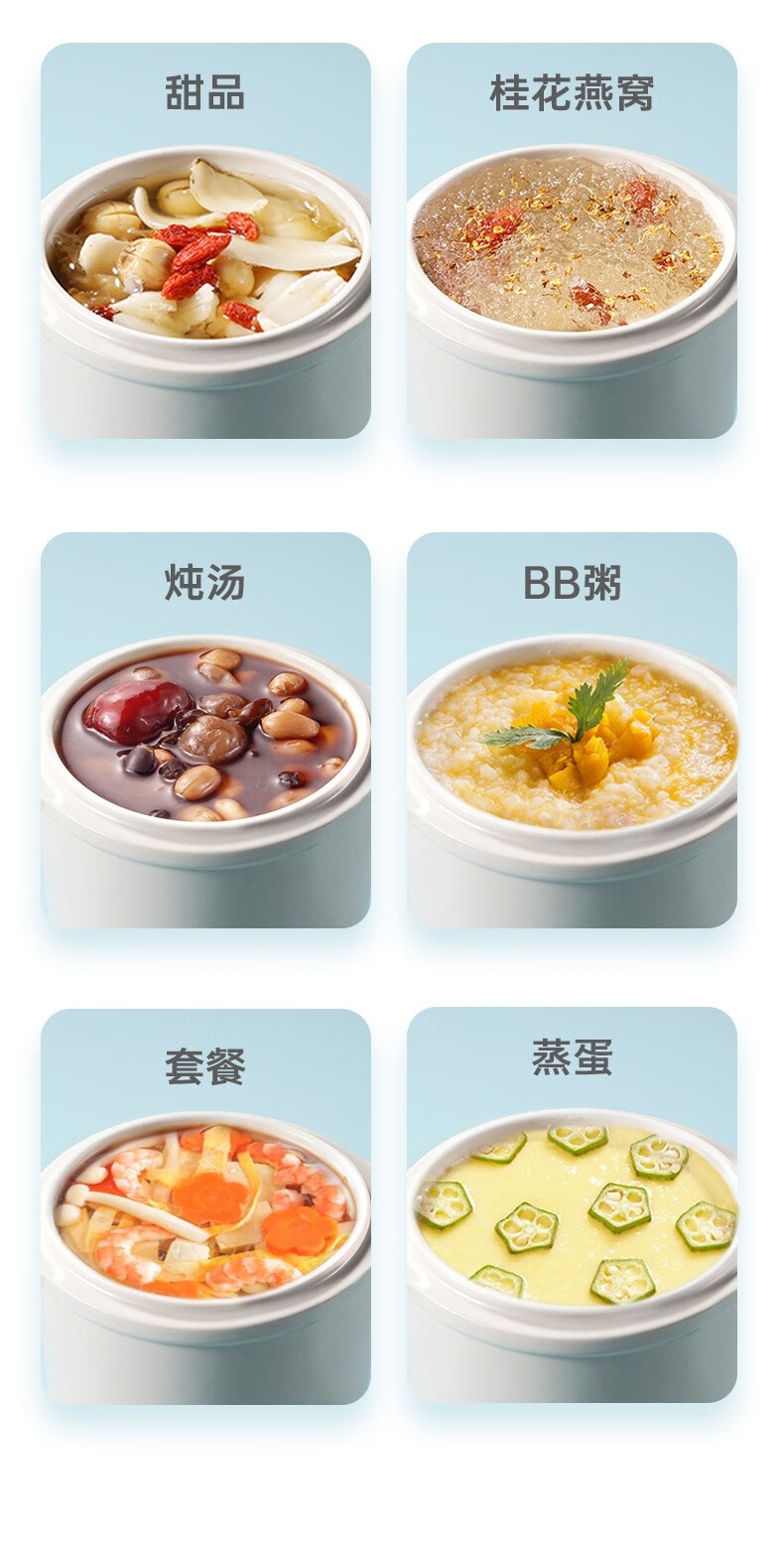 功能:燕窝,营养蒸,蒸蛋羹,卤肉,炖,煮白粥,煮杂粮粥,煮辅食,炖甜品,煲营养汤,炖鱼胶