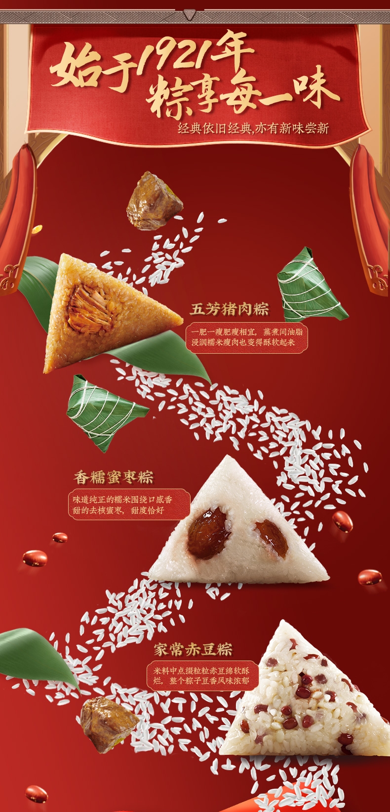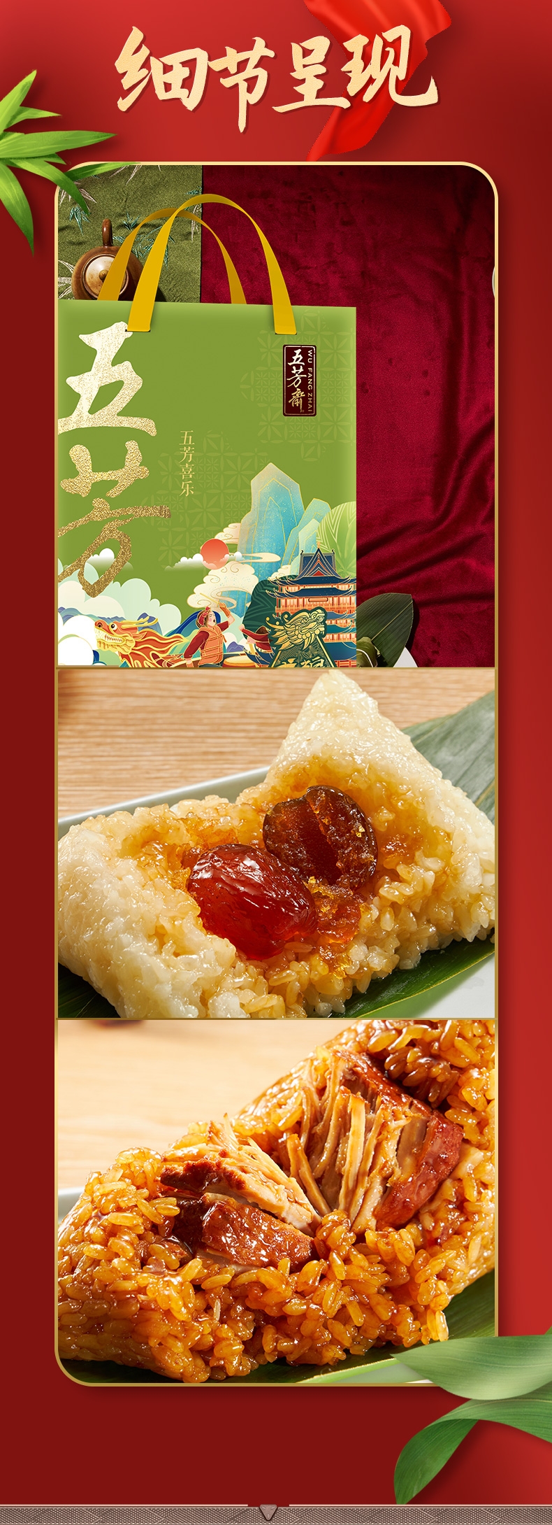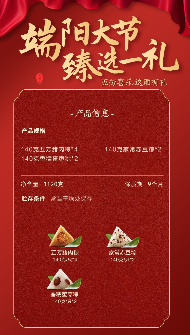 产品配置:五芳猪肉粽140g*2/袋*2 家常赤豆粽140g*2/袋*1 香糯蜜枣140g*2/袋*1