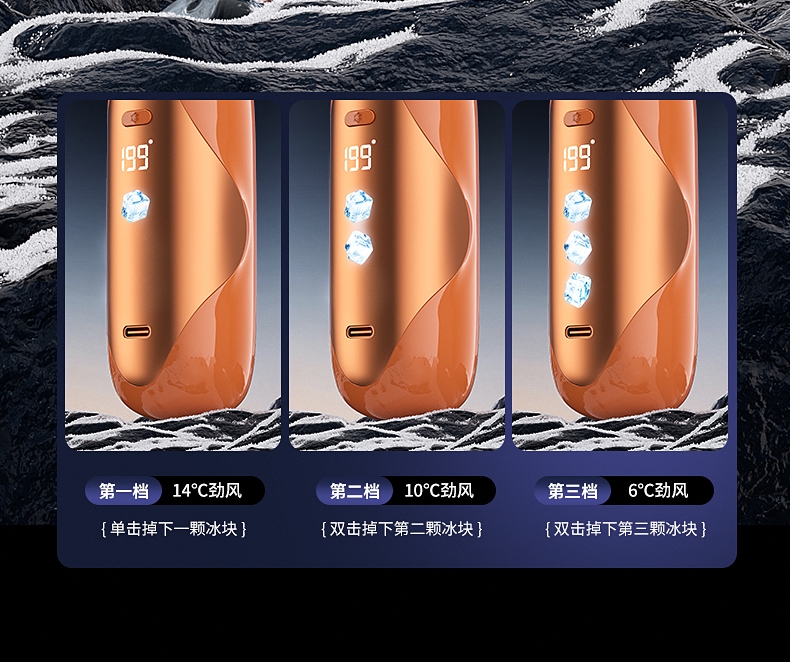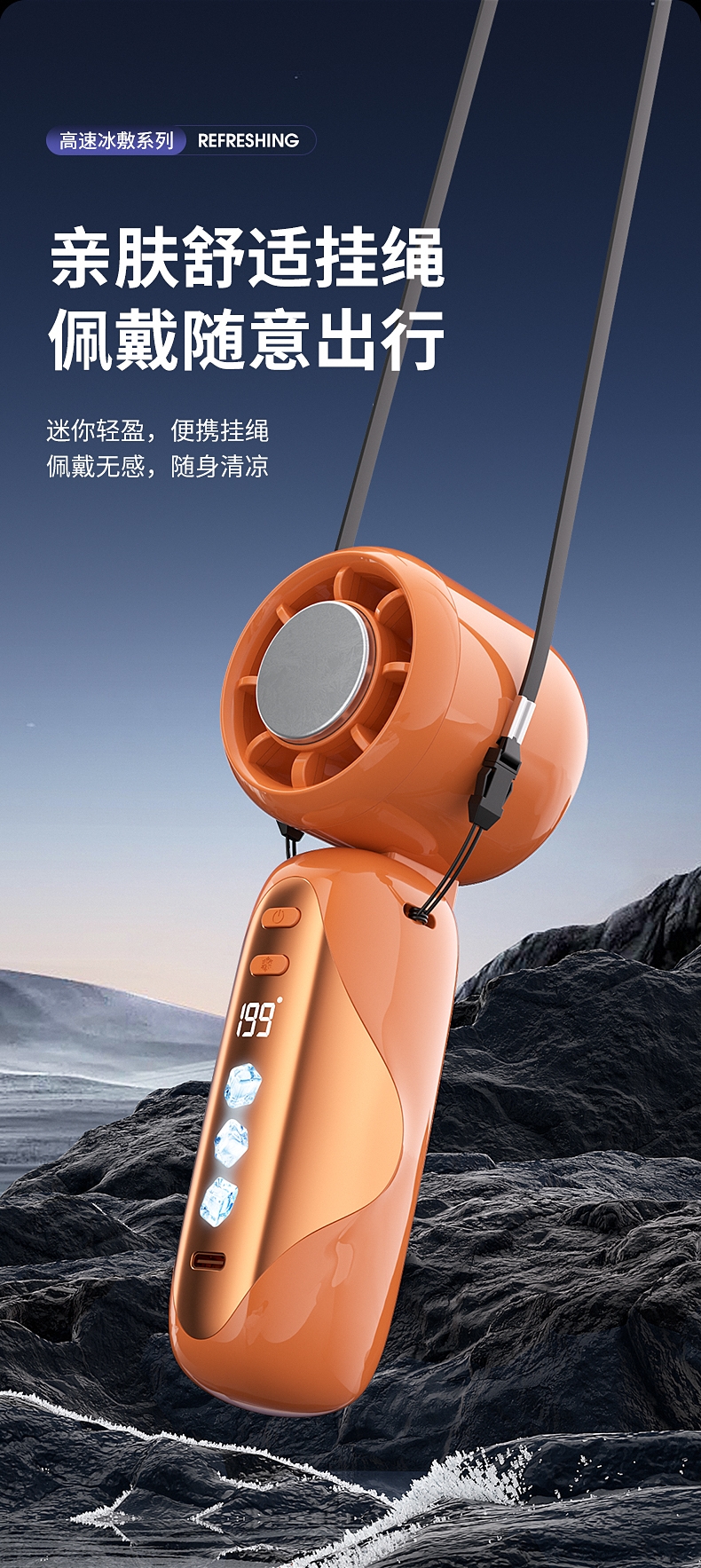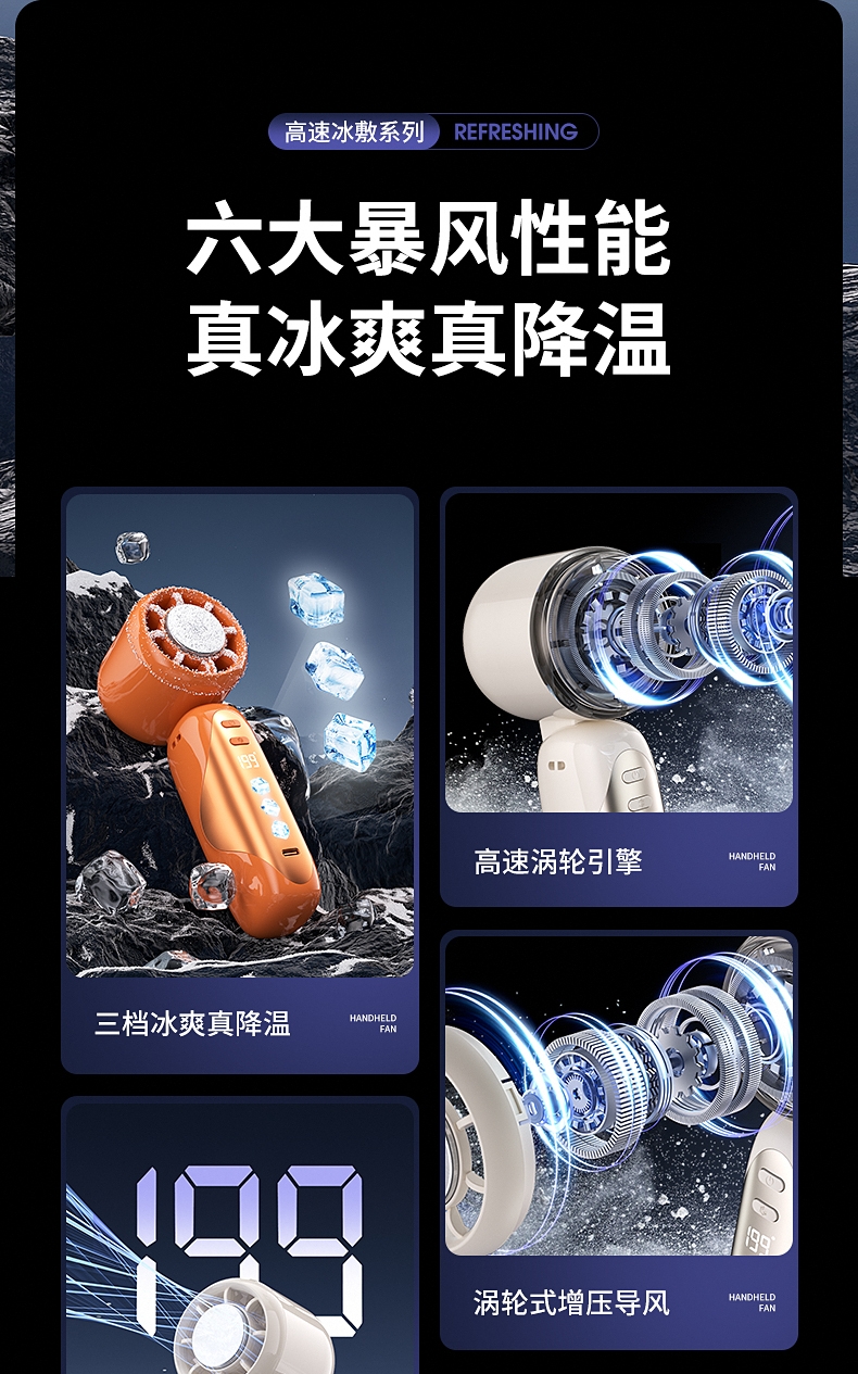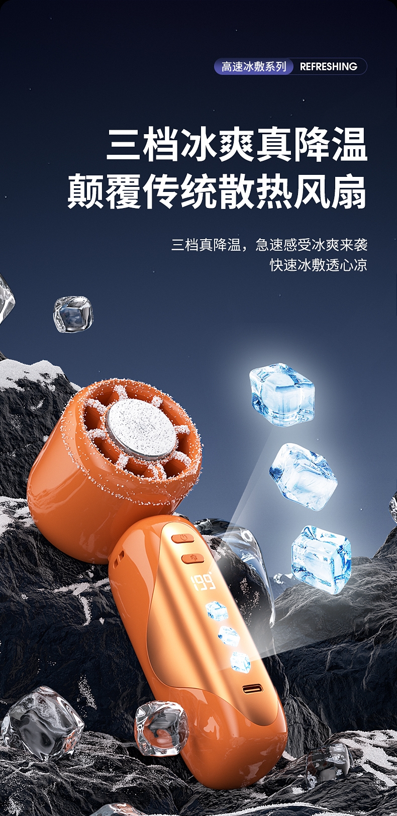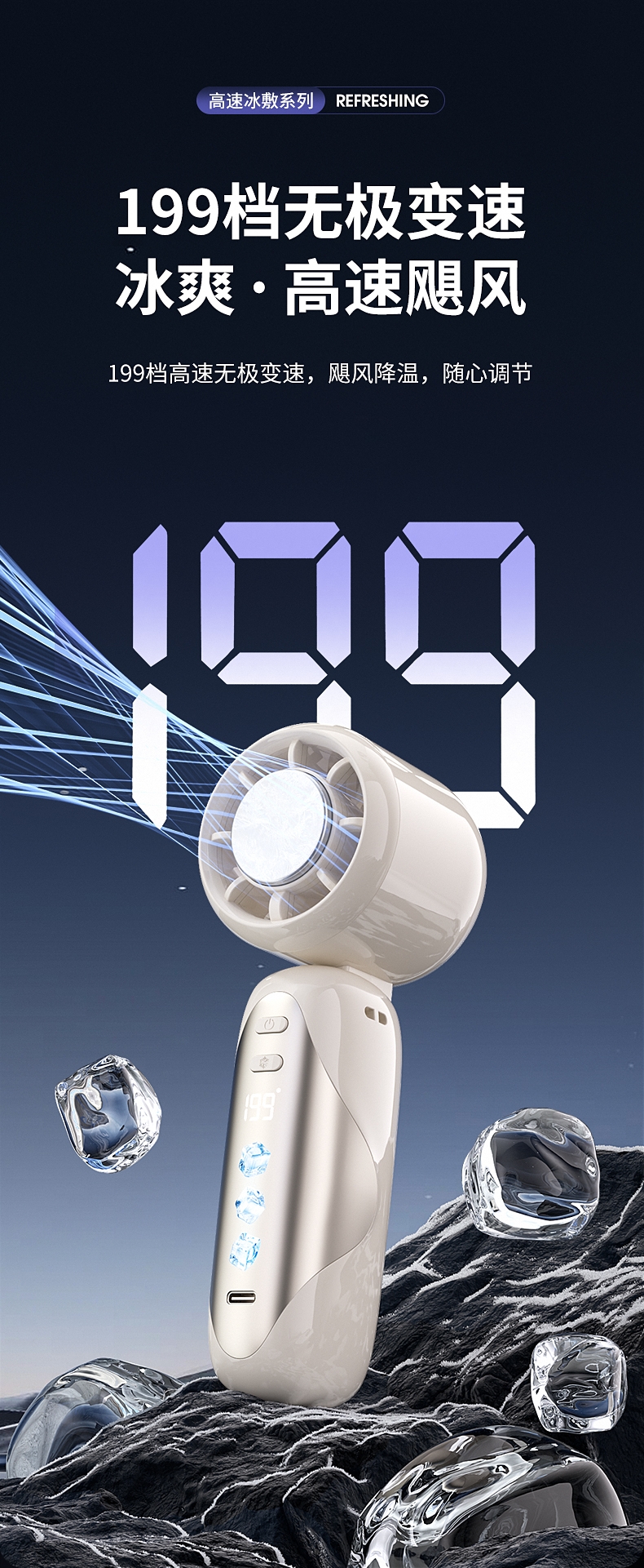 三档制冷调节,极速冰敷降温;199档无极变速,随心调节风力大小;高速涡轮引擎,大风力输出;大容量聚能电池 持久续航;可挂可立可手持,桌面手持多场景使用