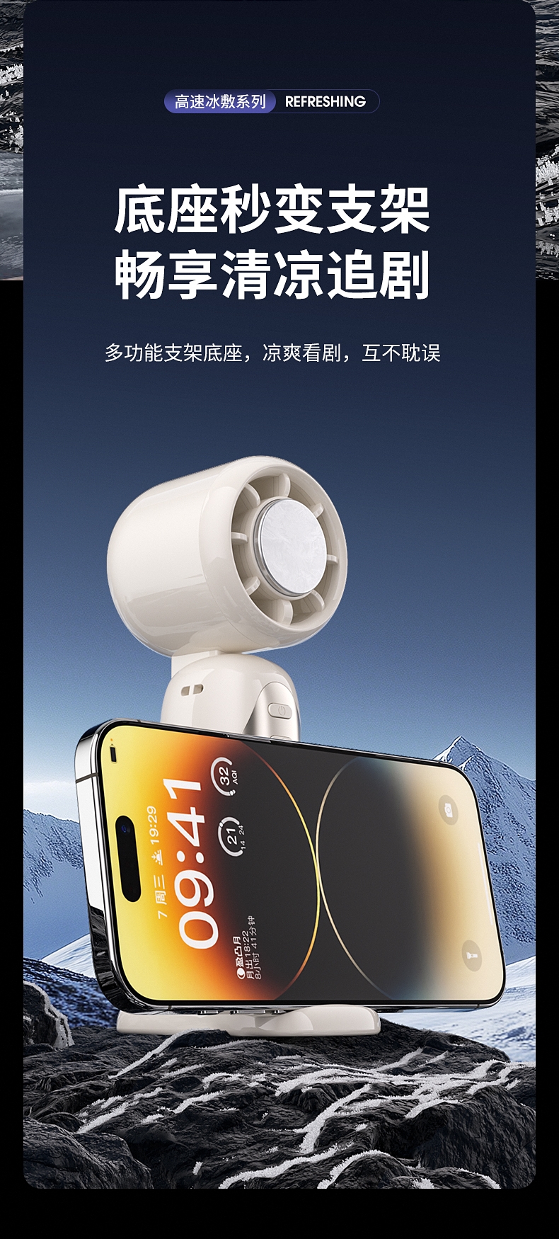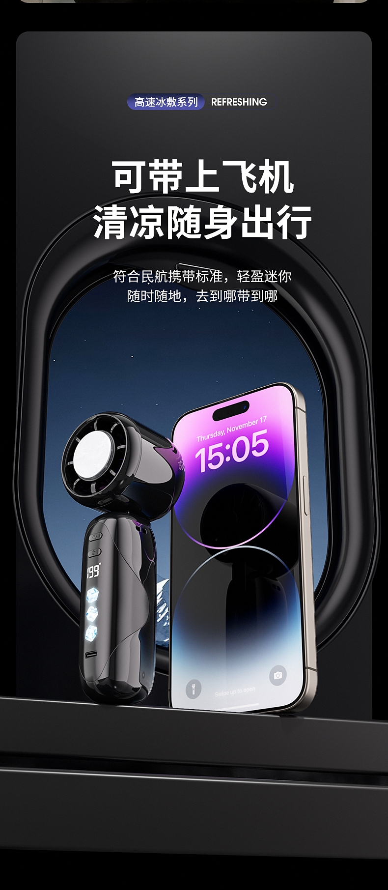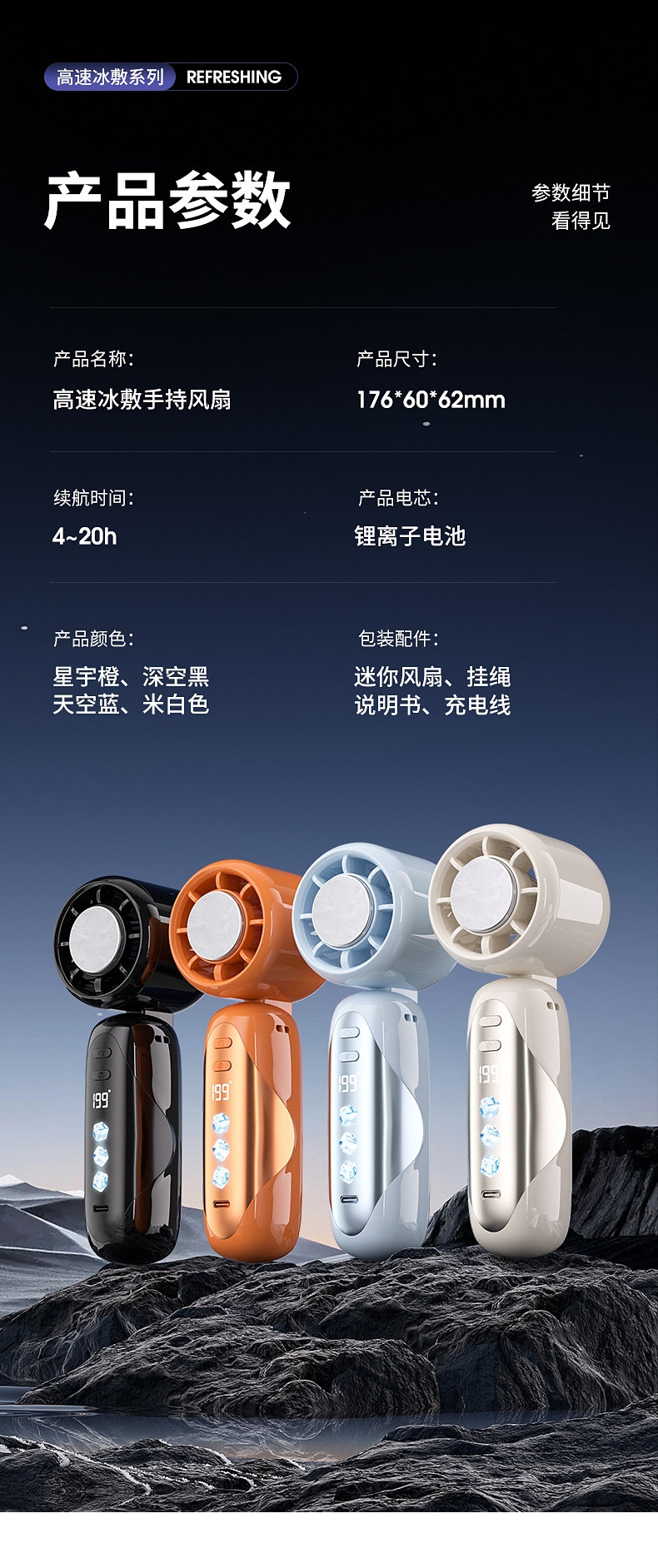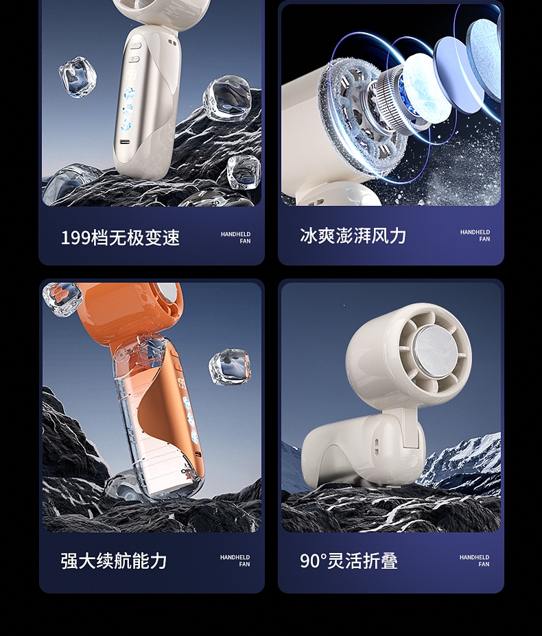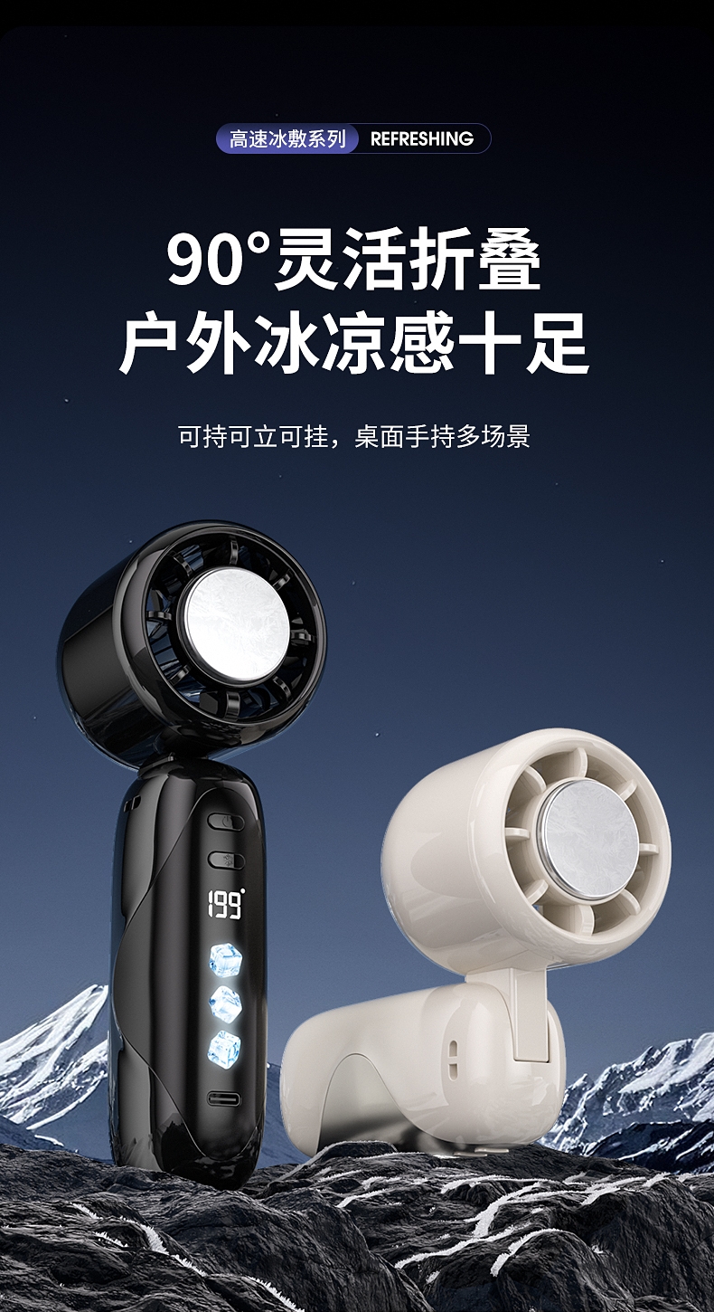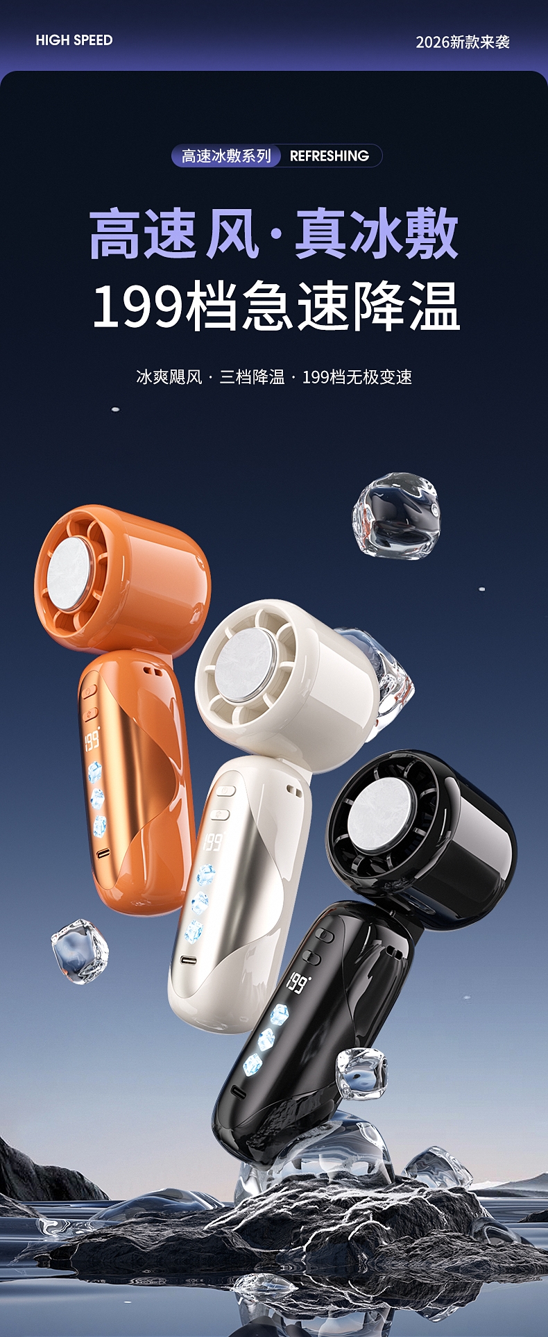 三档制冷调节,极速冰敷降温;199档无极变速,随心调节风力大小;高速涡轮引擎,大风力输出;大容量聚能电池 持久续航;可挂可立可手持,桌面手持多场景使用