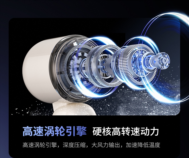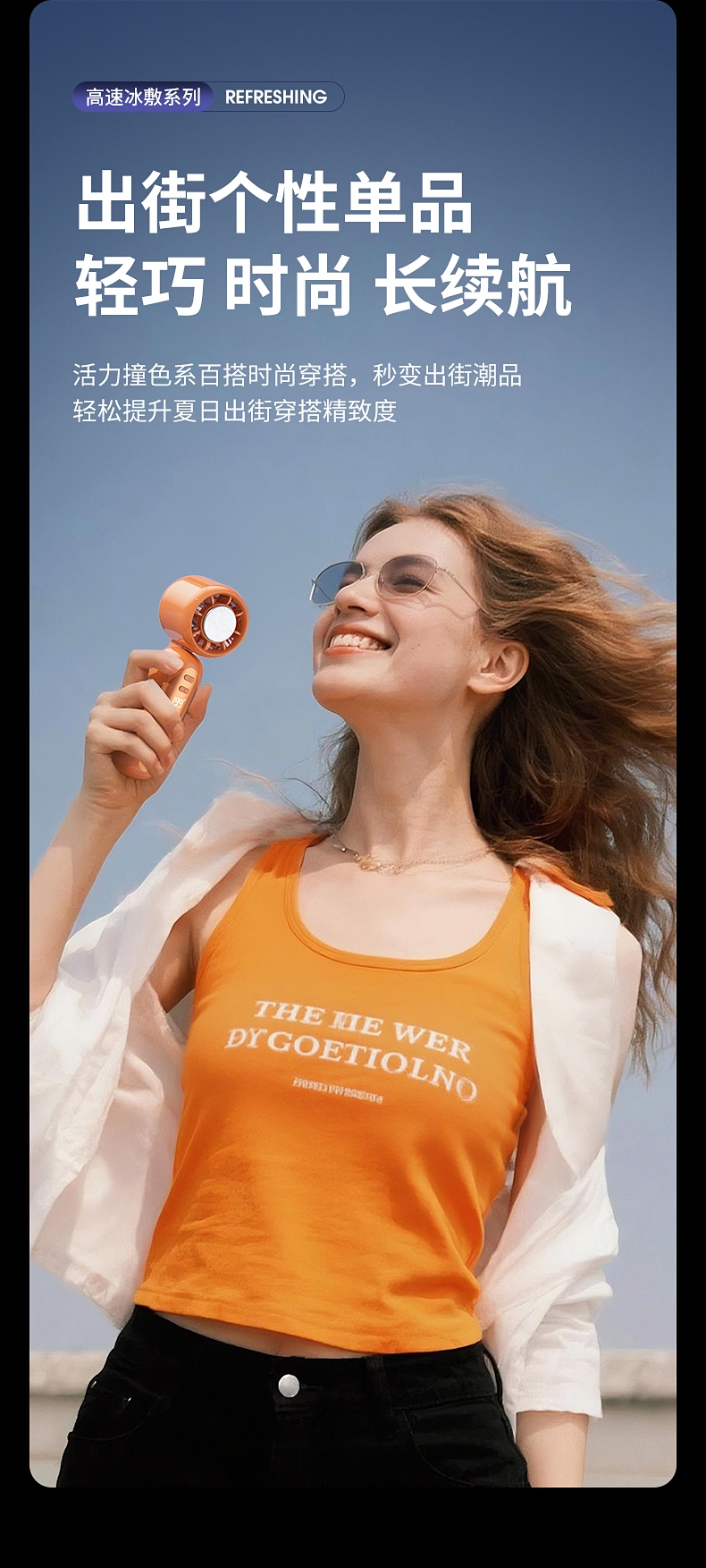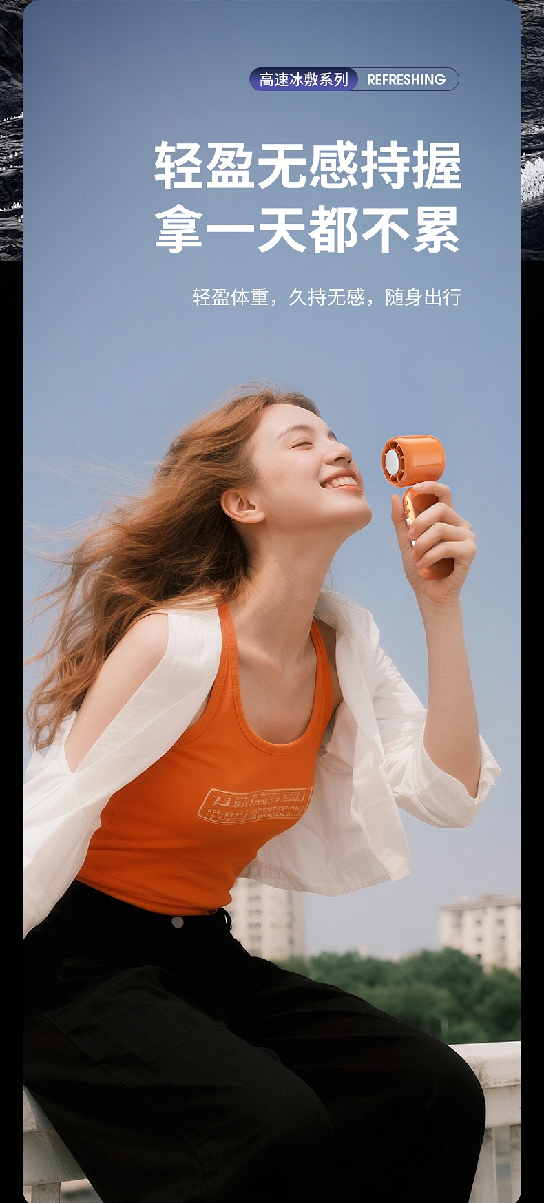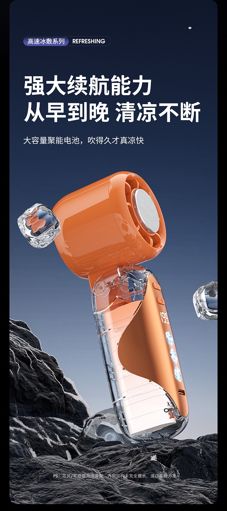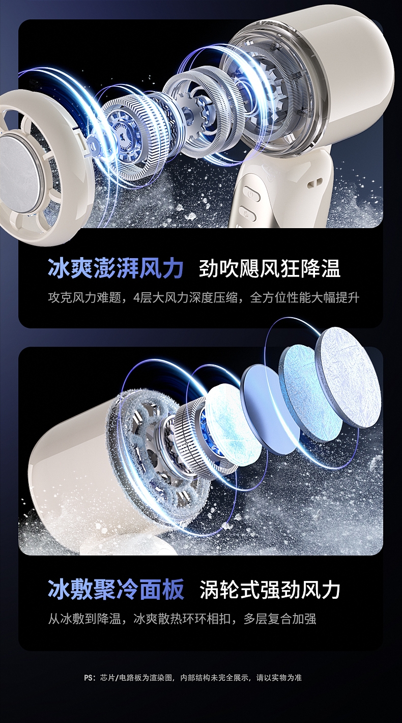三档制冷调节,极速冰敷降温;199档无极变速,随心调节风力大小;高速涡轮引擎,大风力输出;大容量聚能电池 持久续航;可挂可立可手持,桌面手持多场景使用