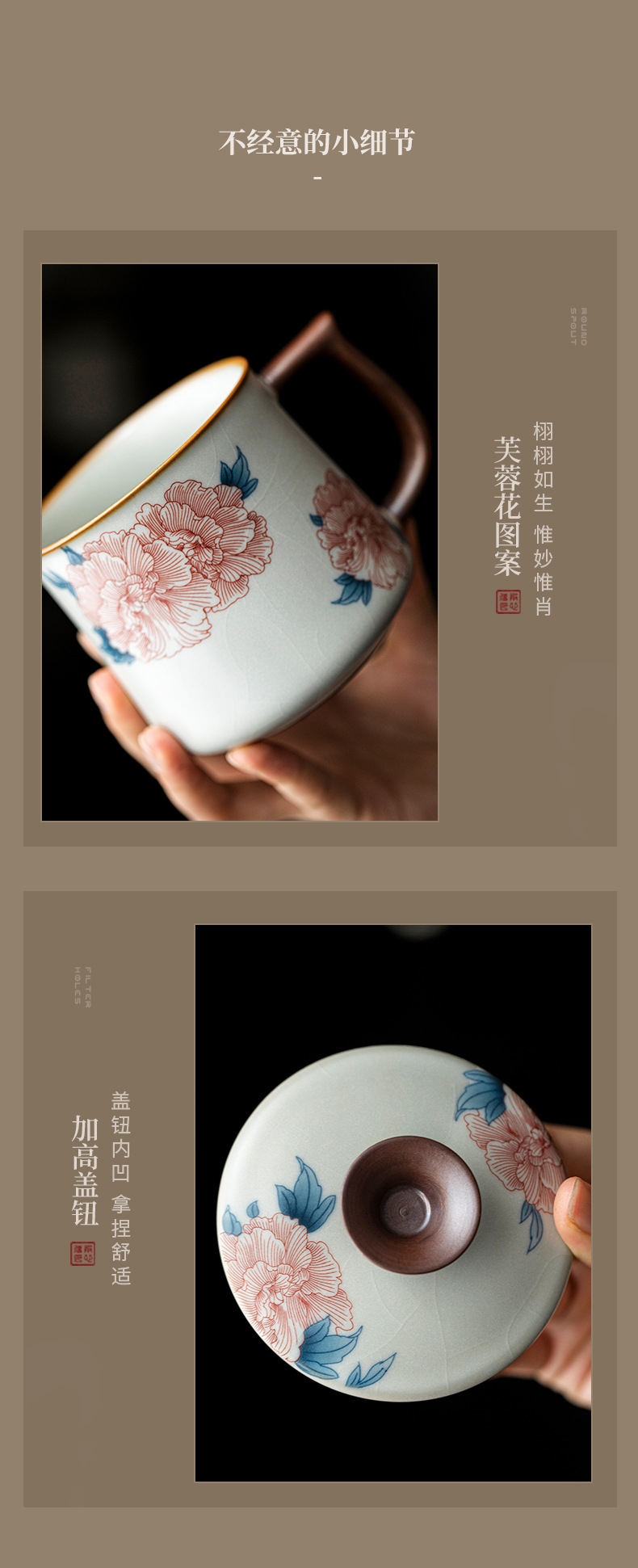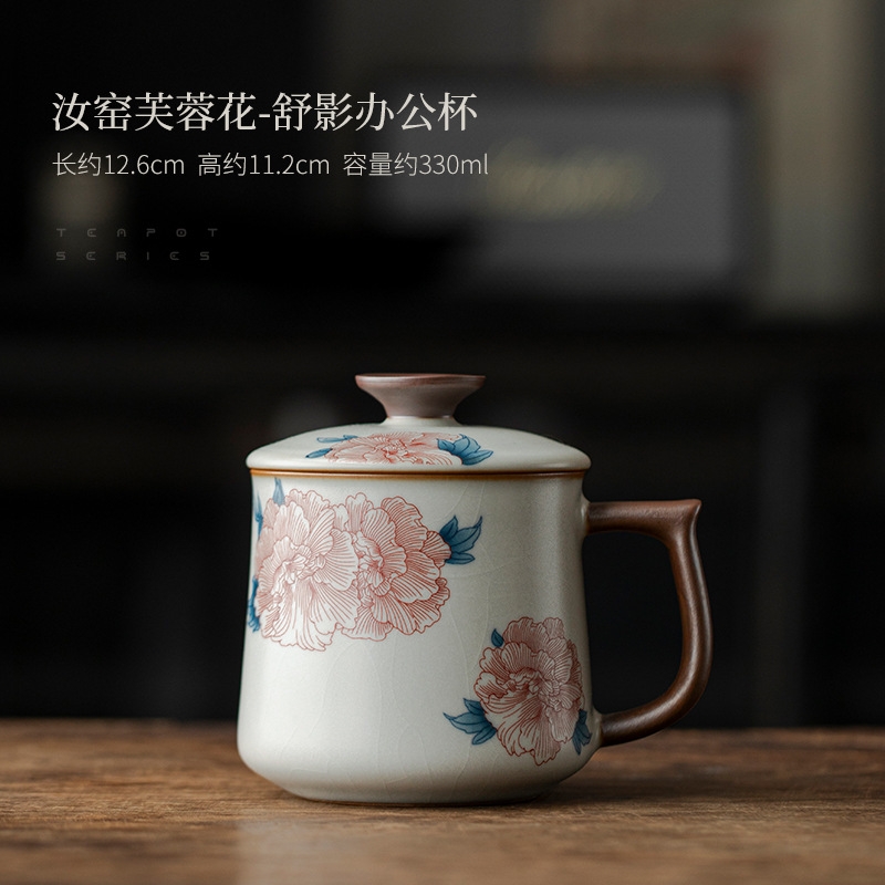 母亲节芙蓉花,亚黄汝瓷,玛瑙入釉,蝉翼开片;家有千财万贯,不如汝窑一片。独家专利技术新品;画面堆料技术,富有立体浮雕质感,真实感强。杯身开片