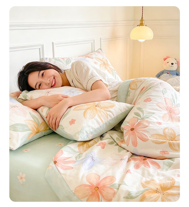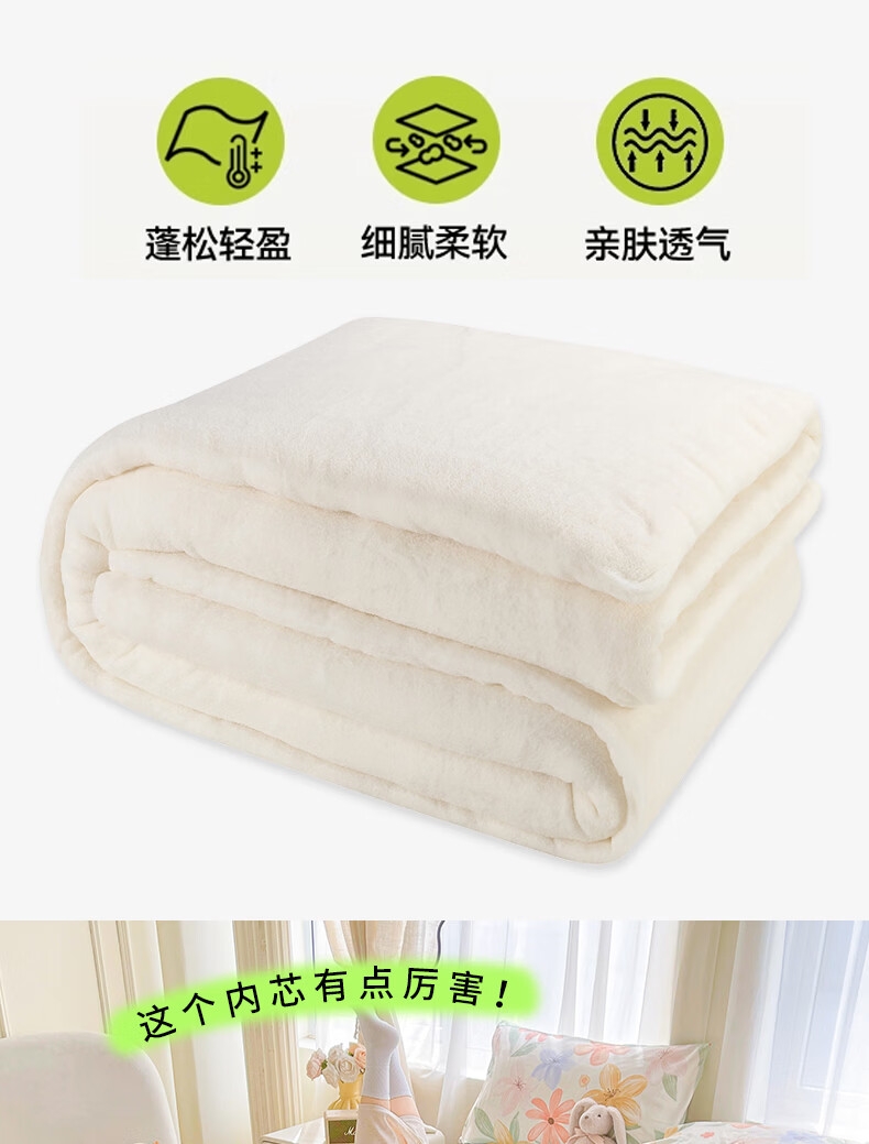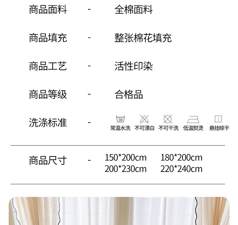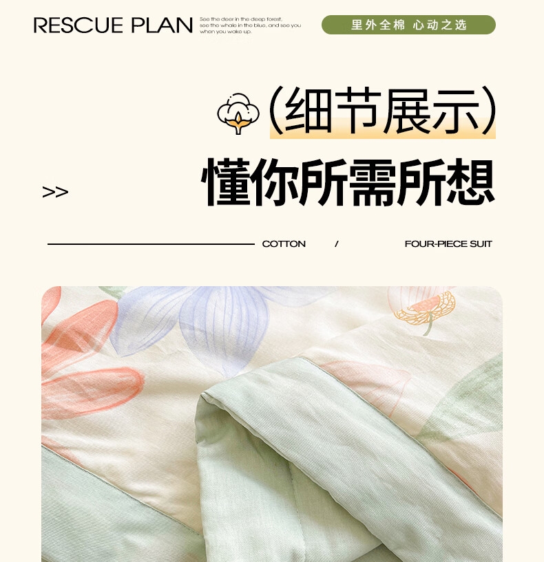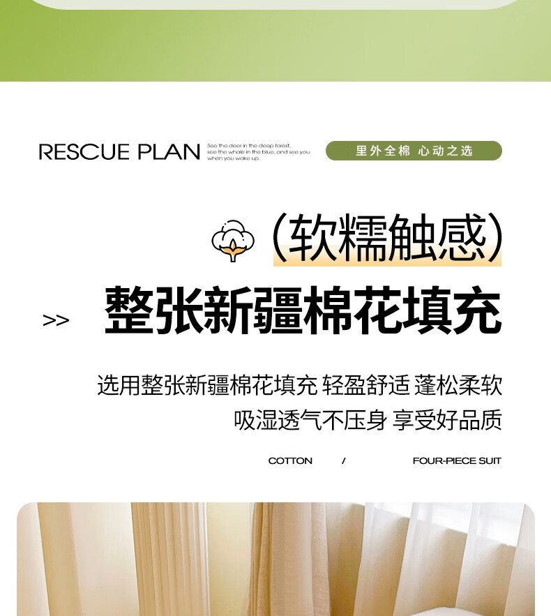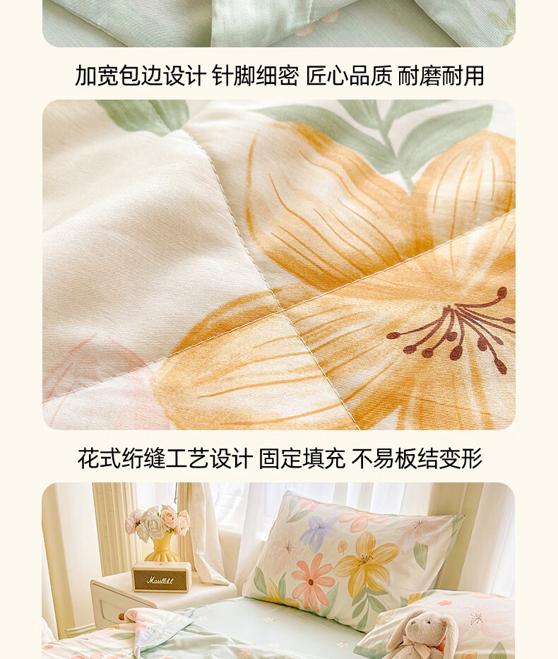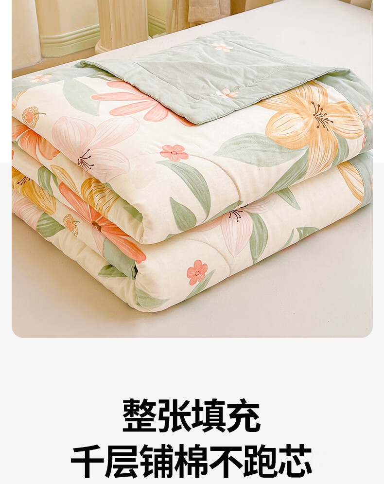 面料甄选上乘棉花,亲肤透气,赋予舒适安心的睡觉体验;采用整张新疆棉花内芯填充,千层铺棉,厚薄均匀;花式绗缝定位设计,固定填充,不跑棉,不易板结变形