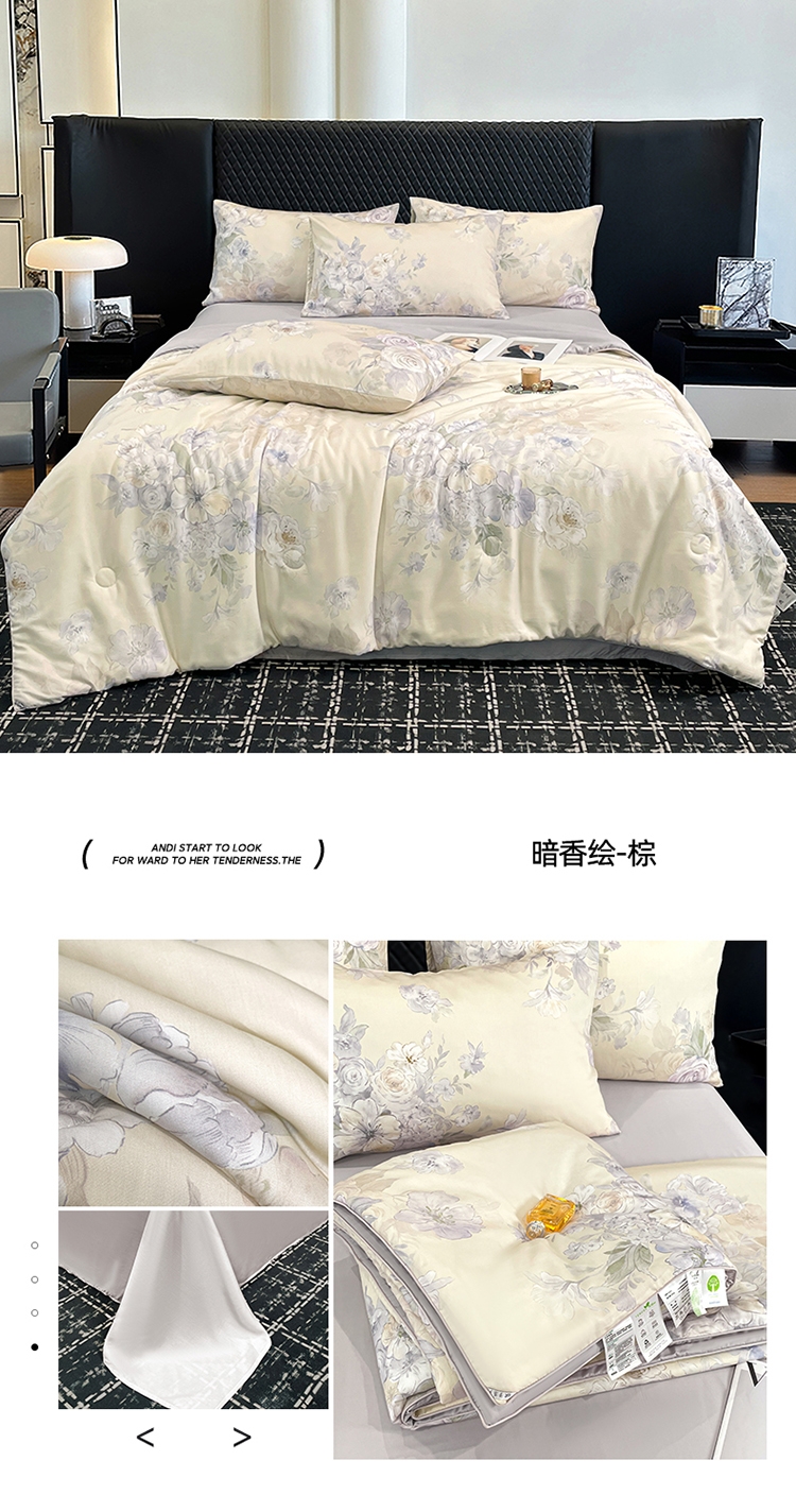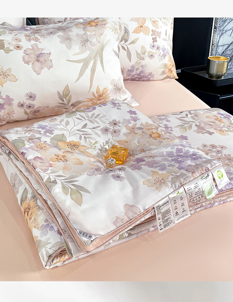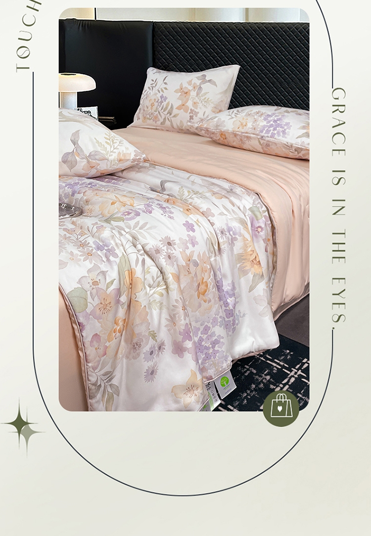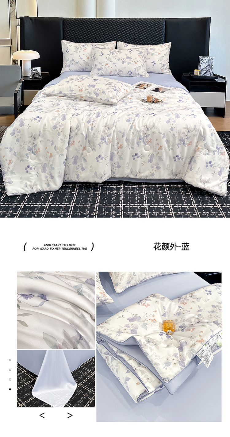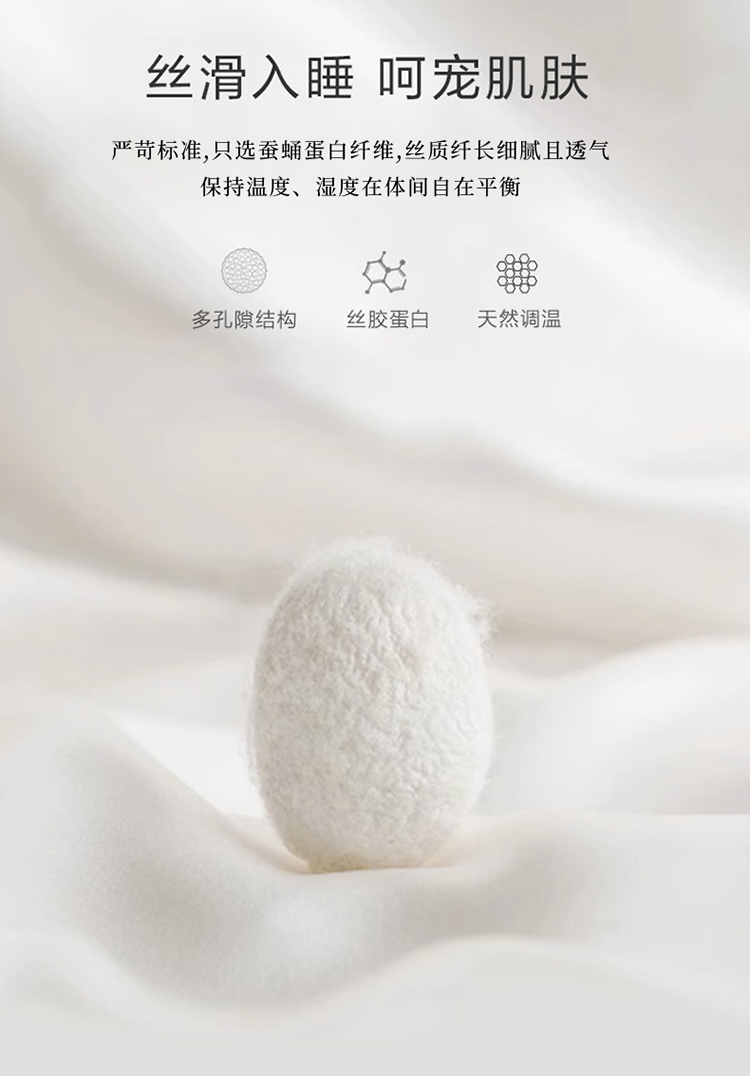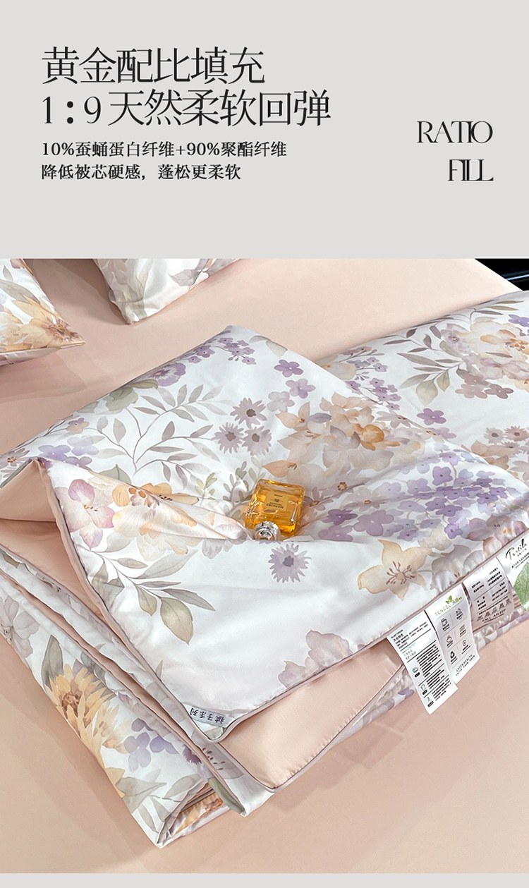 采用亲肤的莱赛尔材质,柔软触感。;蚕蛹蛋白抗菌纤维填充,舒适环保。;新一代印染工艺,色牢度高,不易褪色,色彩靓丽。