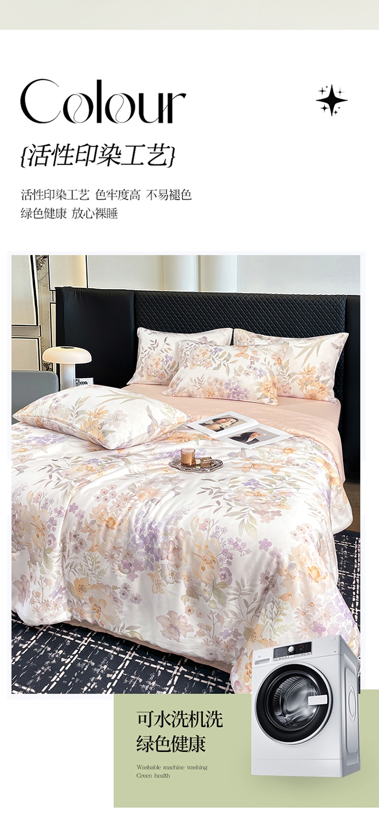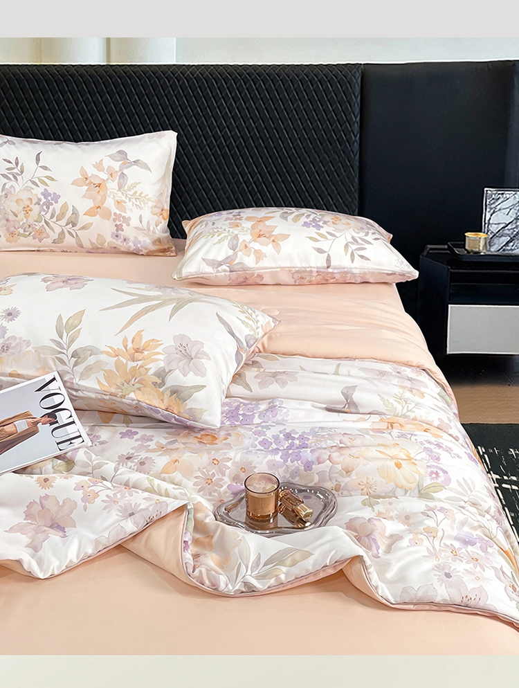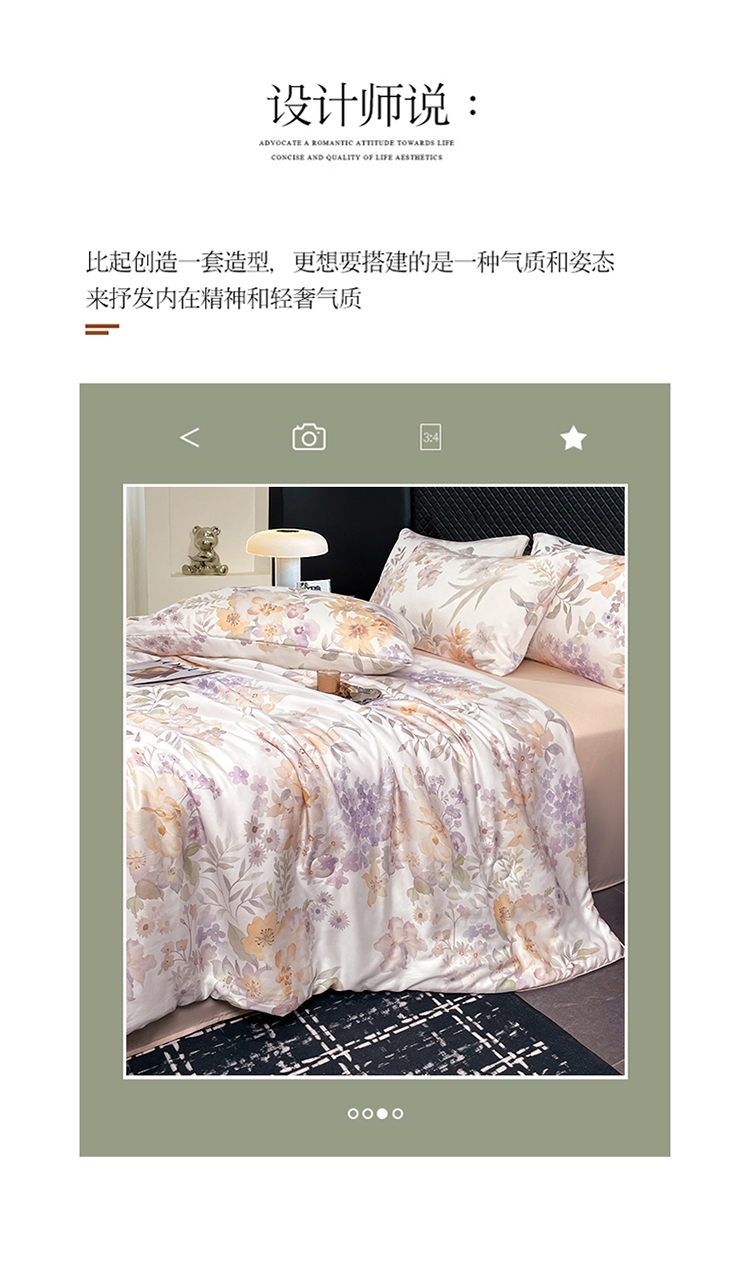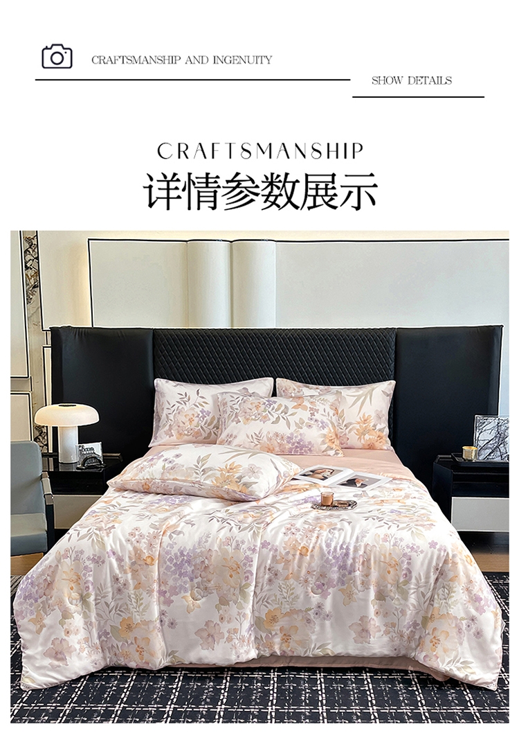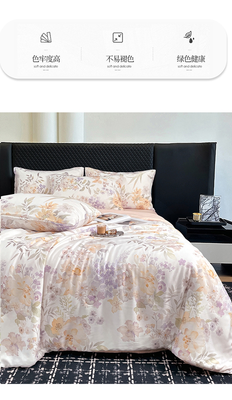 采用亲肤的莱赛尔材质,柔软触感。;蚕蛹蛋白抗菌纤维填充,舒适环保。;新一代印染工艺,色牢度高,不易褪色,色彩靓丽。