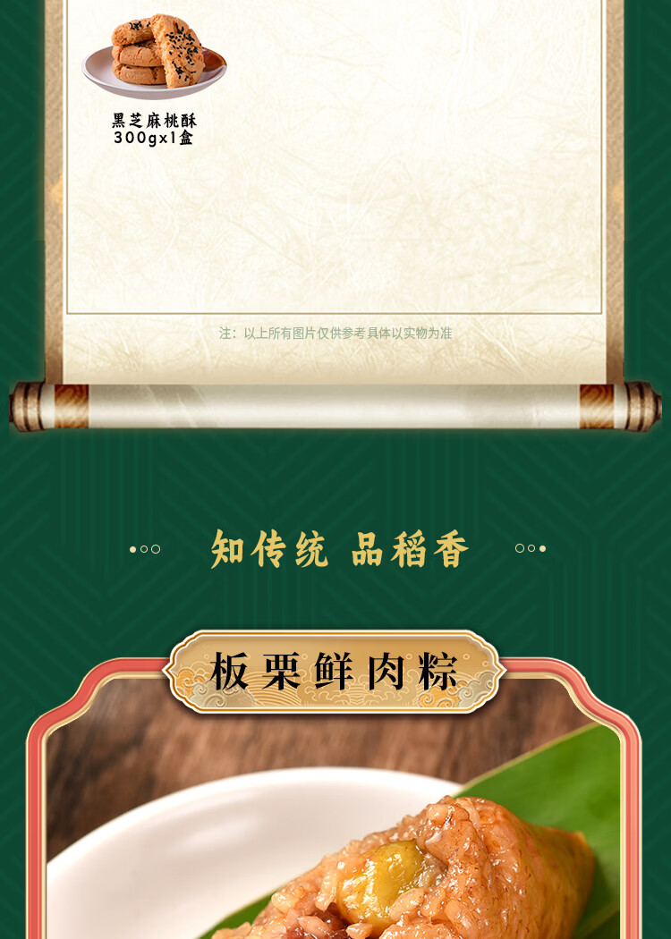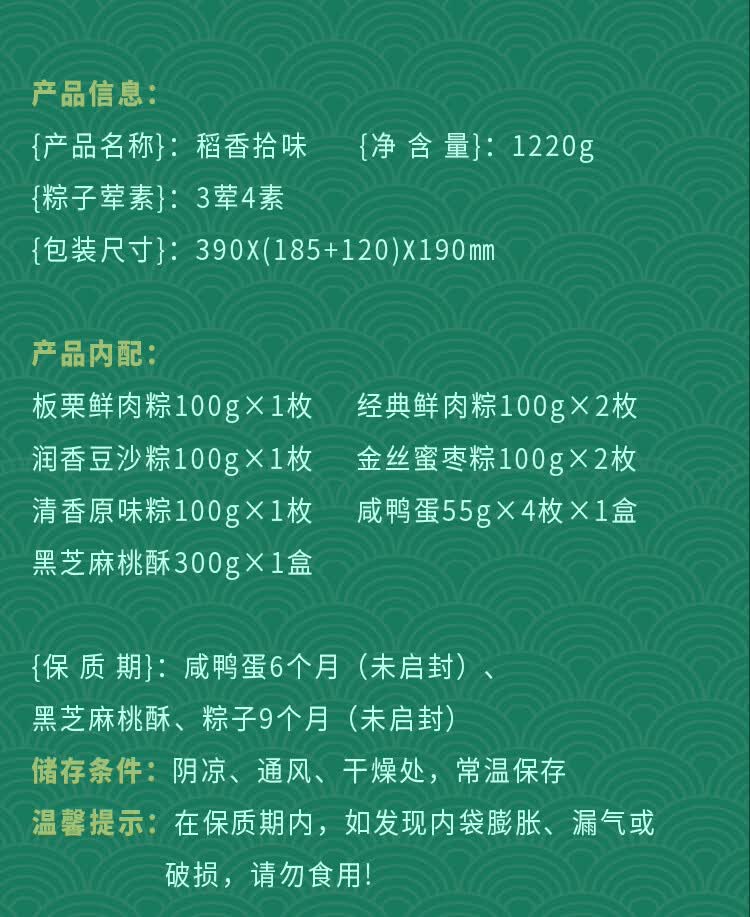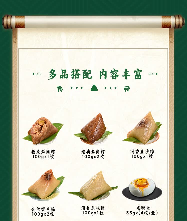 配置:板栗鲜肉粽100g*1枚 经典鲜肉粽100g*2枚 润香豆沙粽100g*1枚 金丝蜜枣粽100g*2枚 清香原味粽100g*1枚 黑芝麻桃酥300g*1盒 咸鸭蛋55g*4枚*1盒