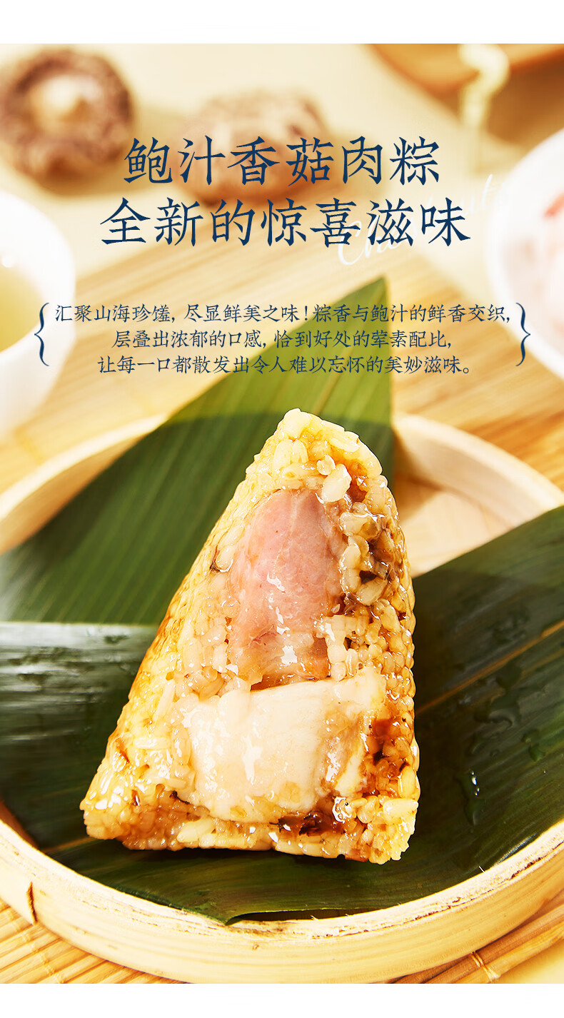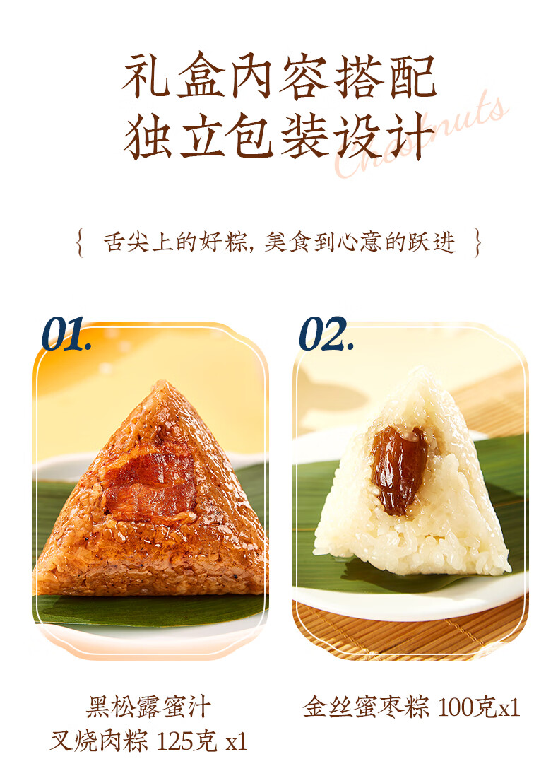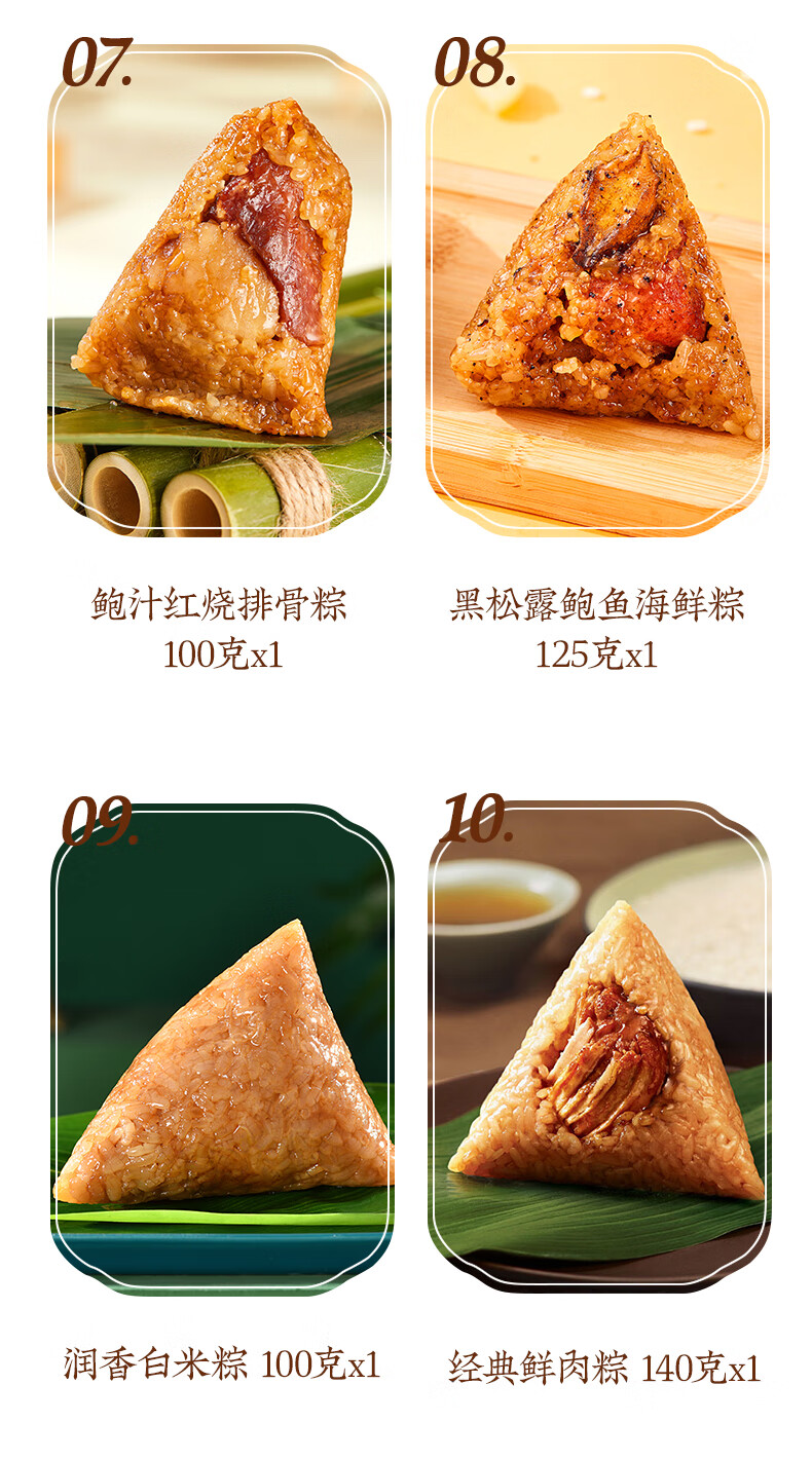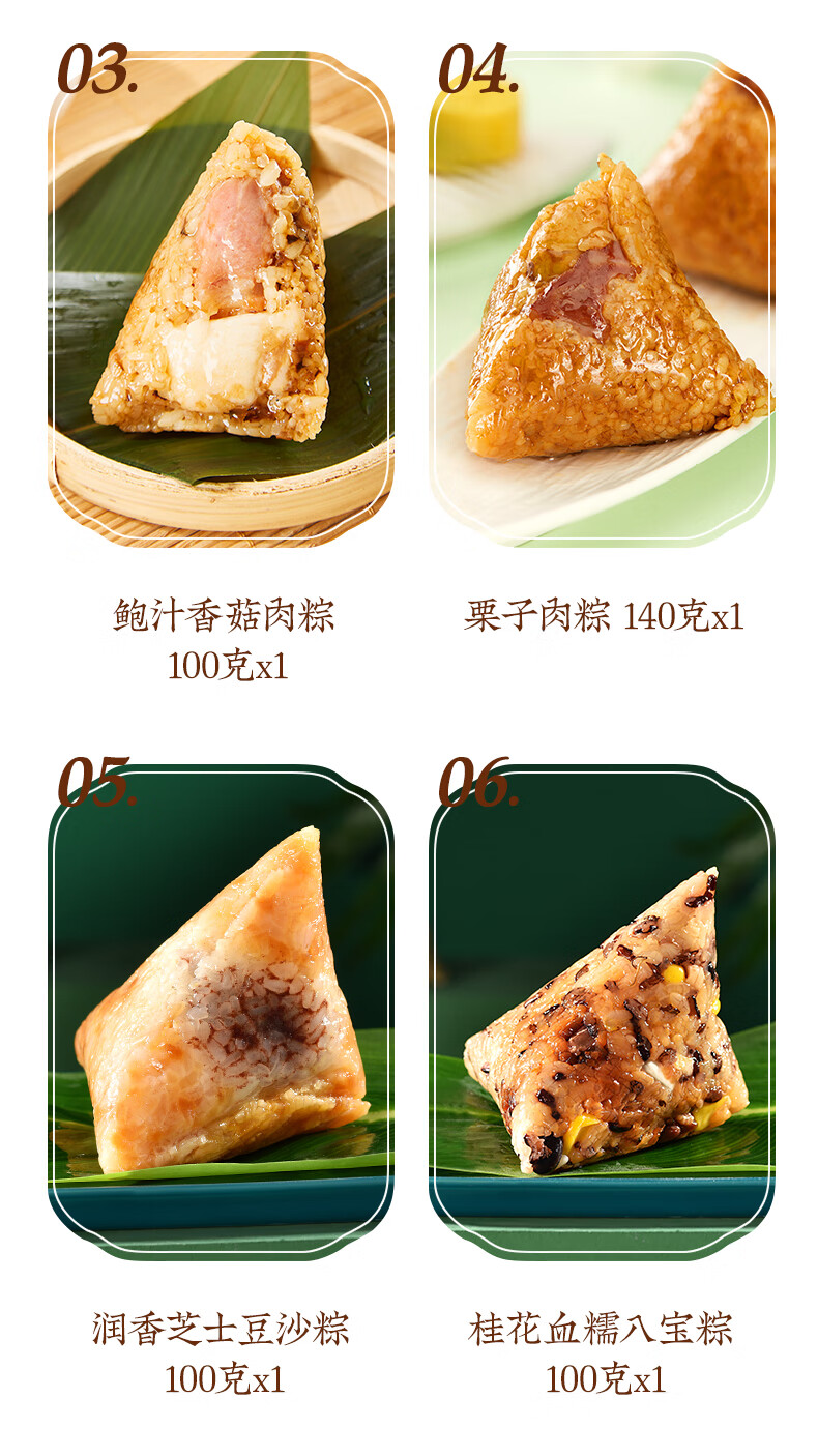 配置:栗子肉粽140gx1 鲍汁红烧排骨粽100gx1 经典鲜肉粽140gx1 鲍汁香菇肉粽100gx1 黑松露鲍鱼海鲜粽125gx1 黑松露蜜汁叉烧肉粽125gx1 润香芝士豆沙粽100gx1 桂花血糯八宝粽100gx1 金丝蜜枣粽100gx1 润香白米粽100gx1 海鸭咸蛋60gx6 玫瑰青柠芝士冰沙绿豆糕50gx3 玫瑰香草慕斯冰沙绿豆糕50gx3