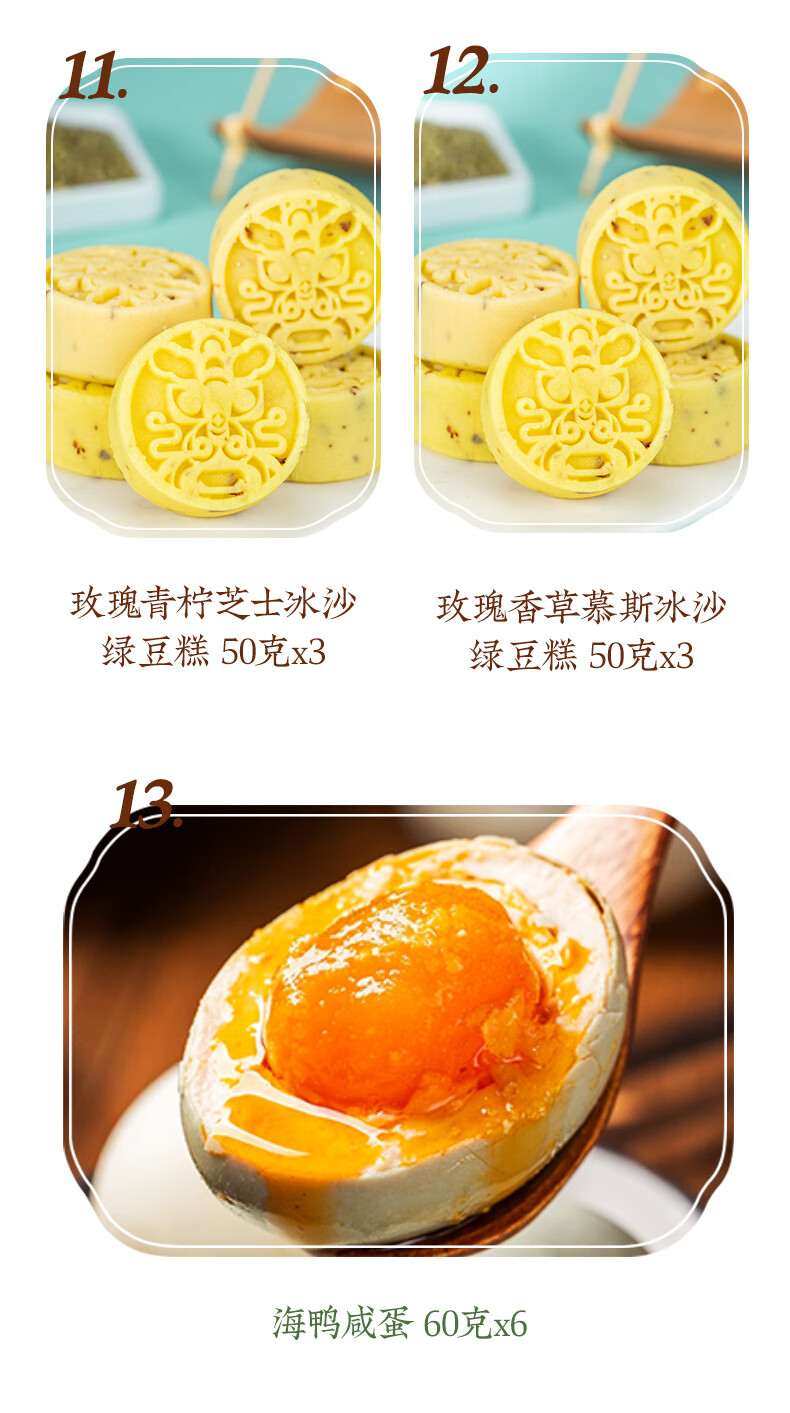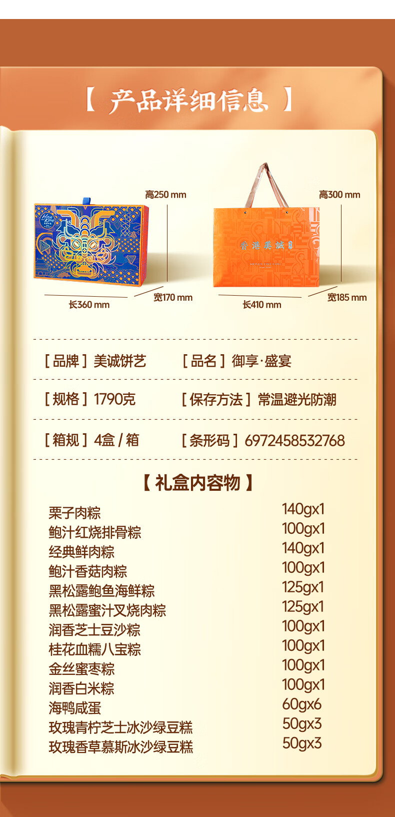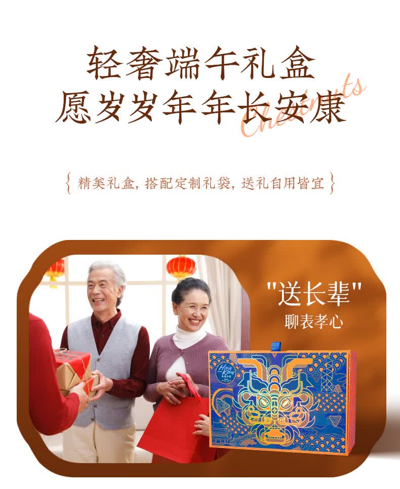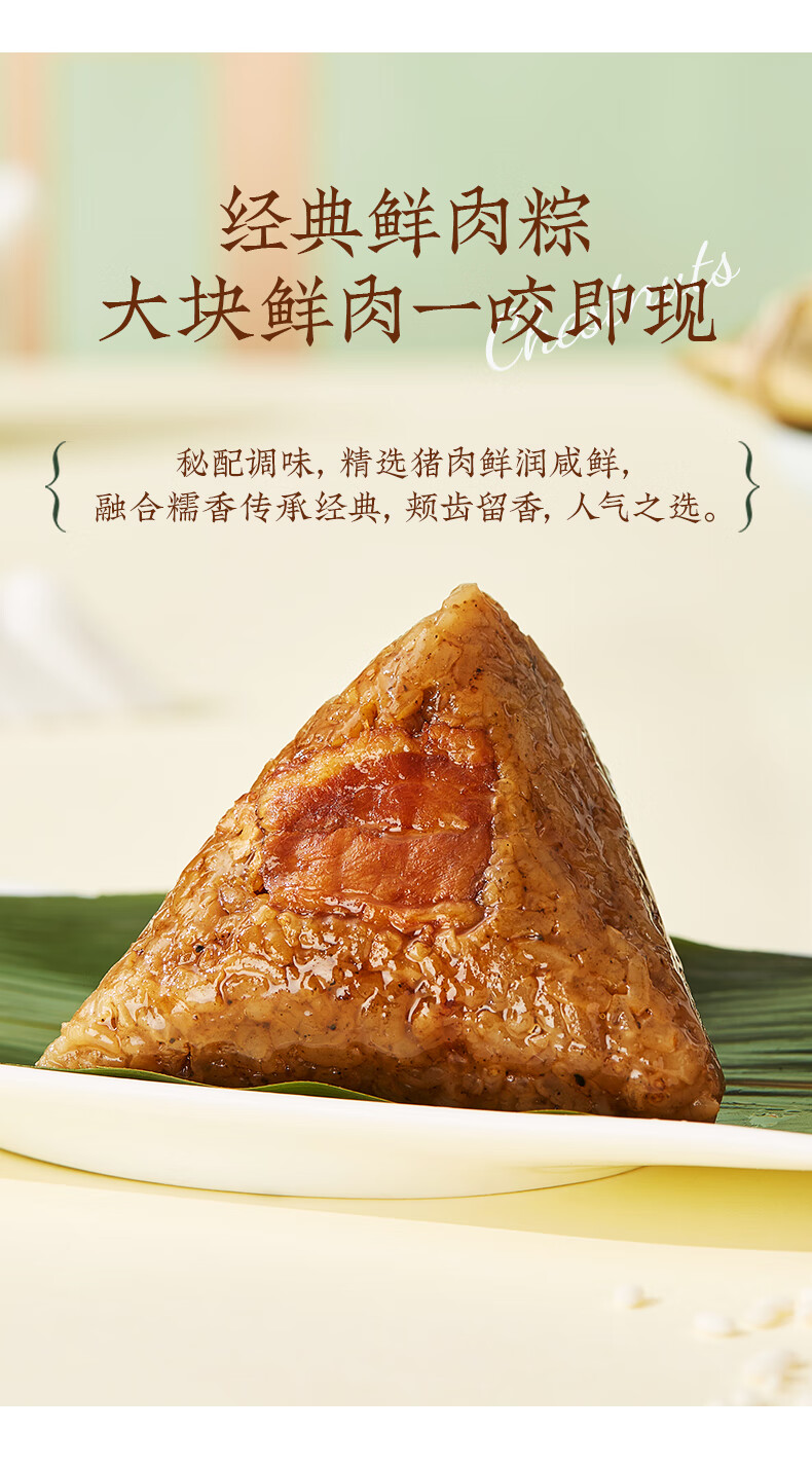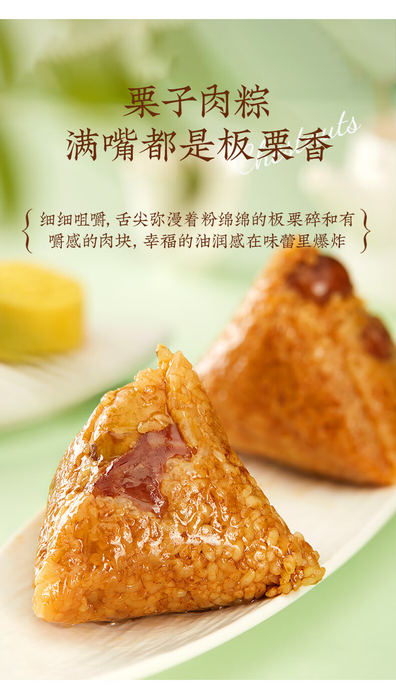 配置:栗子肉粽140gx1 鲍汁红烧排骨粽100gx1 经典鲜肉粽140gx1 鲍汁香菇肉粽100gx1 黑松露鲍鱼海鲜粽125gx1 黑松露蜜汁叉烧肉粽125gx1 润香芝士豆沙粽100gx1 桂花血糯八宝粽100gx1 金丝蜜枣粽100gx1 润香白米粽100gx1 海鸭咸蛋60gx6 玫瑰青柠芝士冰沙绿豆糕50gx3 玫瑰香草慕斯冰沙绿豆糕50gx3
