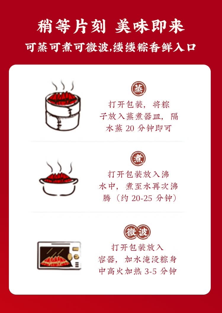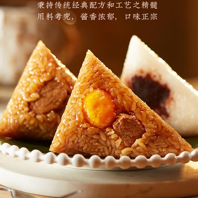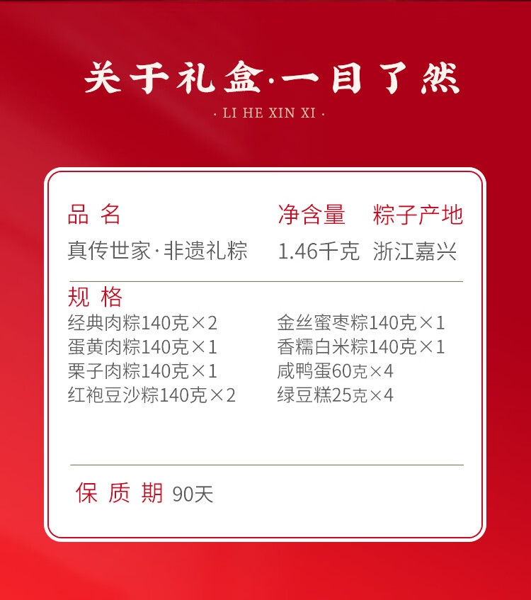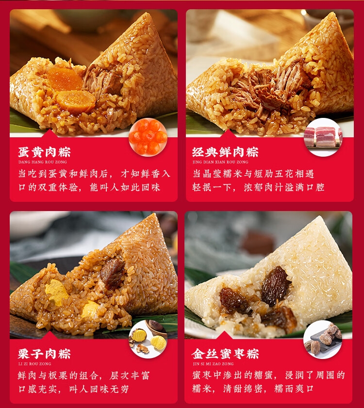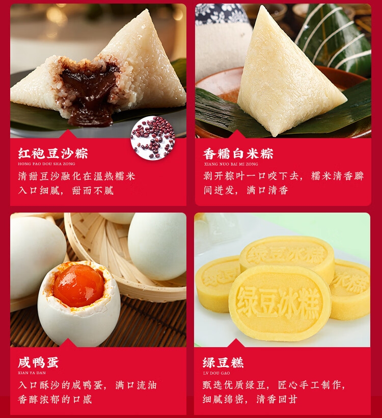 配置:经典肉粽140克*1只/袋*2袋 蛋黄肉粽140克*1只/袋*1袋 栗子肉粽140克*1只/袋*1袋 红袍豆沙粽140克*1只/袋*2袋 金丝蜜枣粽140克*1只/袋*1袋 香糯白米粽140克*1只/袋*1袋 咸鸭蛋60g*4 绿豆糕25g*4
