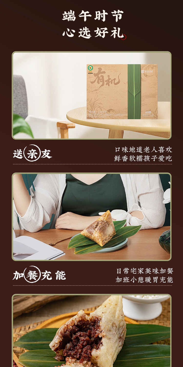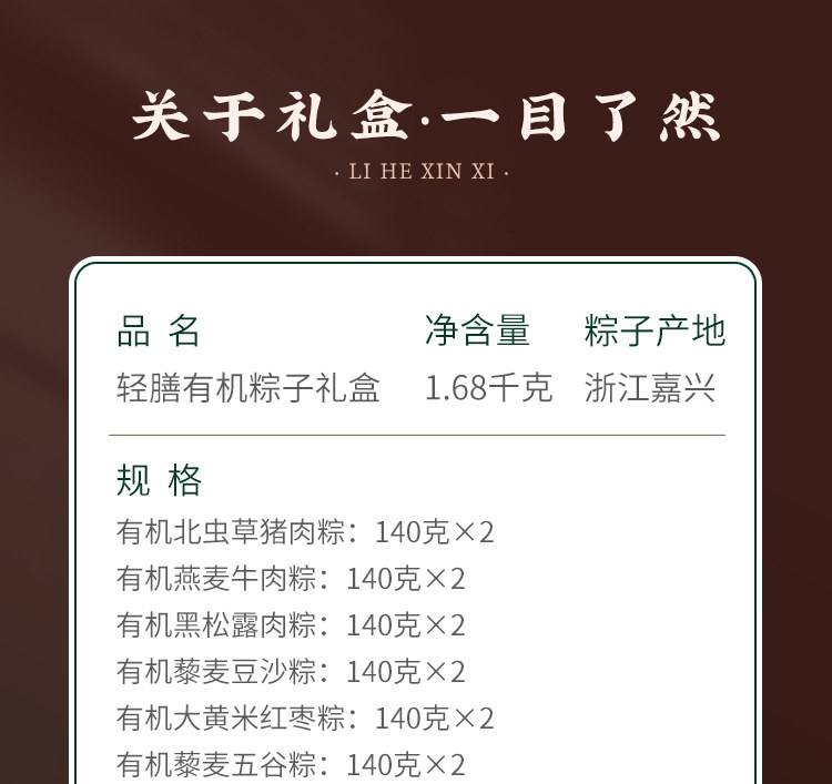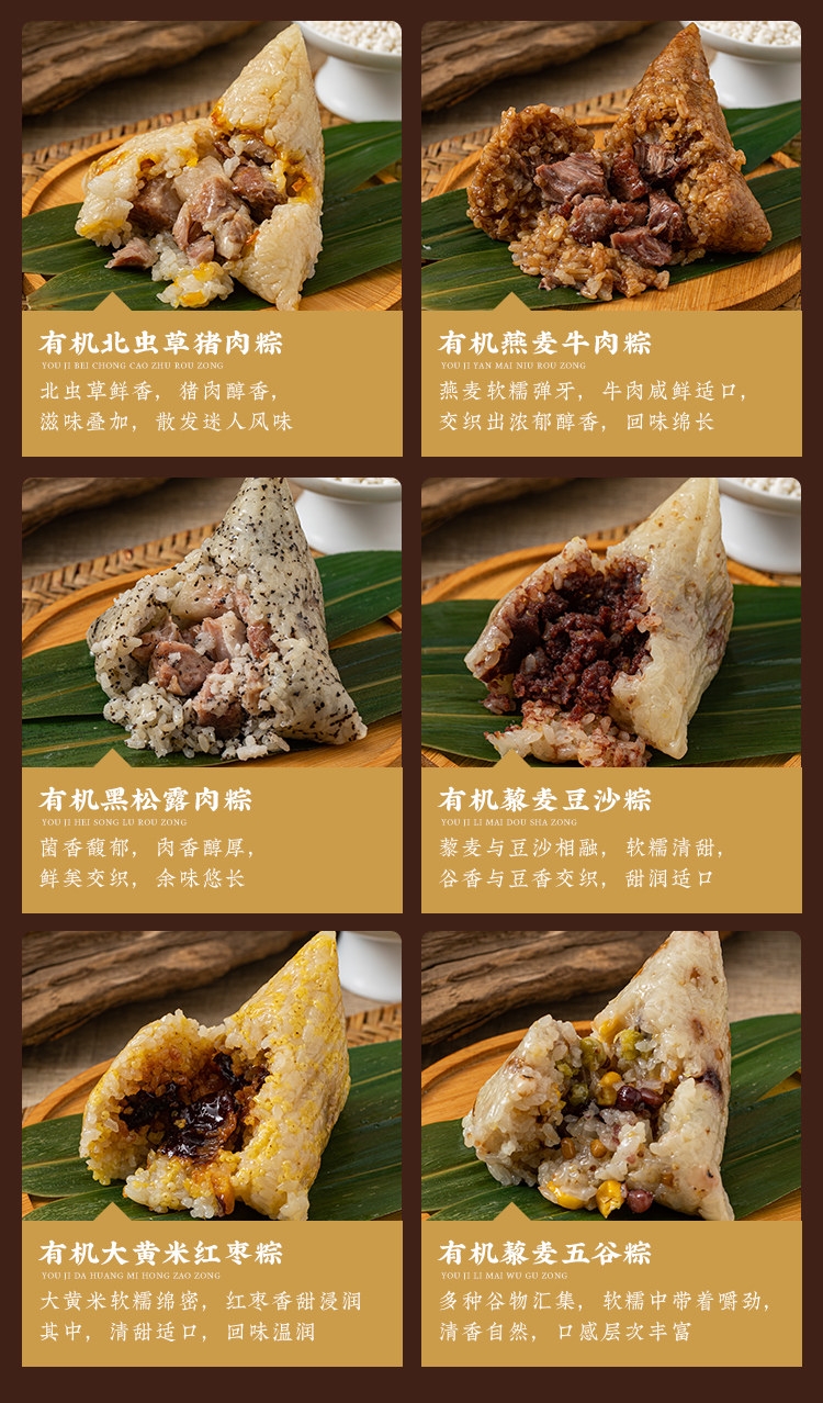 配置:有机北虫草猪肉粽:140克*1只/袋*2袋 有机燕麦牛肉粽:140克*1只/袋*2袋 有机黑松露肉粽:140克*1只/袋*2袋 有机藜麦豆沙粽:140克*1只/袋*2袋 有机大黄米红枣粽:140克*1只/袋*2袋 有机藜麦五谷粽:140克*1只/袋*2袋