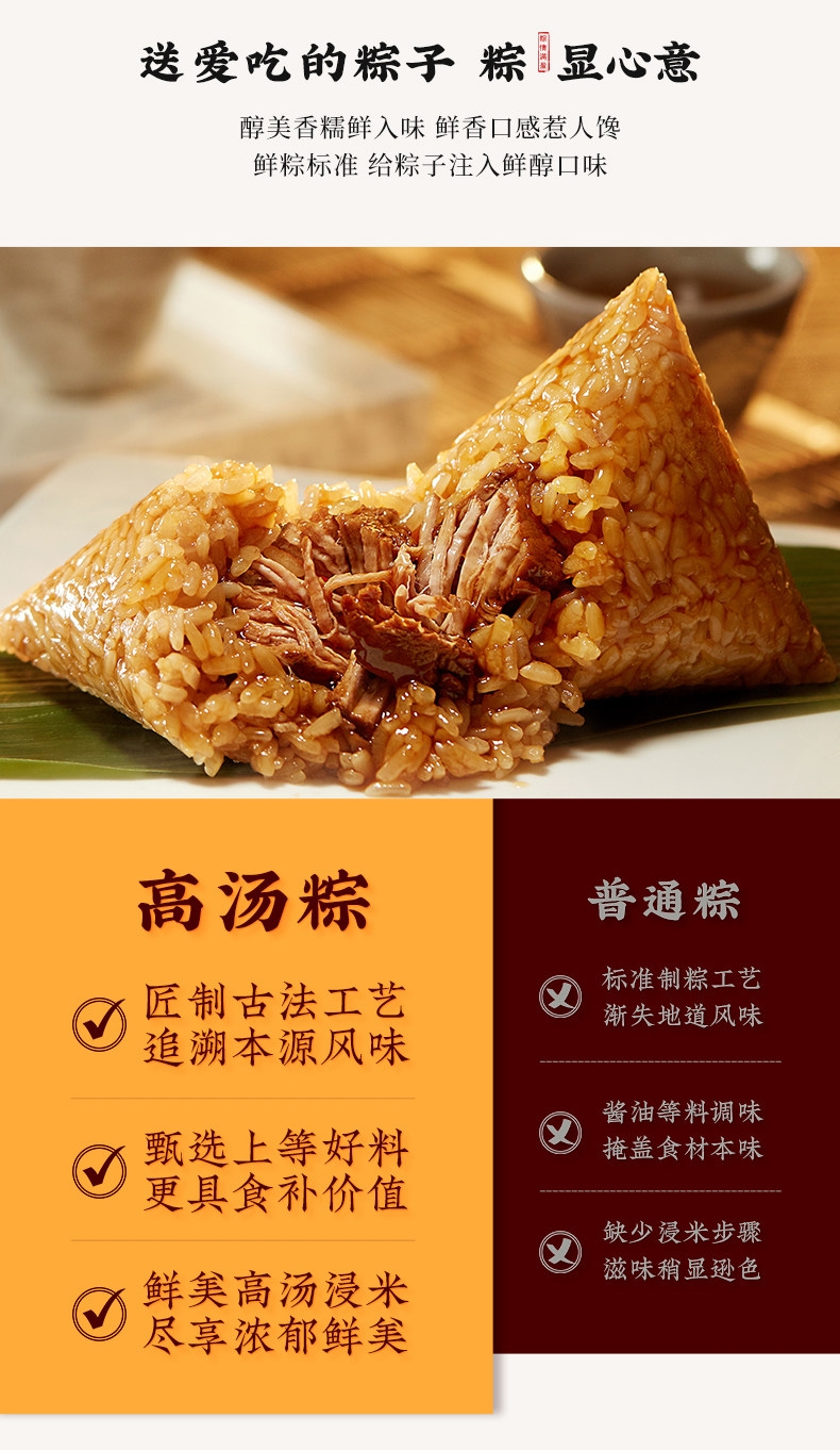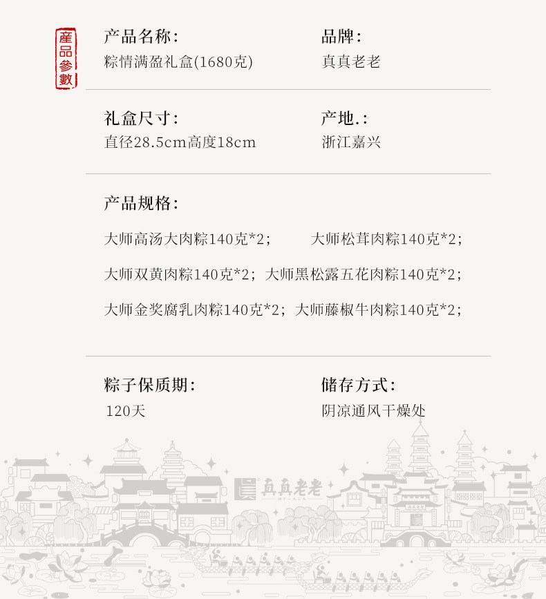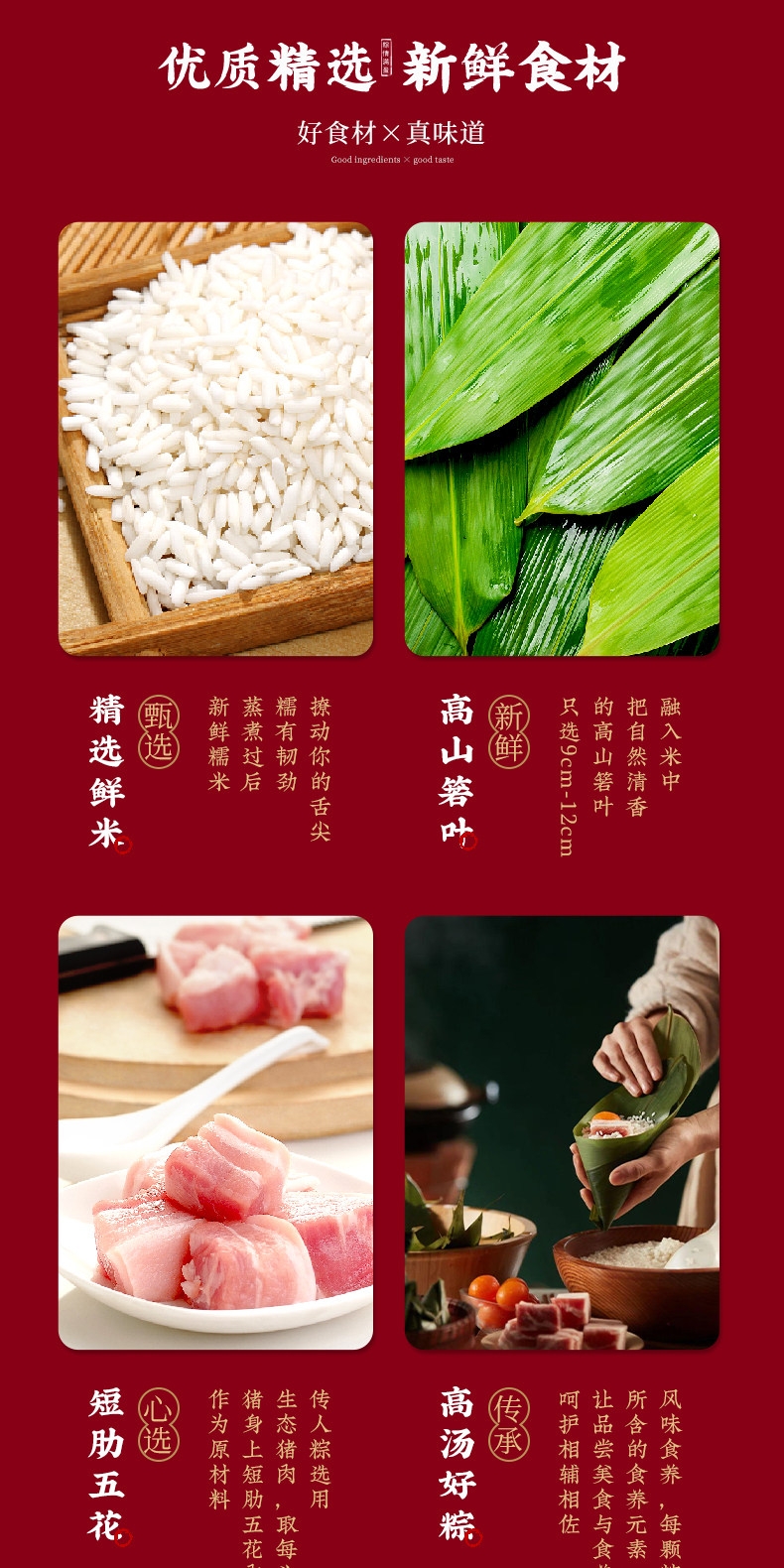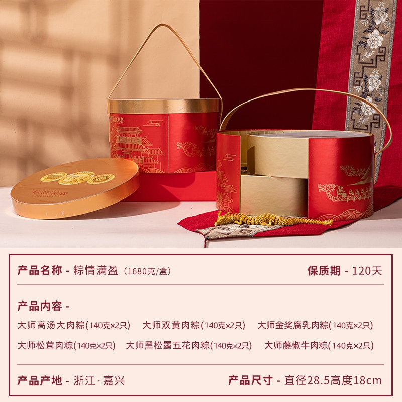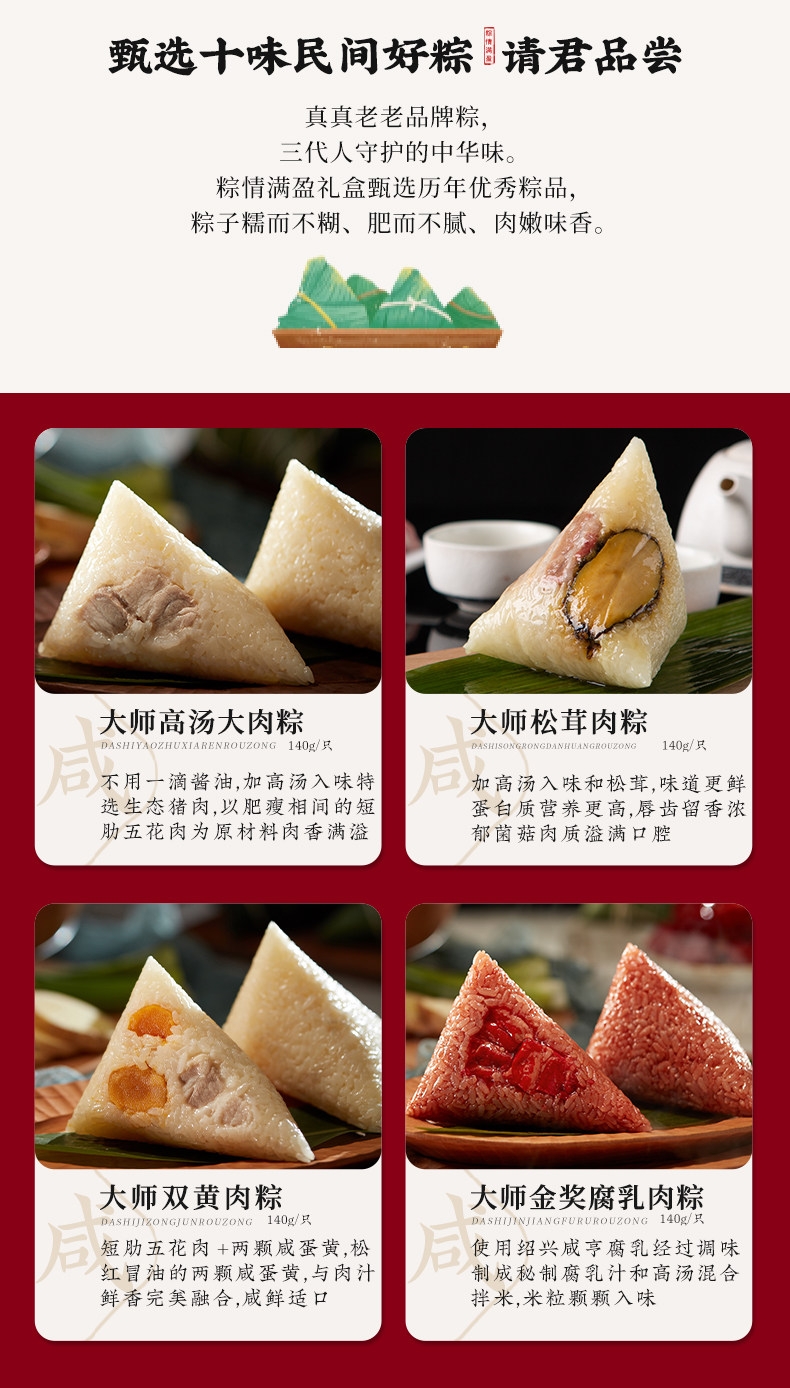 配置:传人高汤大肉粽: 140克*1只/袋 *2袋 传人双黄肉粽: 140克*1只/袋 *2袋 传人腐乳肉粽:140克*1只/袋*2袋 传人松茸肉粽:140克*1只/袋*2袋 传人黑松露五花肉粽:140克*1只/袋*2袋 传人藤椒牛肉粽: 140克*1只/袋*2袋