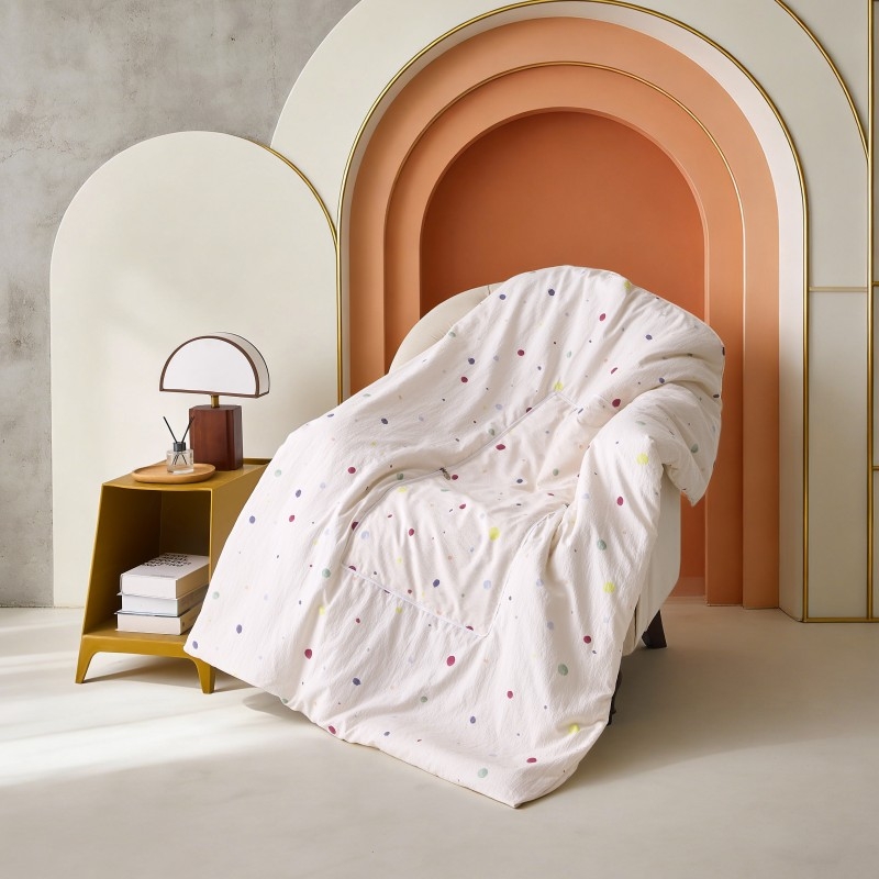 色牢度高,可机洗水洗;一枕多用,午睡毯、空调被;蓬松饱满不易板结,回弹性好;被子多针绗绣包边,整张PP棉填充,可机洗,不跑棉