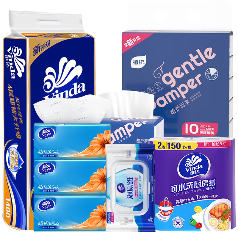 ¥ 102.6四层厚实,亲肤可湿水,厚实柔韧,不易分离。;多层贴合更吸水,擦拭不易破,给足安全感。;多场景使用,快速清洁,散发家居个性氛围。;符合国标九大项目,检测要求,感受洁柔品质呵护。